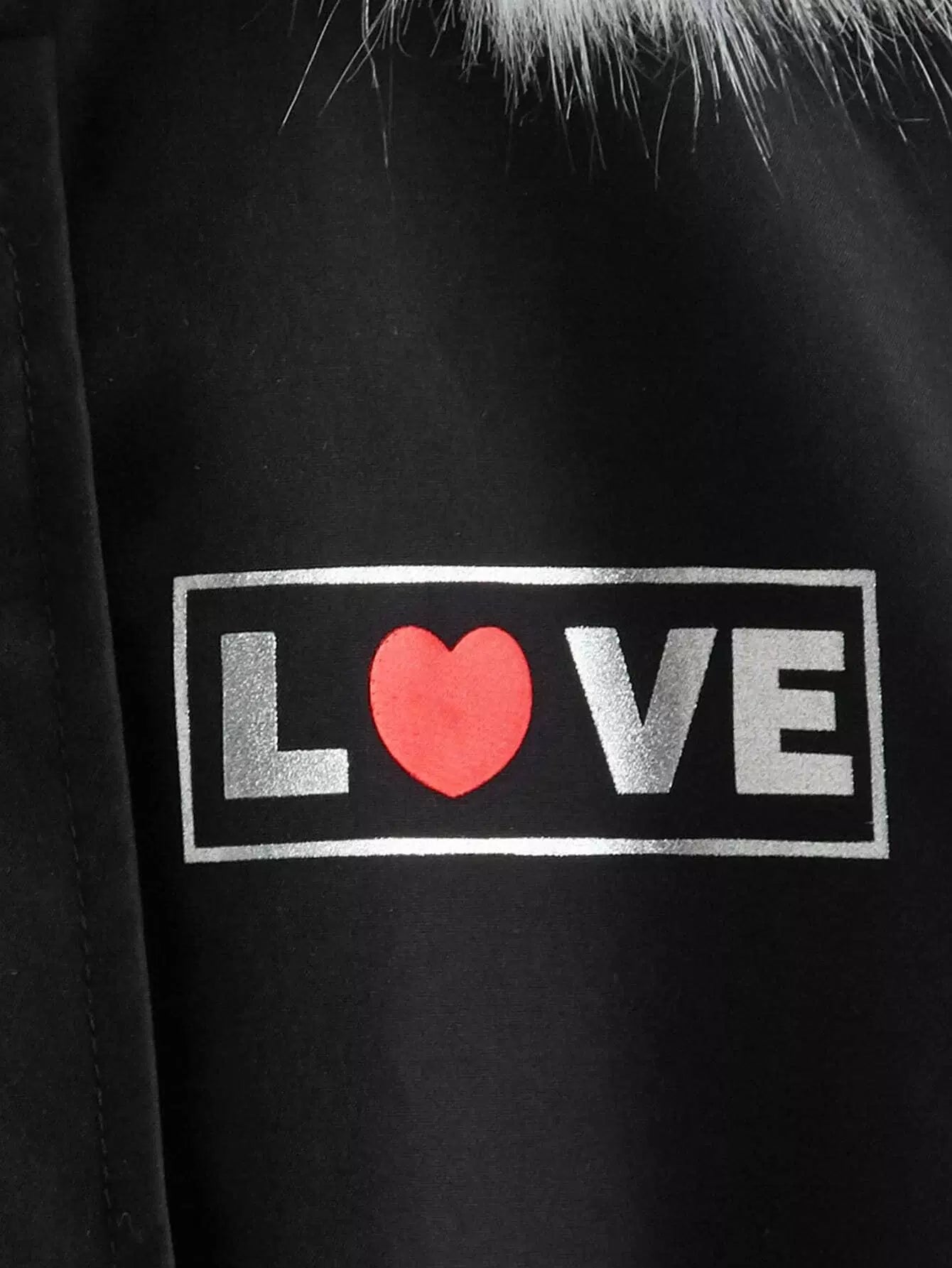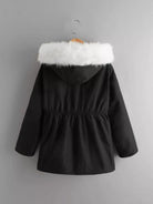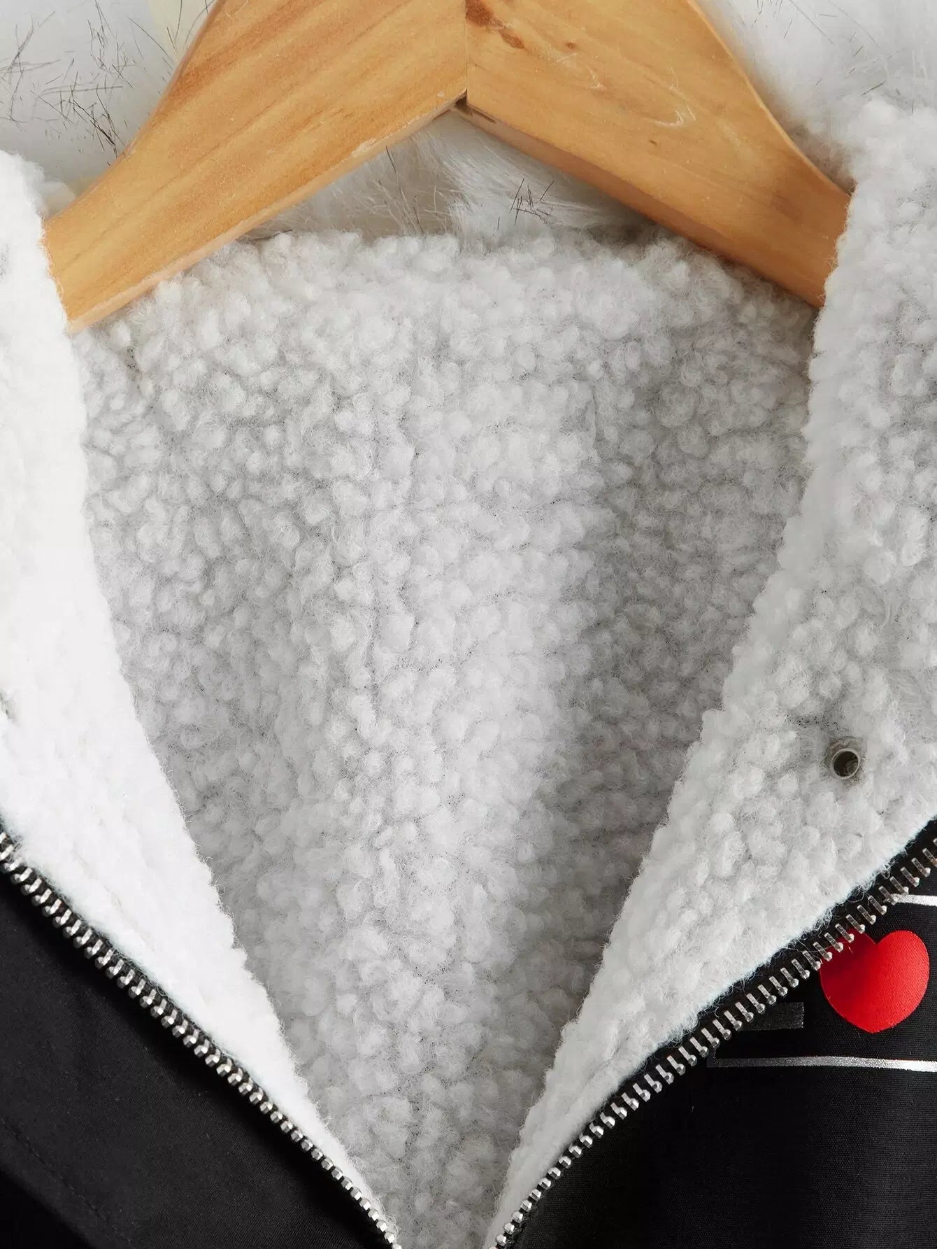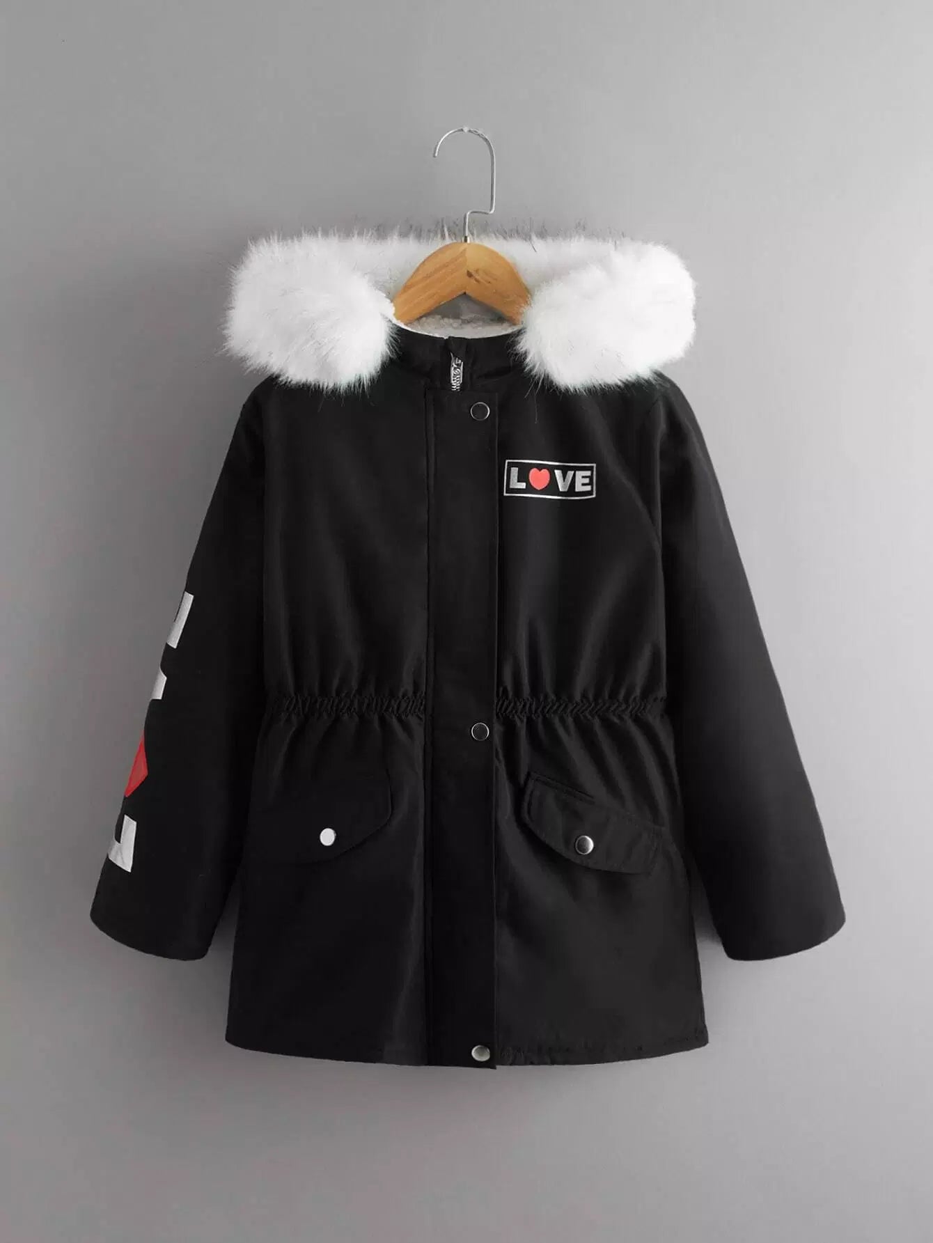 Girls Letter Graphic Fuzzy Trim Hooded Teddy Lined Coat