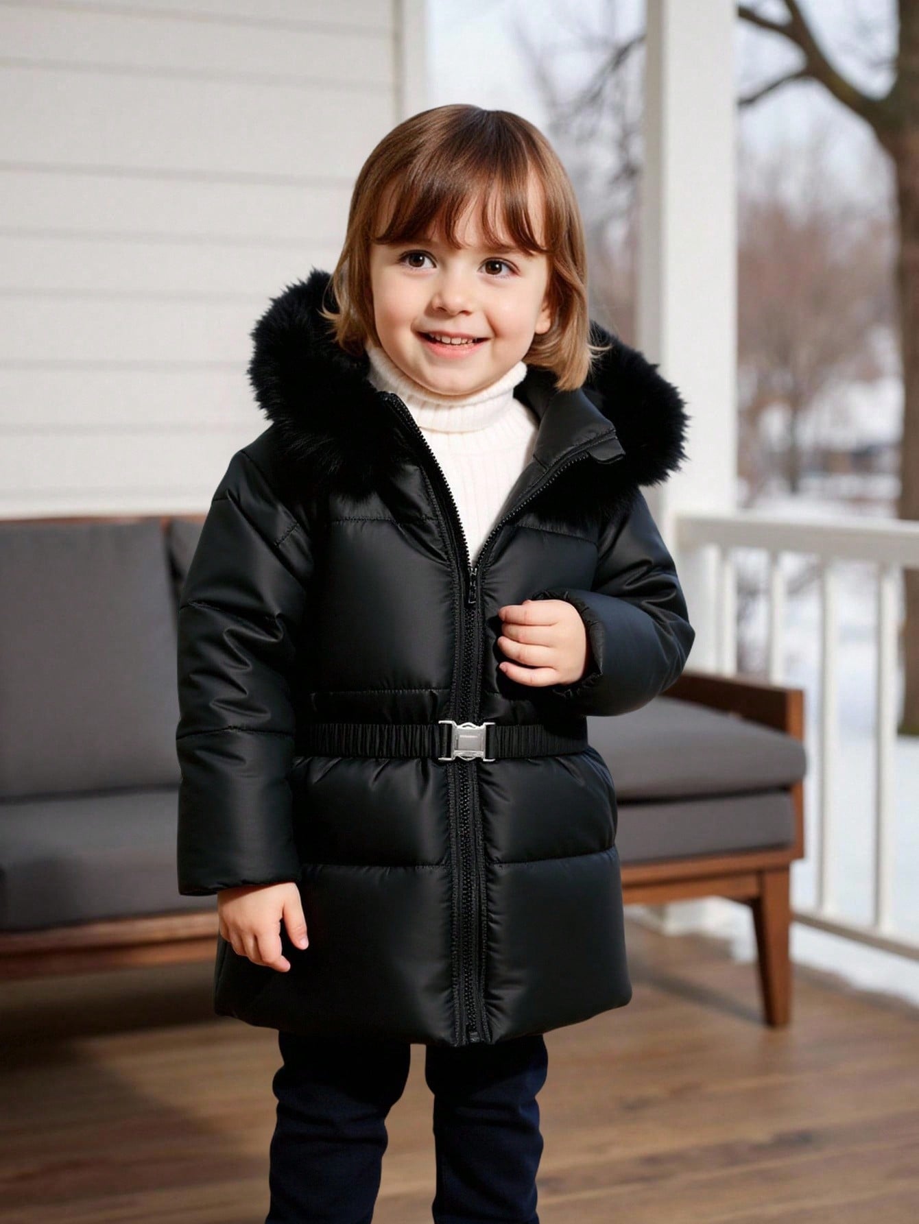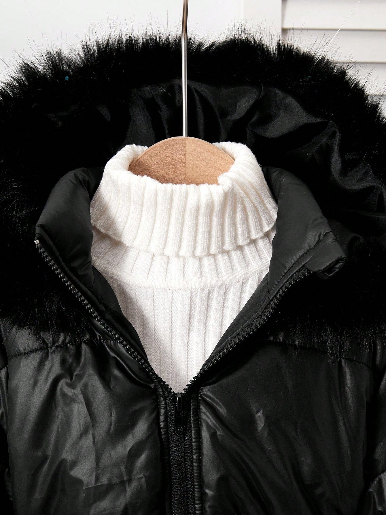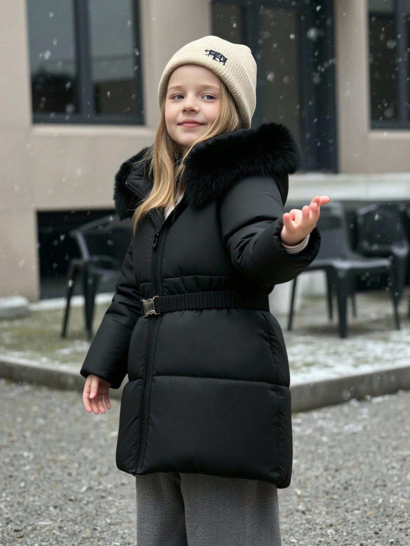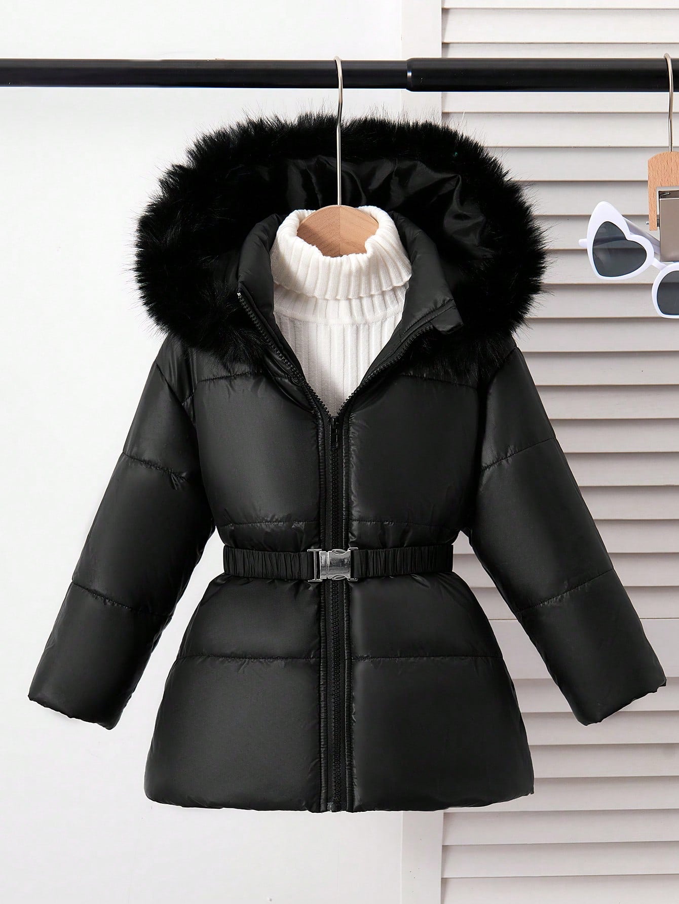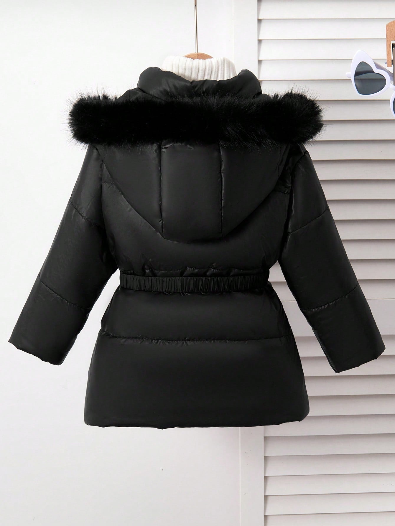 Young Girl's Winter Casual Patchwork Faux Fur Hooded Padded Coat Toddler Girls Winter Coat Without Belt
