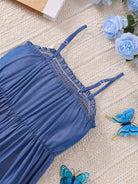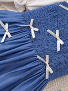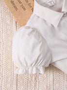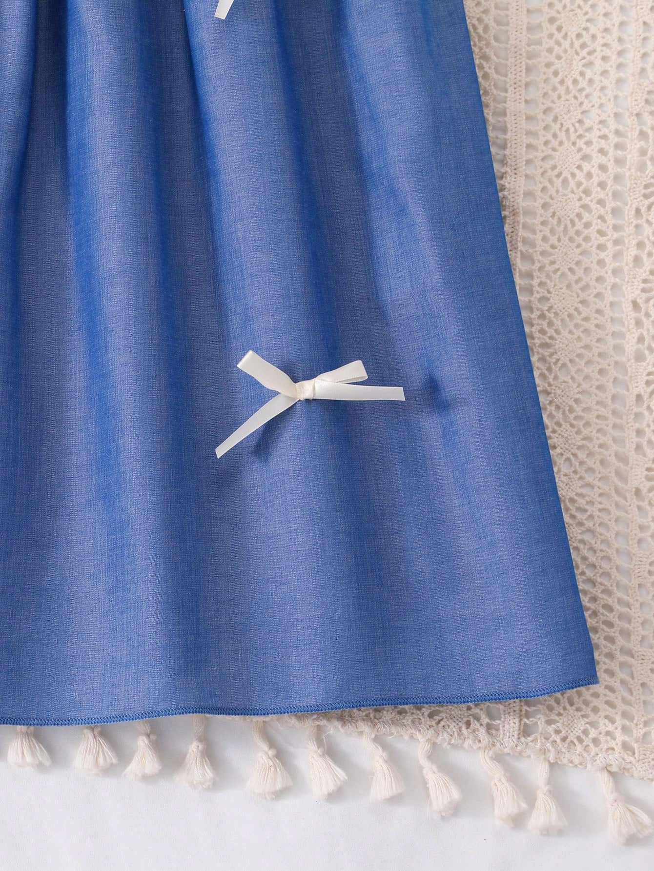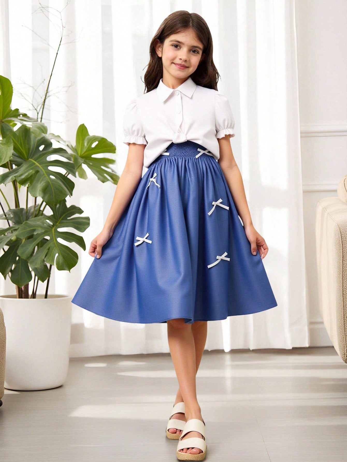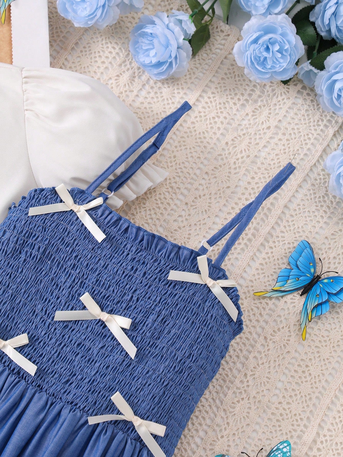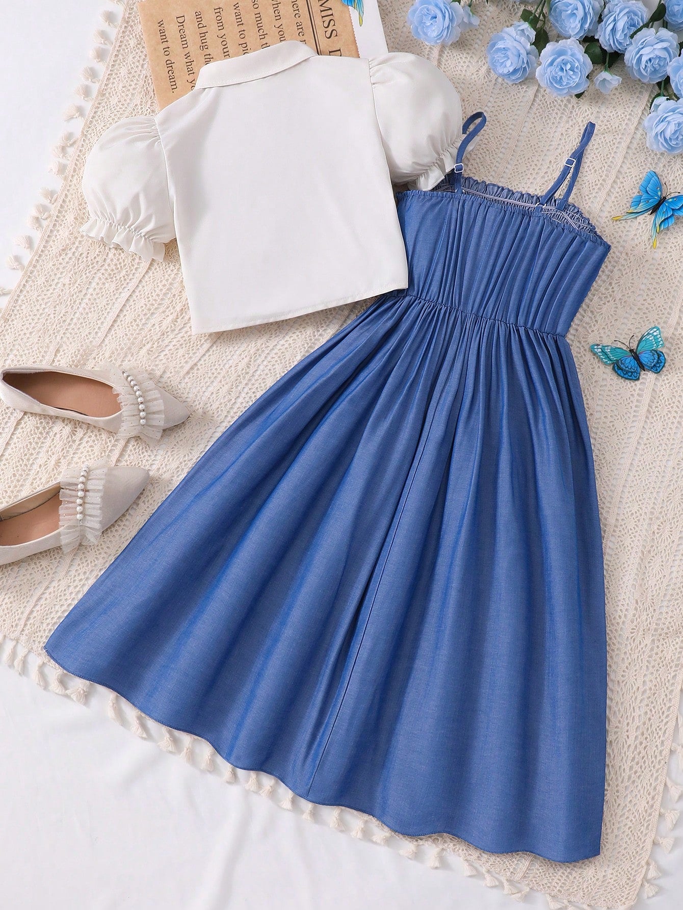 2pcs/Set Teen Girls' White Ruffle Sleeve Blouse Paired With Comfortable Faux Denim Bow Strap Dress, Suitable