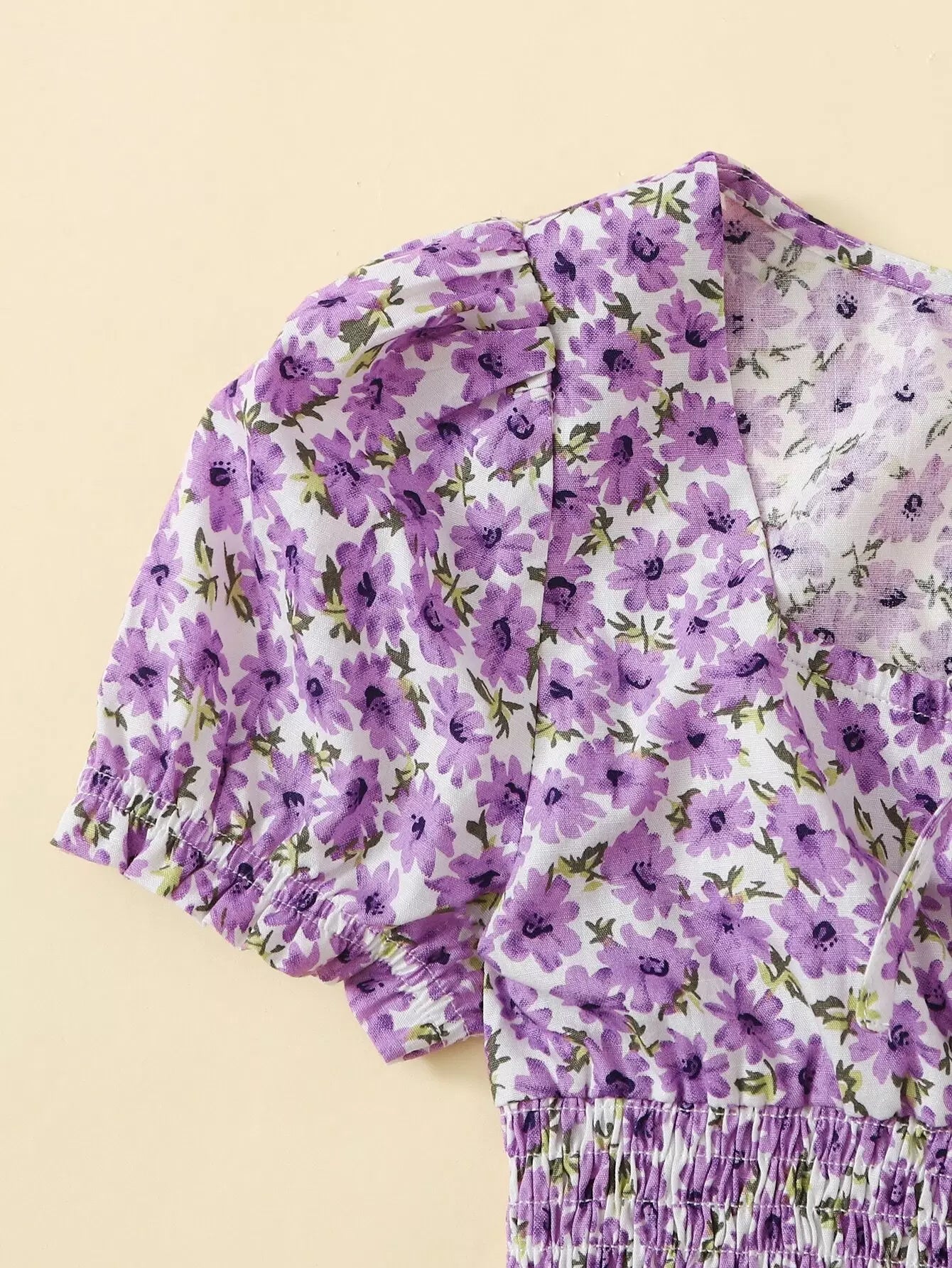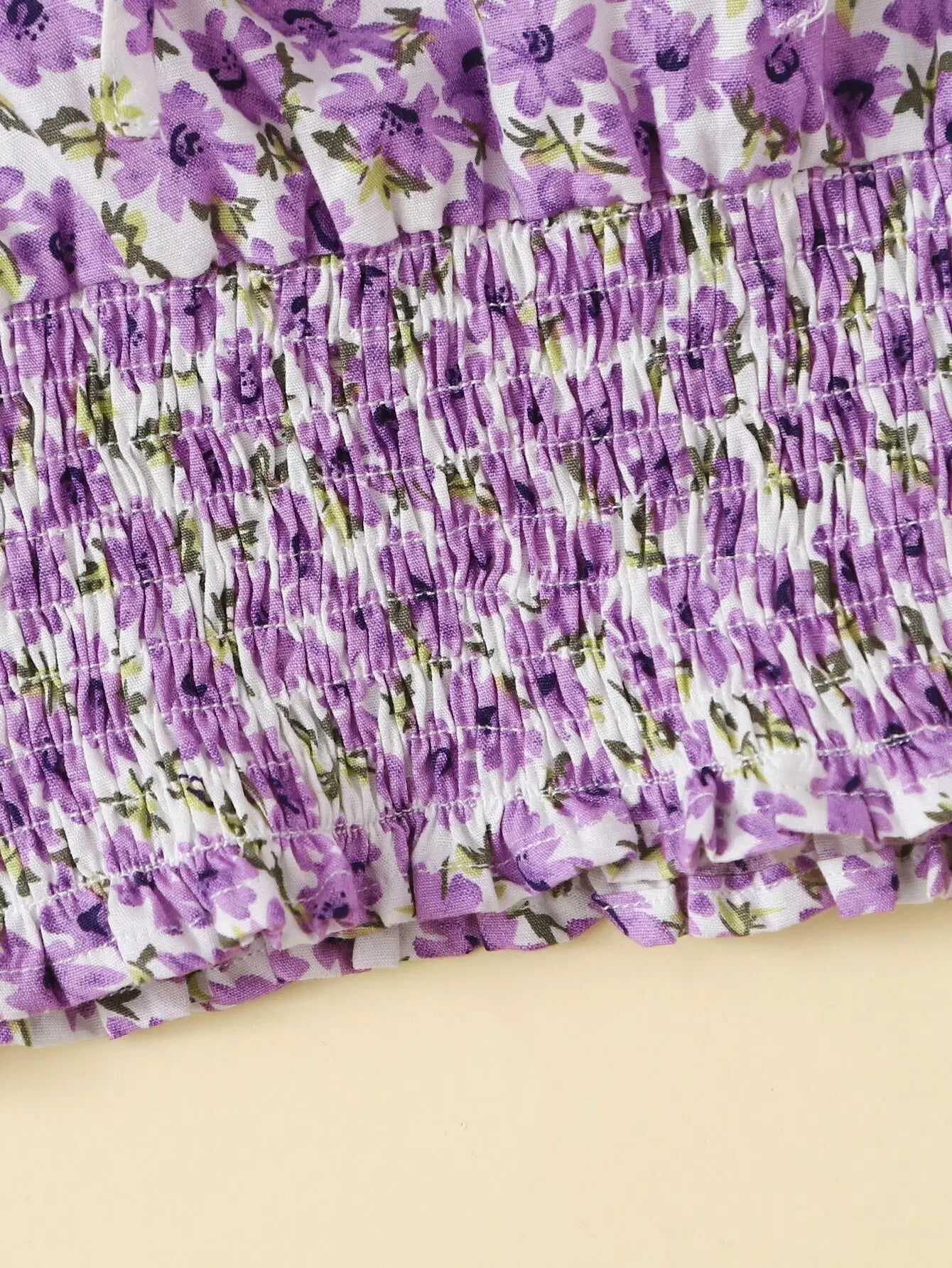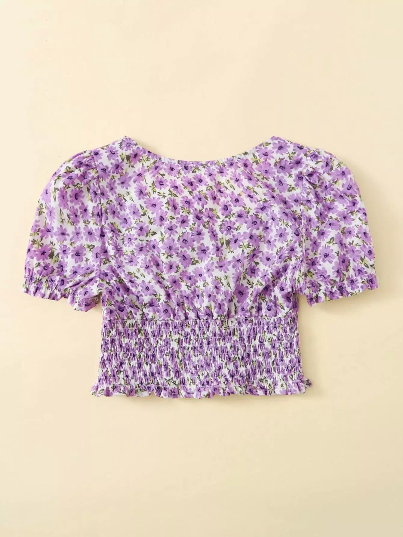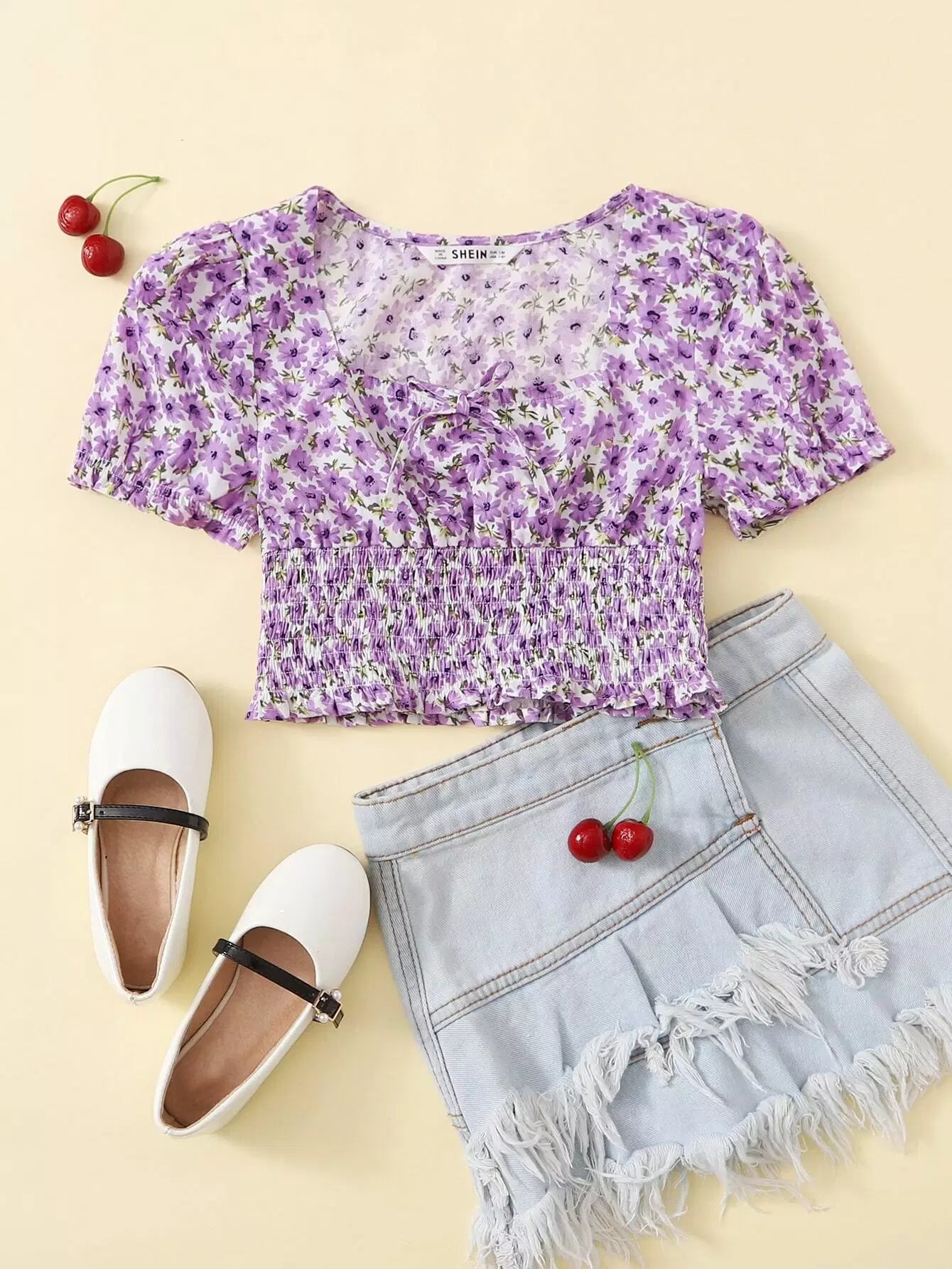 Girls Bow Front Frill Trim Shirred Panel Floral Top