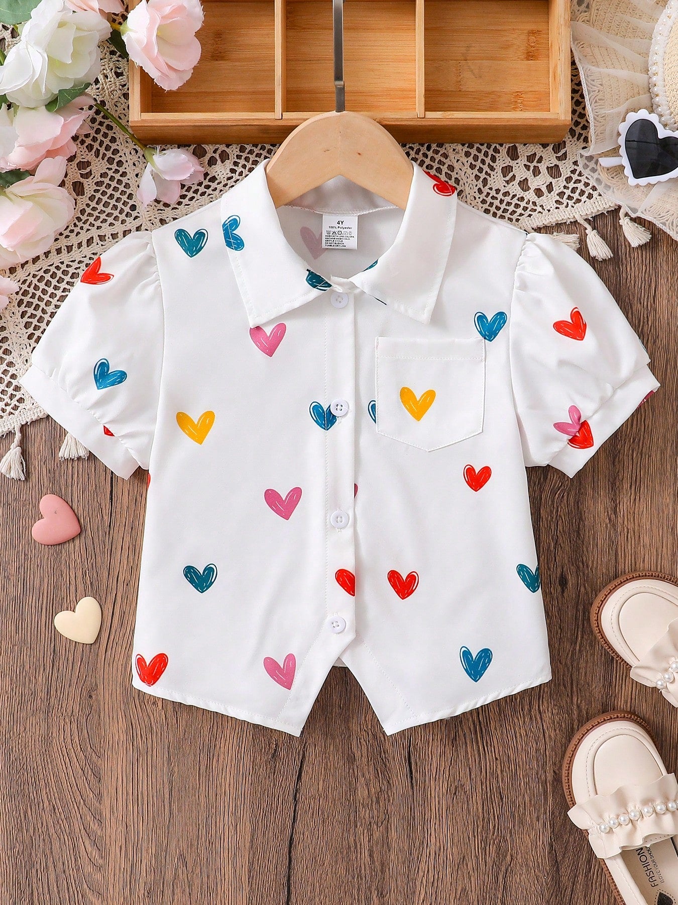 Young Girl Casual Outdoor/Daily Commute Elementary School Sweet Cute Polo Collar Shirt, Heart Print Short