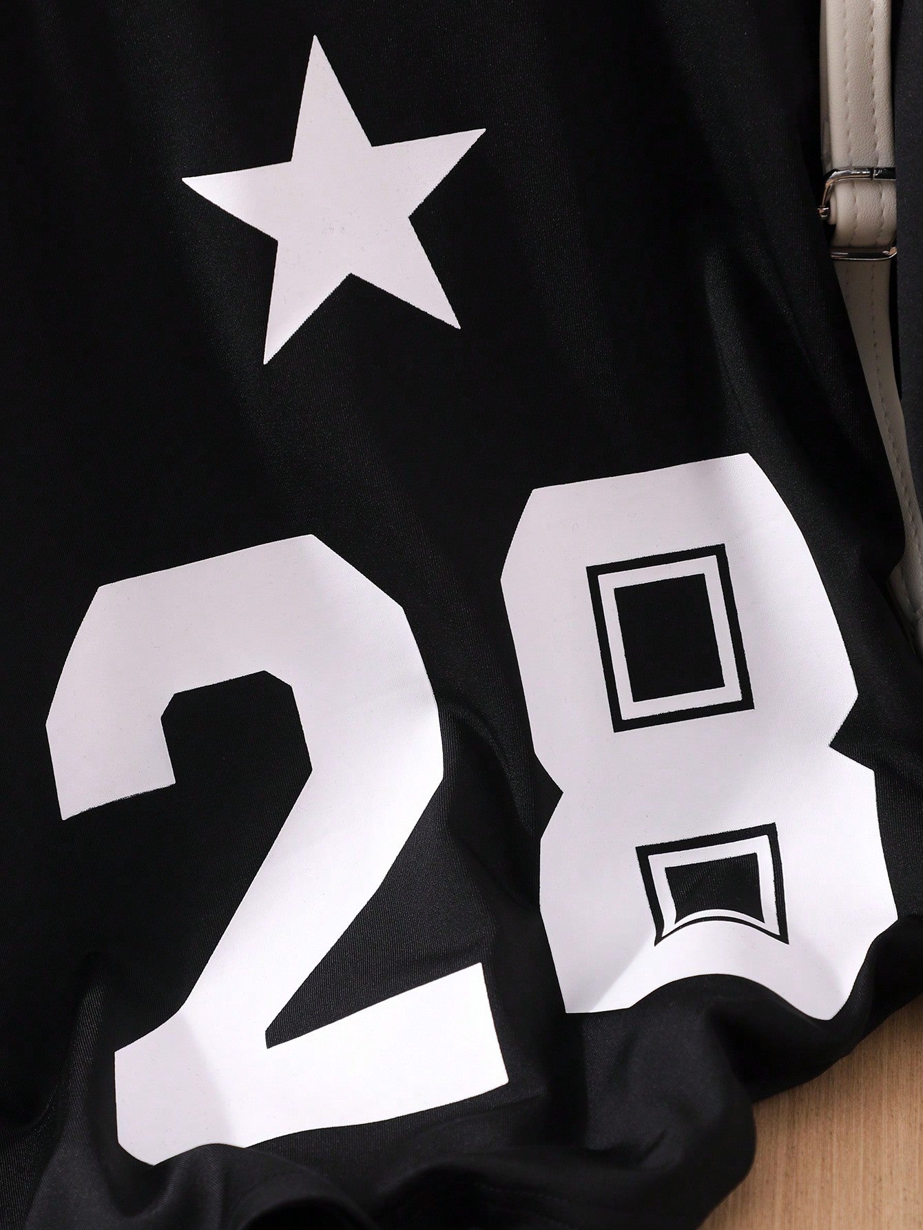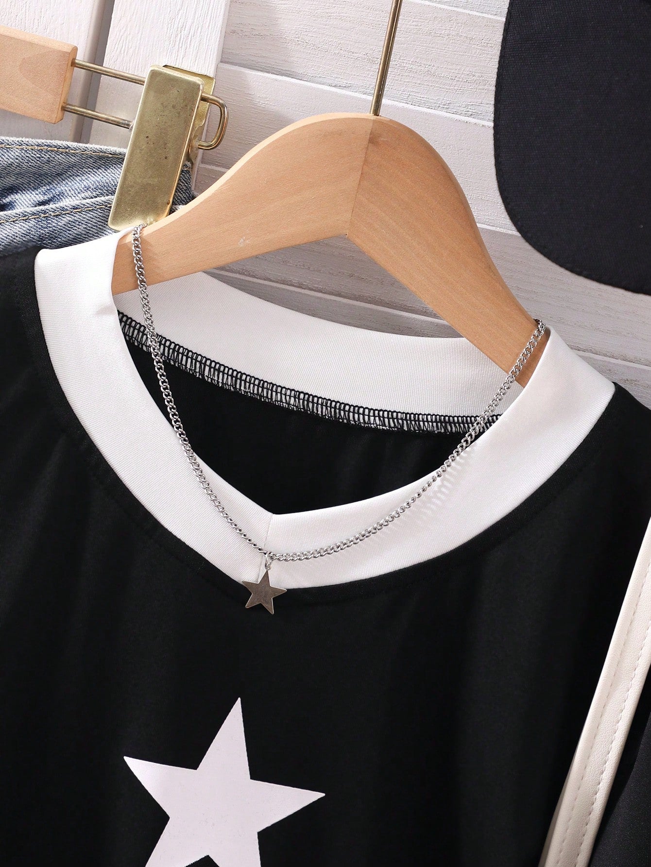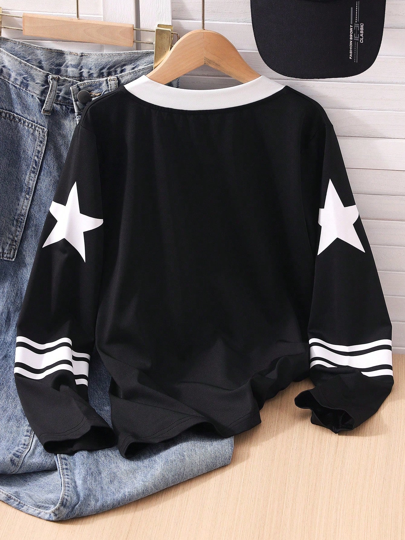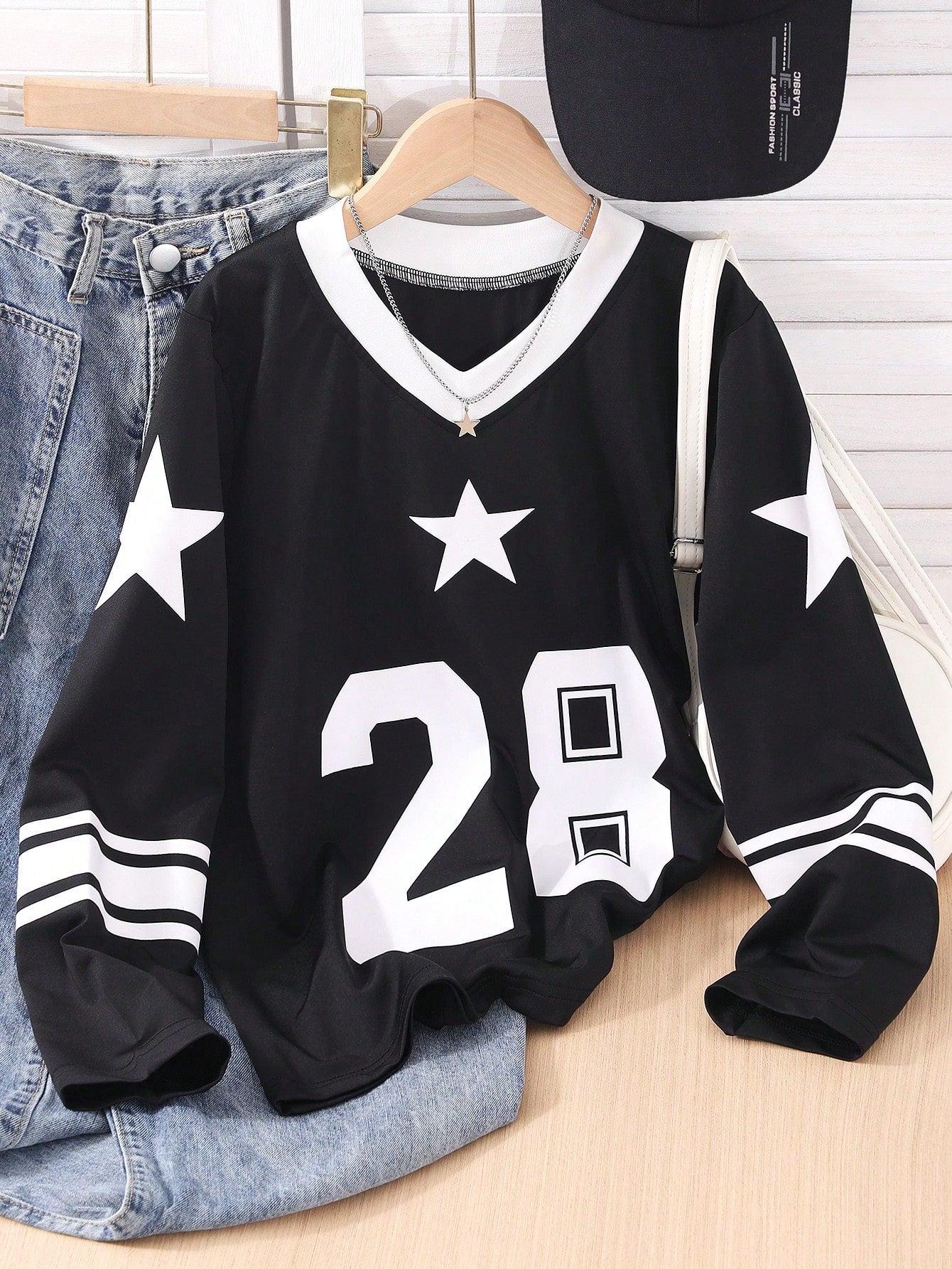 Tween Girls V-Neck Long Sleeve Simple Fashion Casual Daily Five-Pointed Star T-Shirt