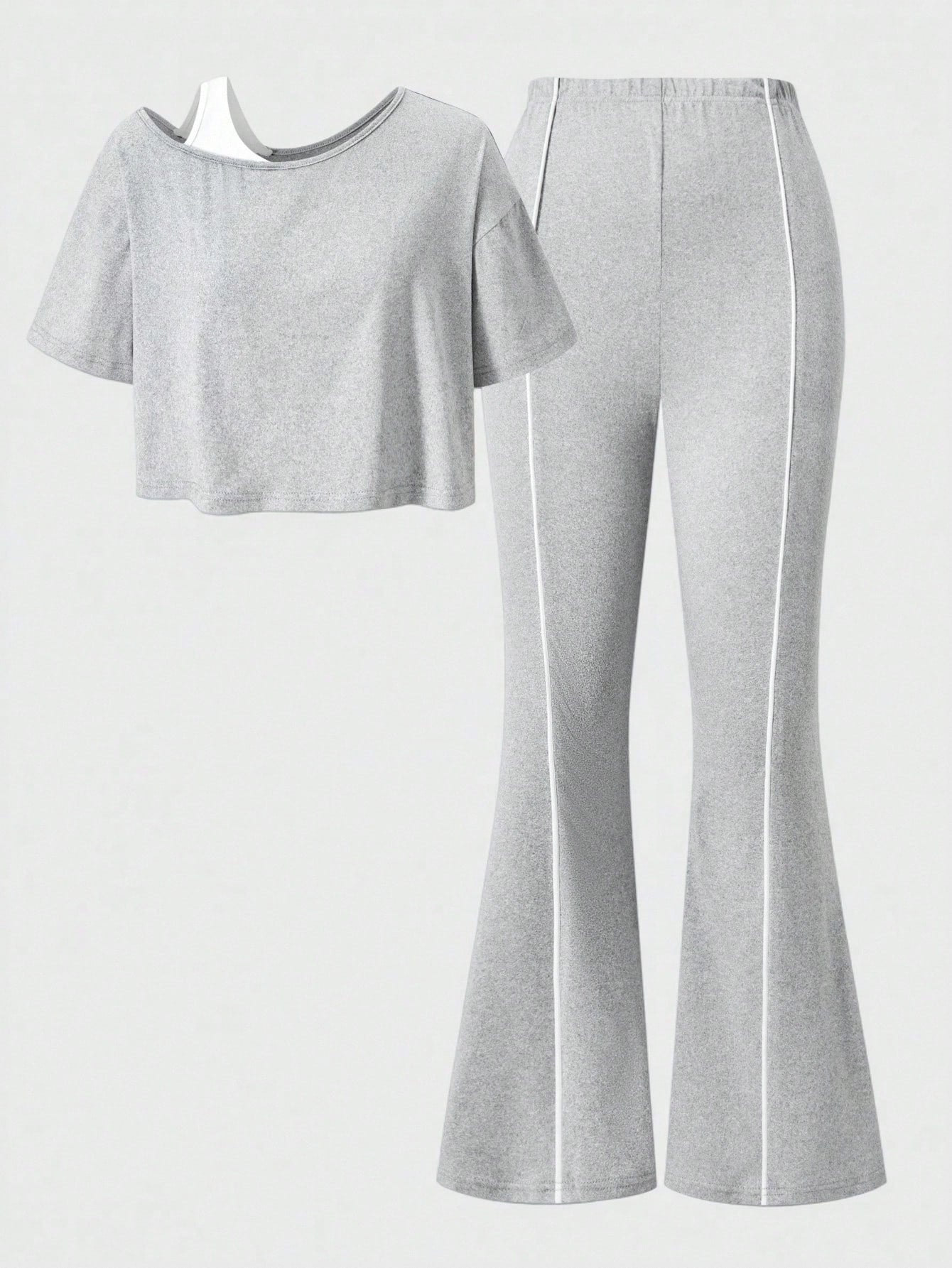 2pcs Set Teen Girls Fashionable Street Style Simple Elegant Comfortable Asymmetrical Shoulder Short Sleeve