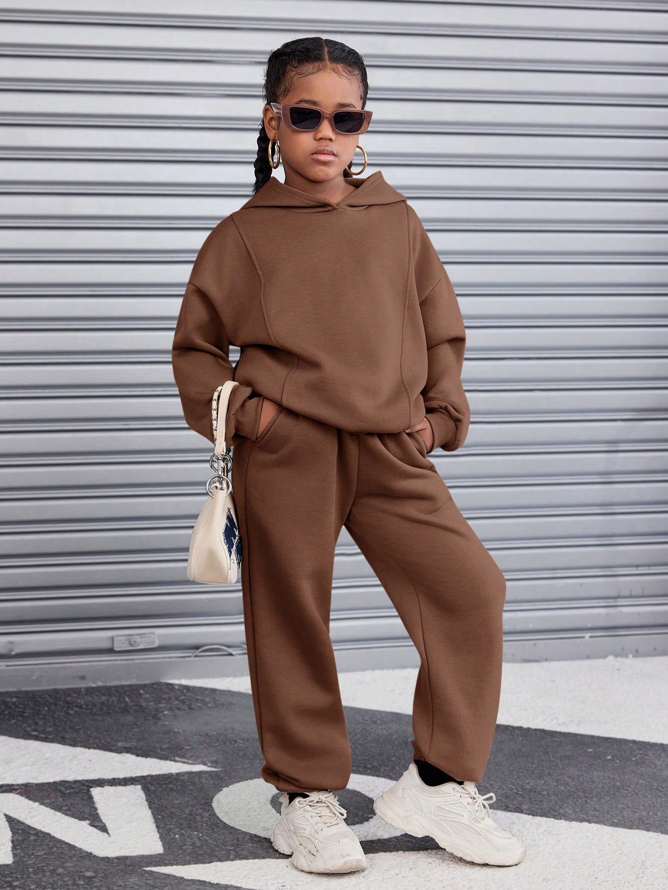 2pcs Set Tween Girls' Loose Fit Collegiate Warm Fleece Hoodie And Pants, Thick Outfit