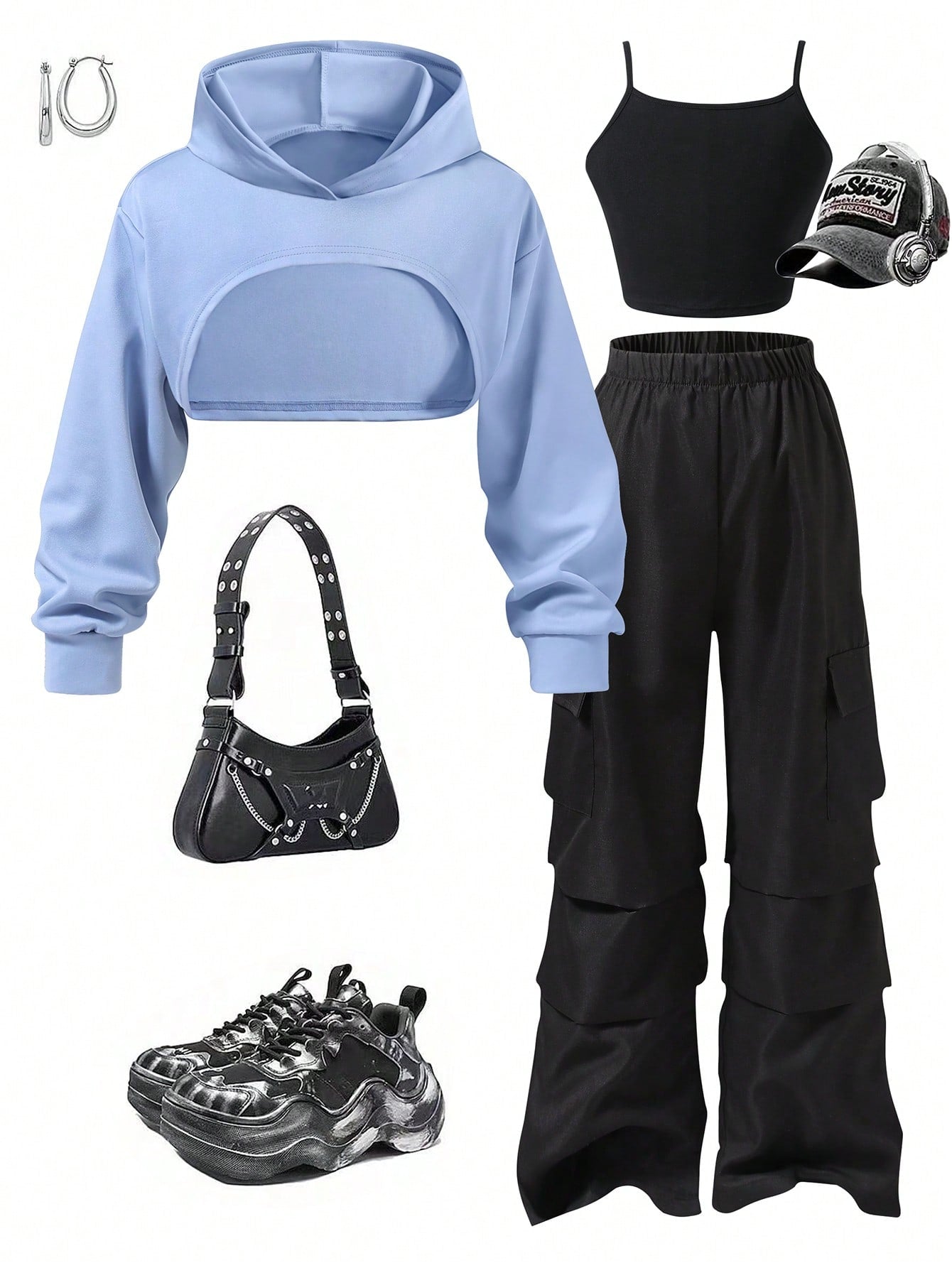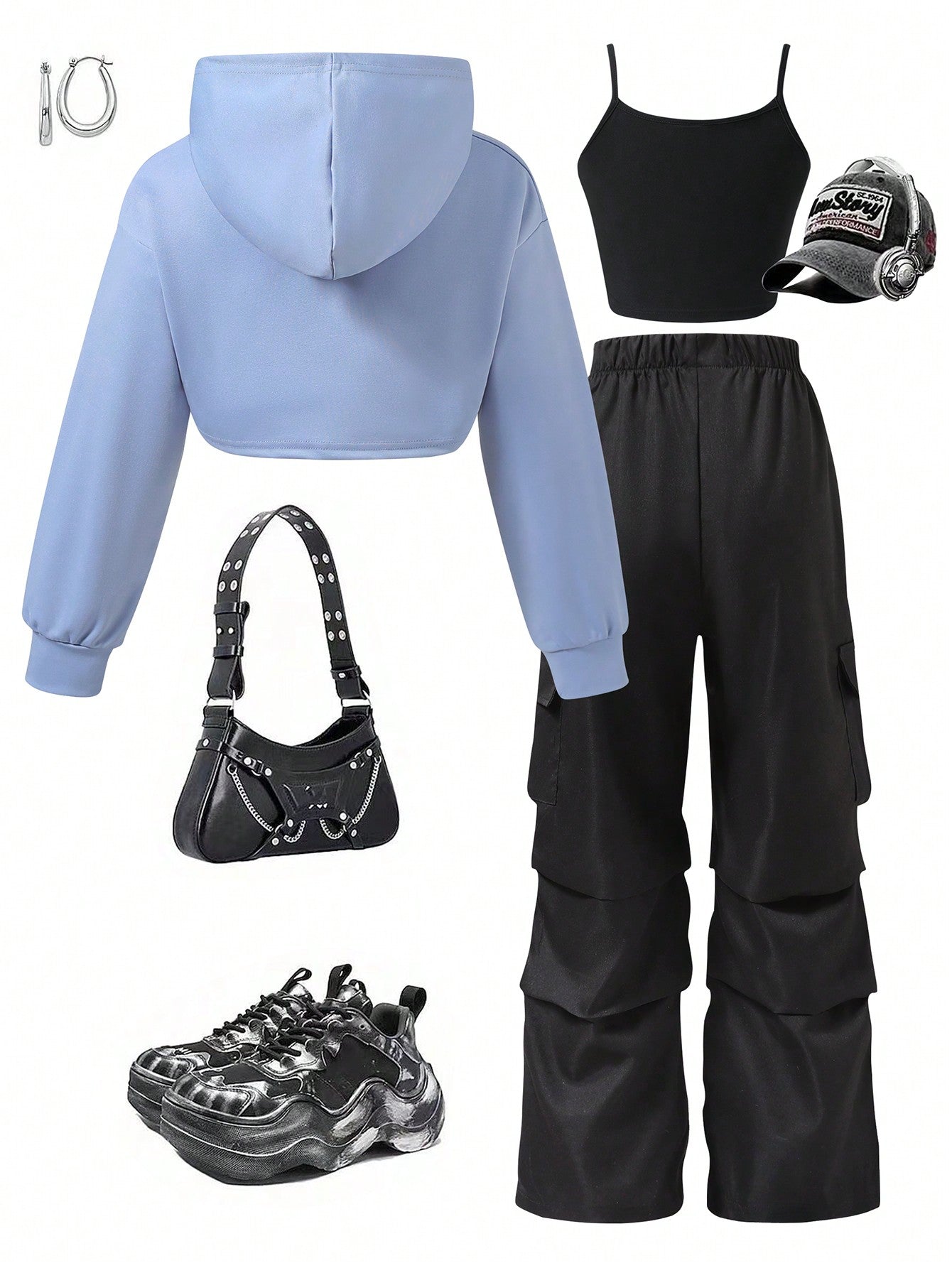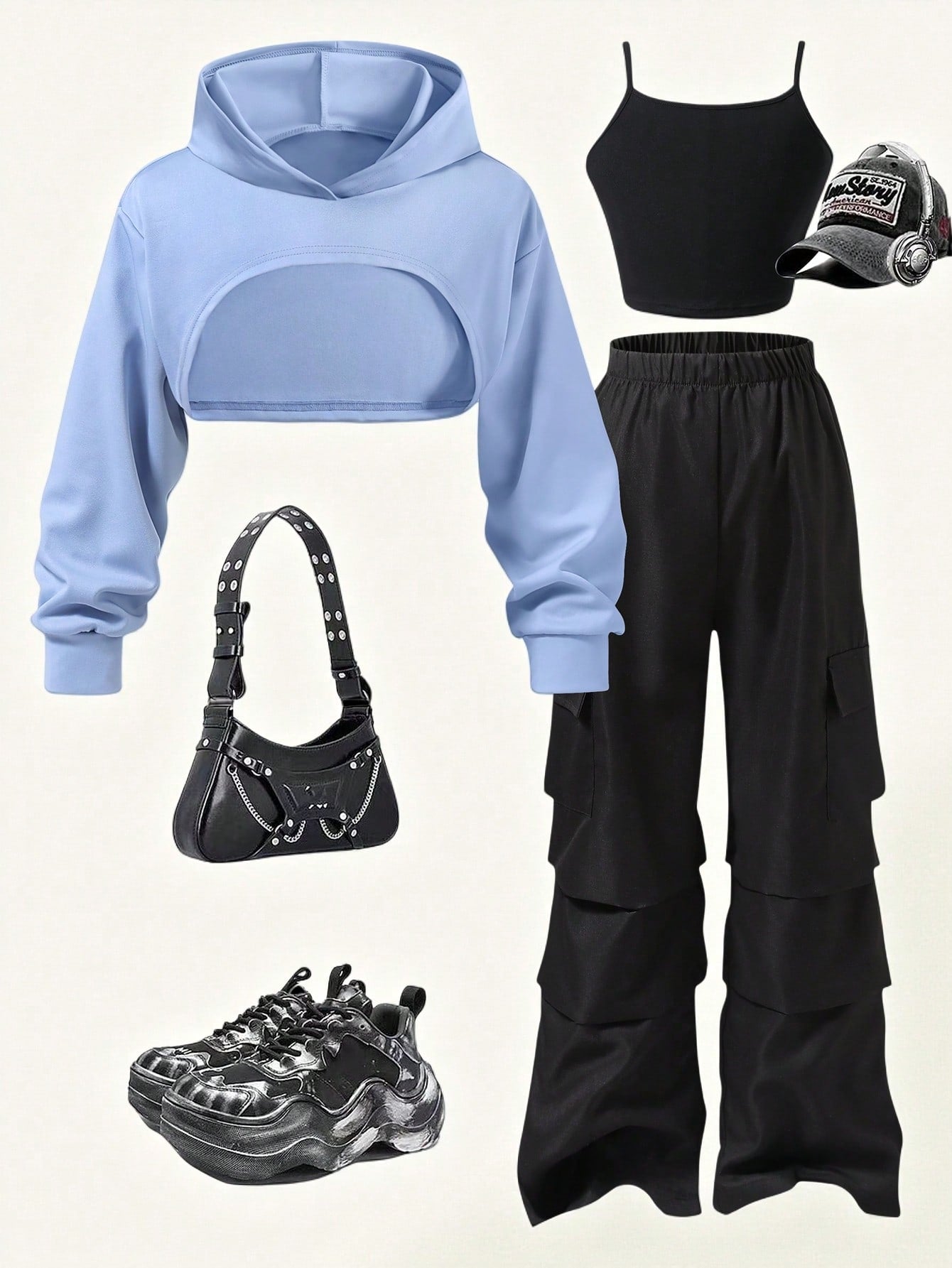 Explorewe 3pcs/Set Tween Girl Fashion Hoodie JacketandBlack Camisole TopandBlack Cargo Pants Outfits
