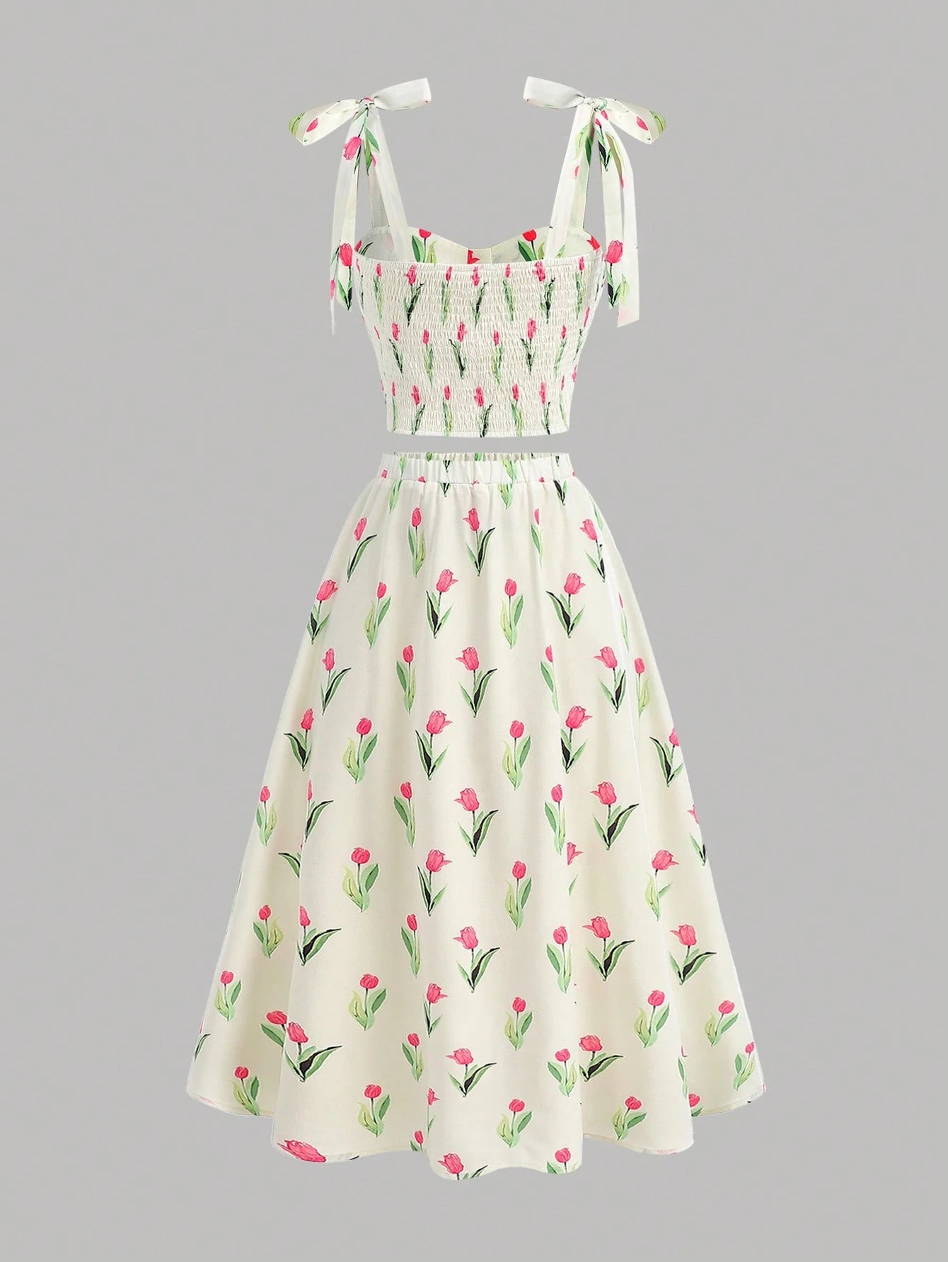 Girlism Teen Girls Allover Floral Print Cami Shoulder Bowknot Lace Up Summer Top & Skirt, Festival,Elegant