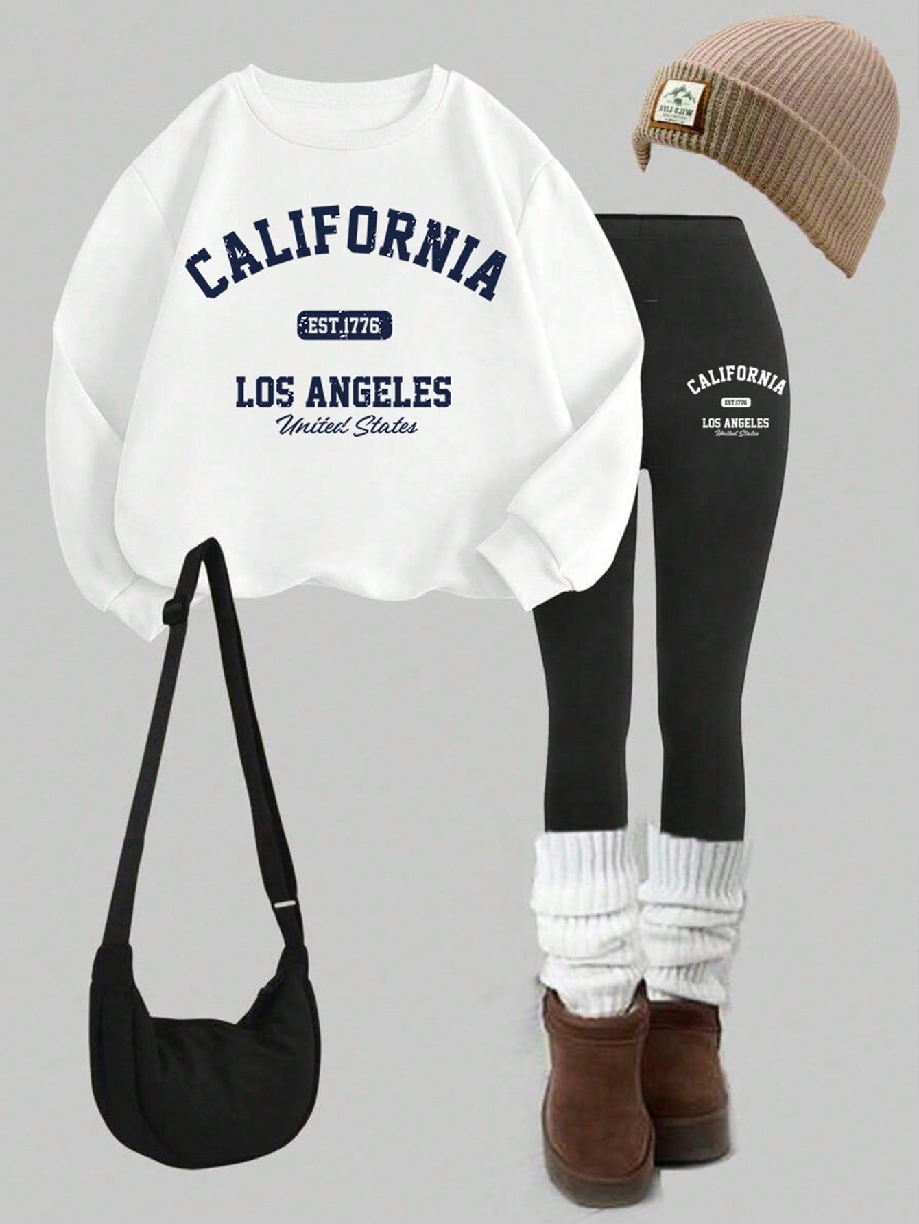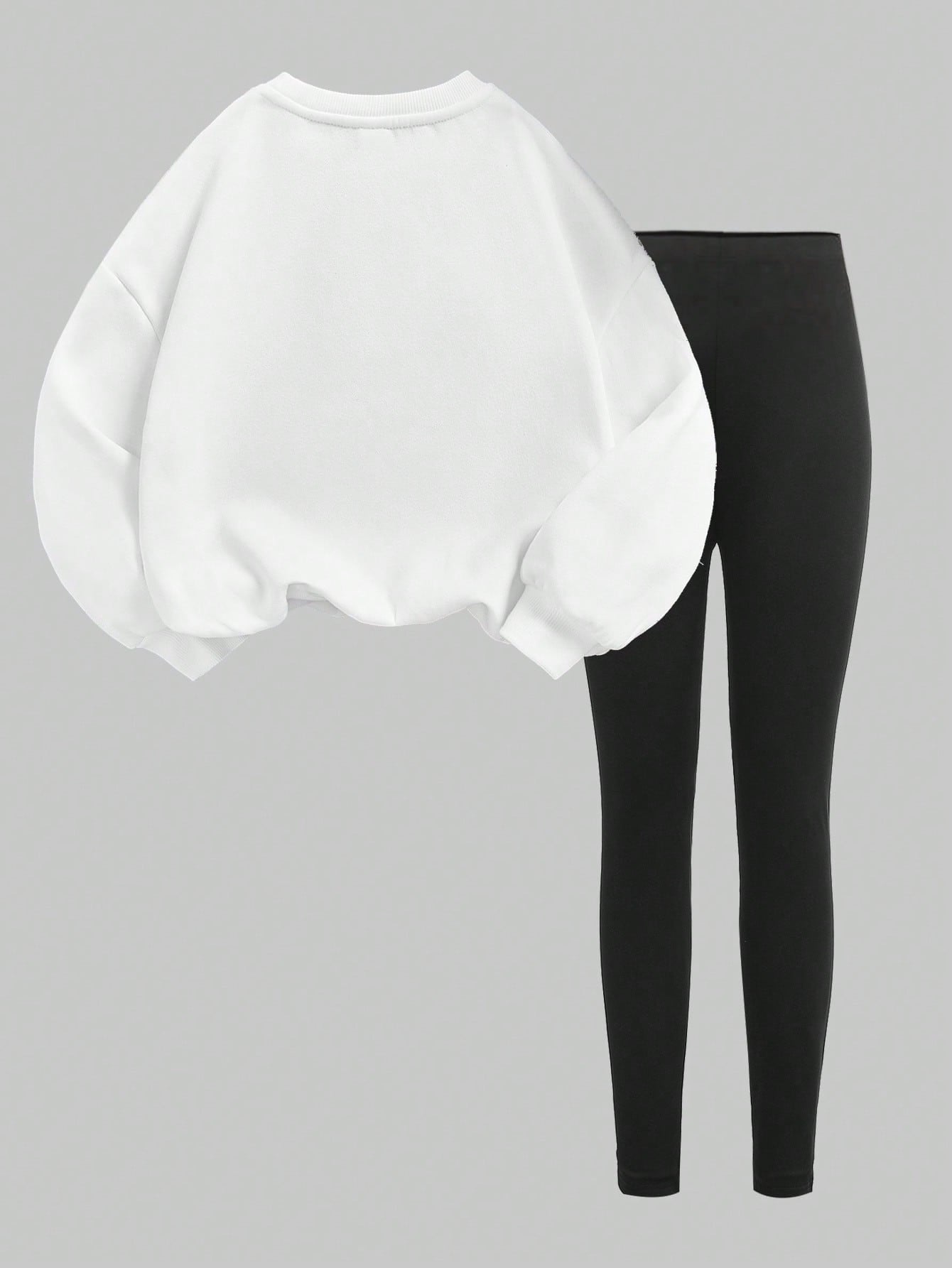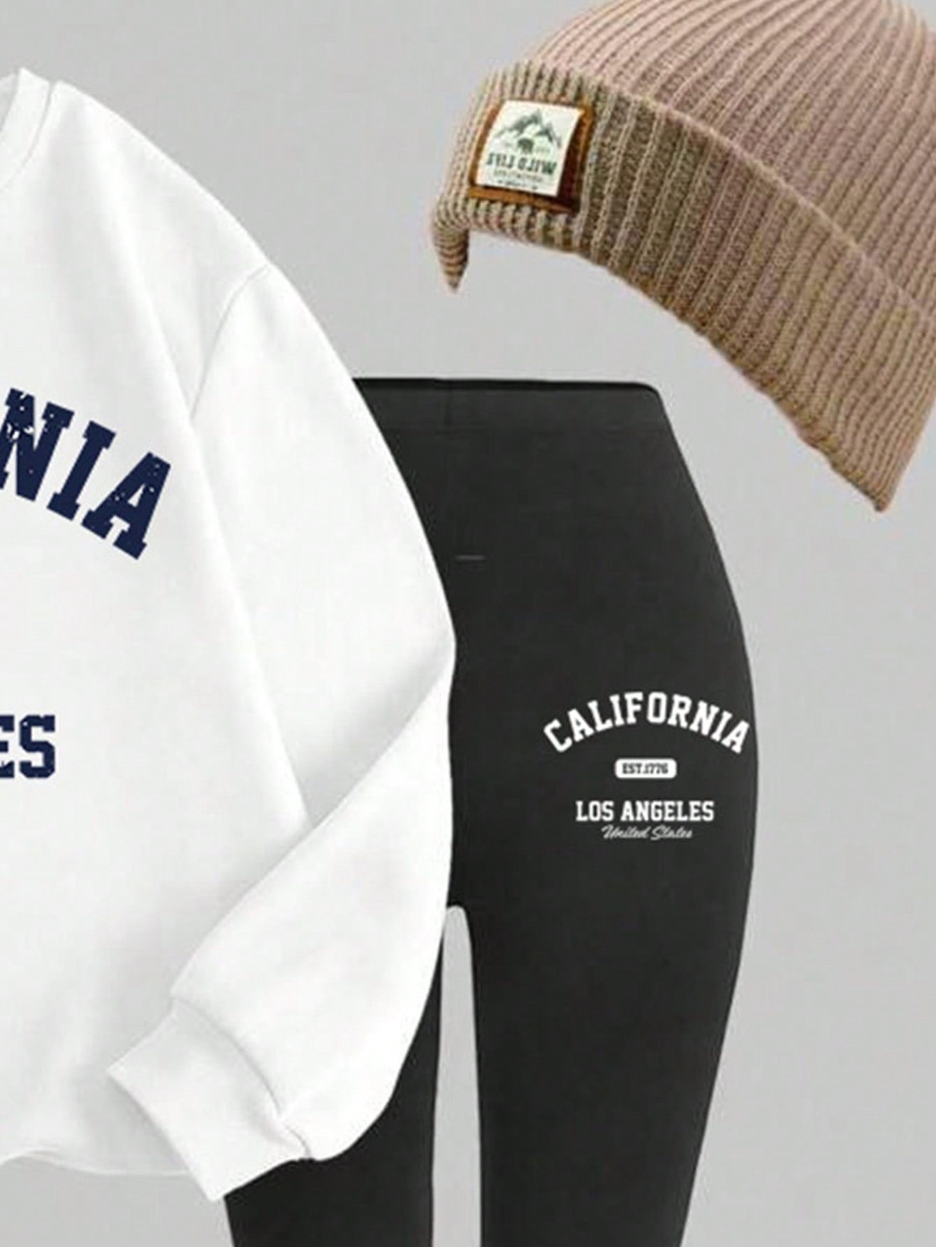 Girlism Tween Girl 2pcs/Set American Style Letter Printed Casual Thick Sweatshirt And Pants Set, Suitable