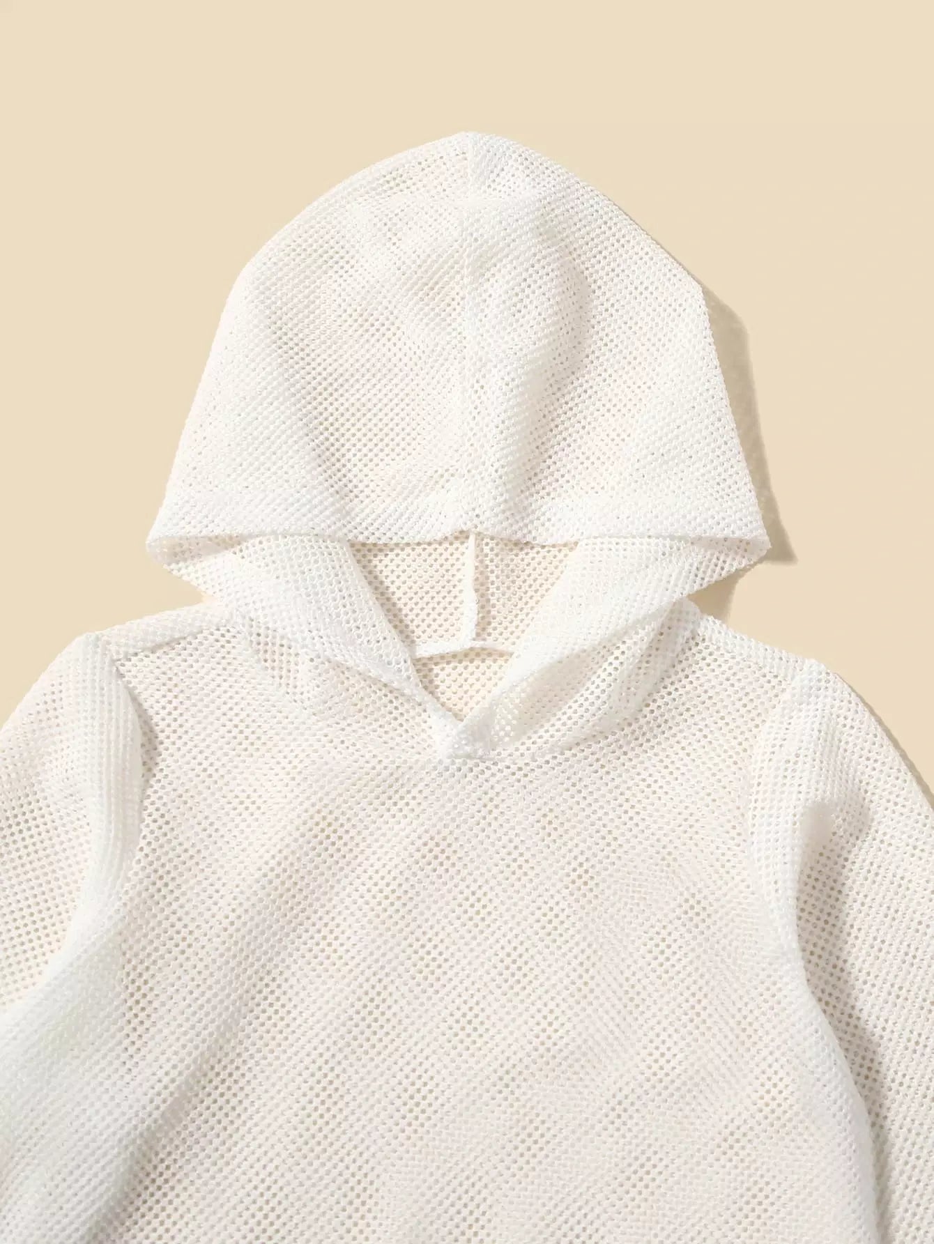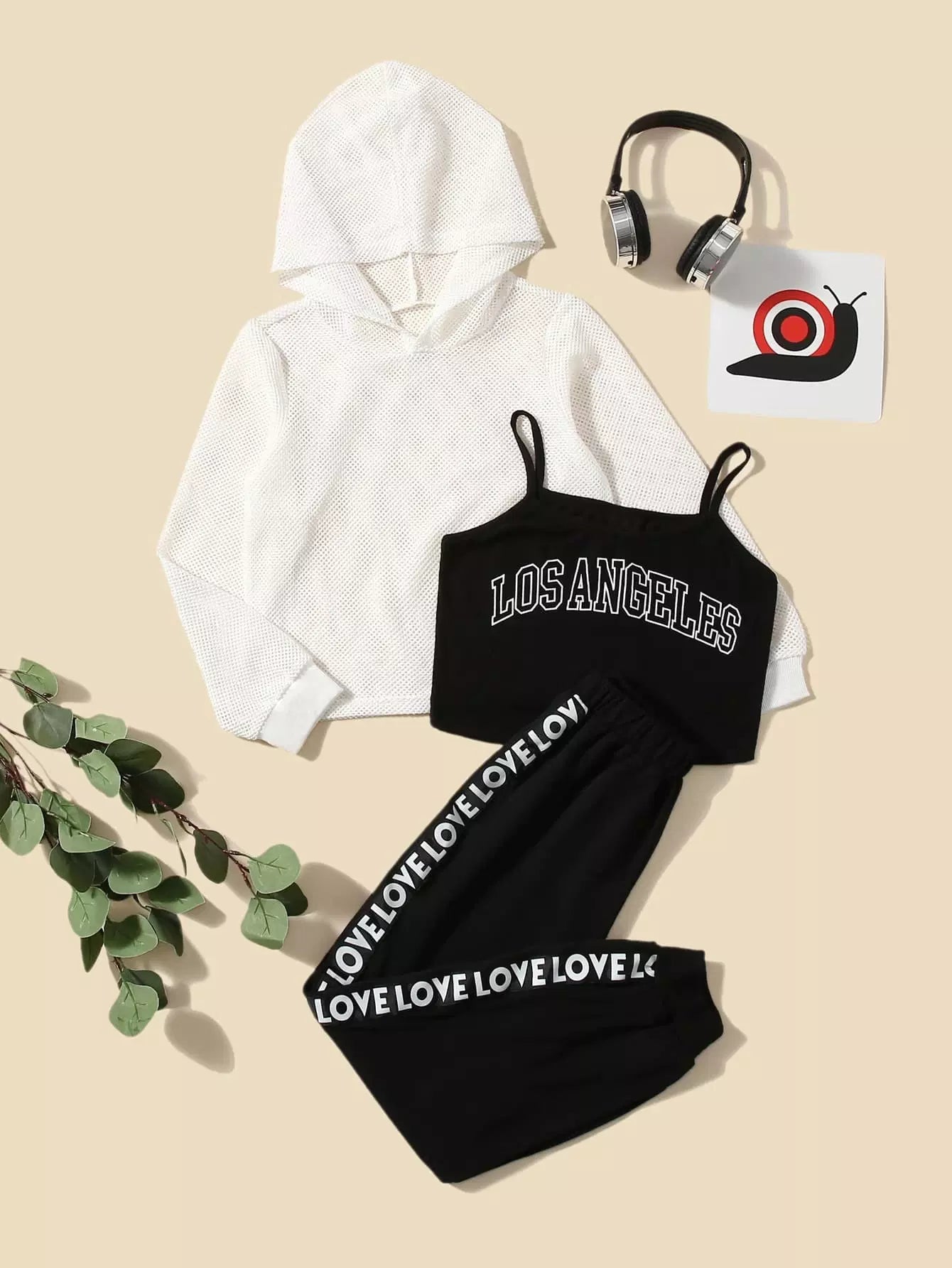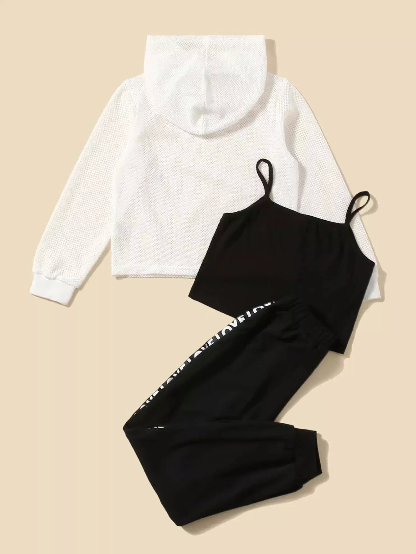 Girls 1pc Letter Graphic Cami Top & 1pc Fishnet Hoodie & 1pc Sweatpants