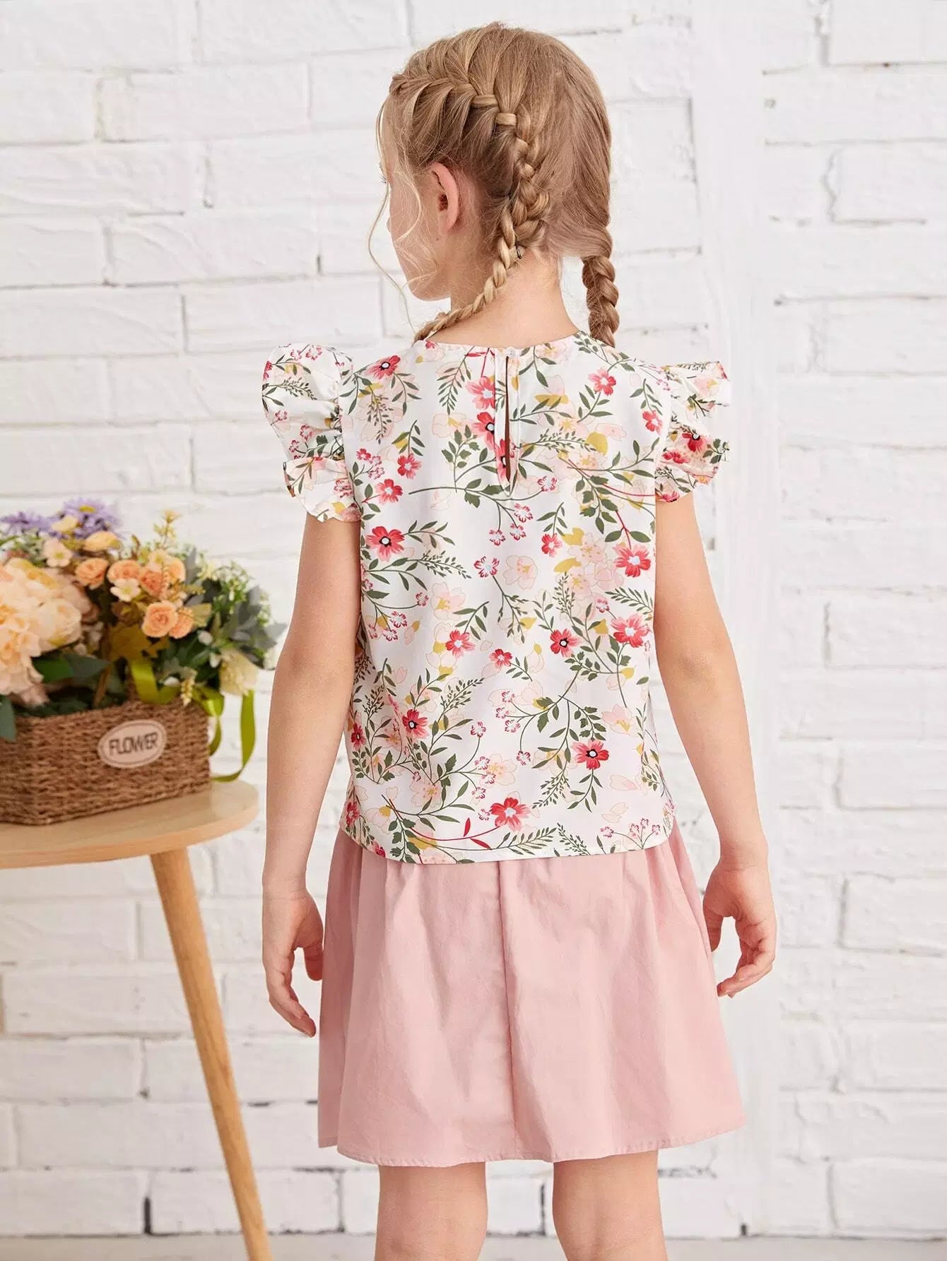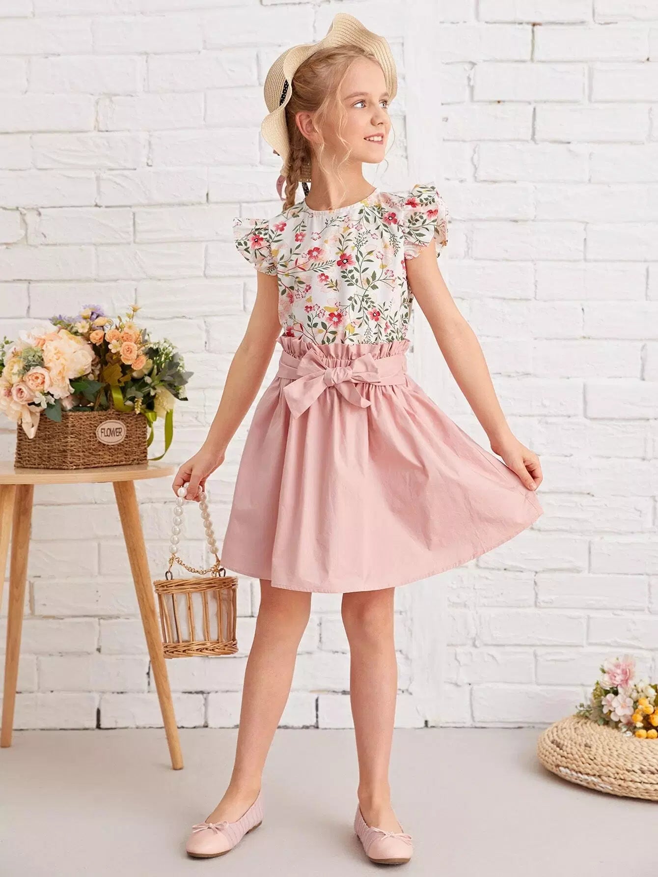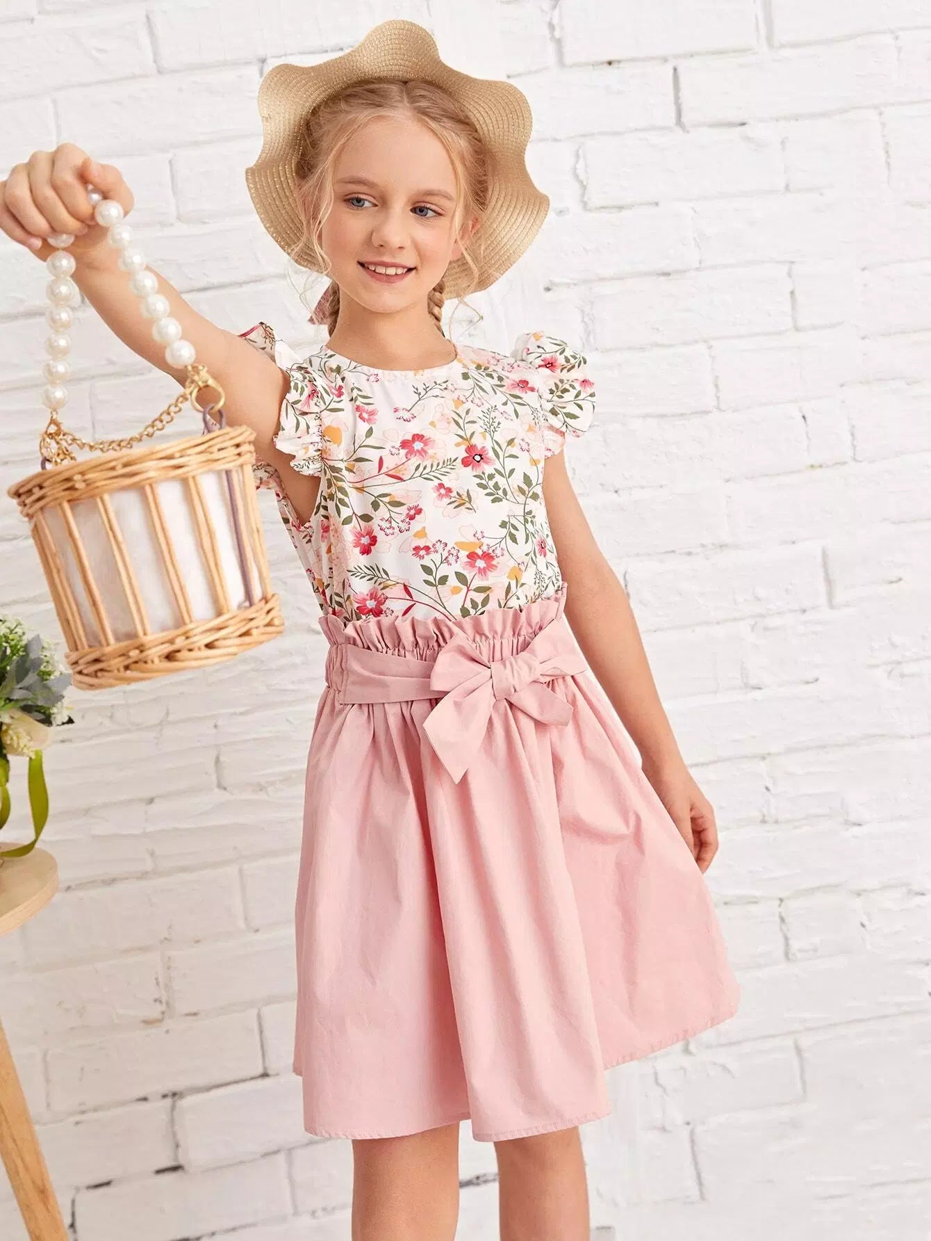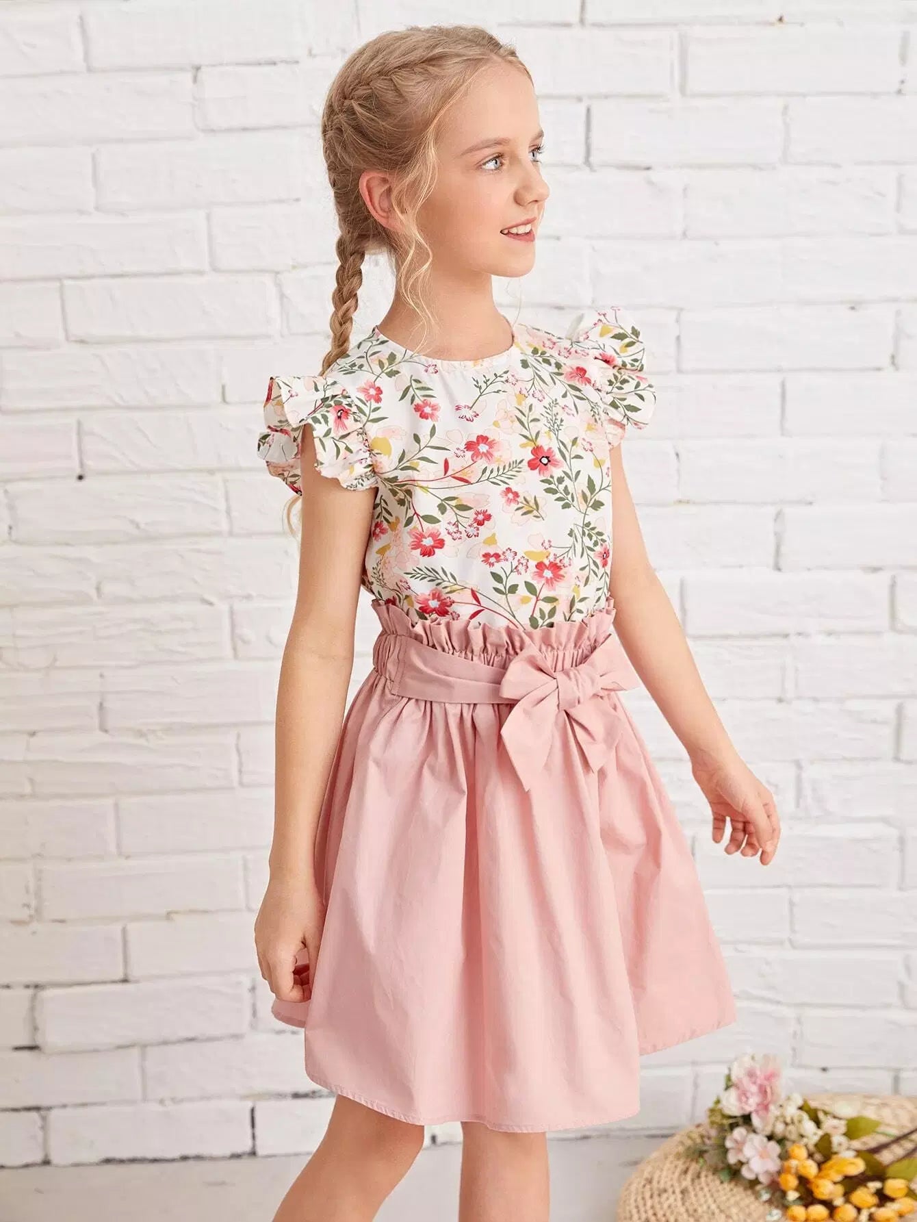 Kids - Girls Botanical Print Top & Paperbag Waist Skirt Set