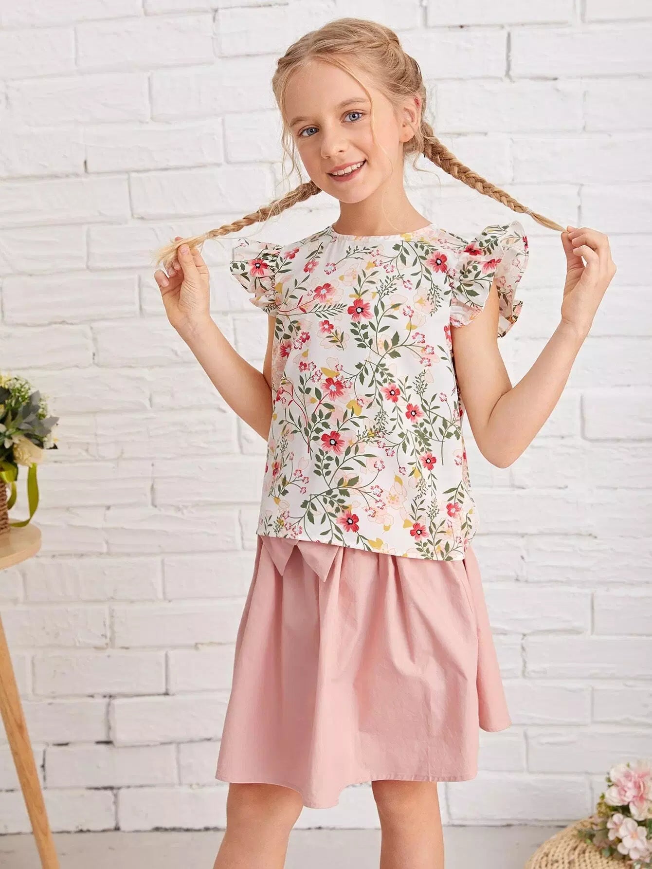 Girls Botanical Print Top & Paperbag Waist Skirt Set