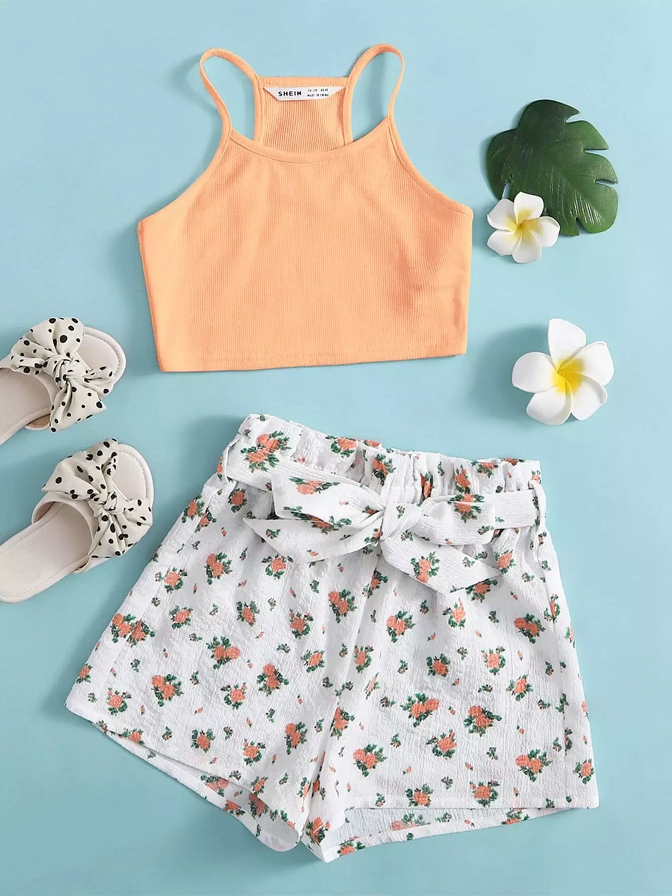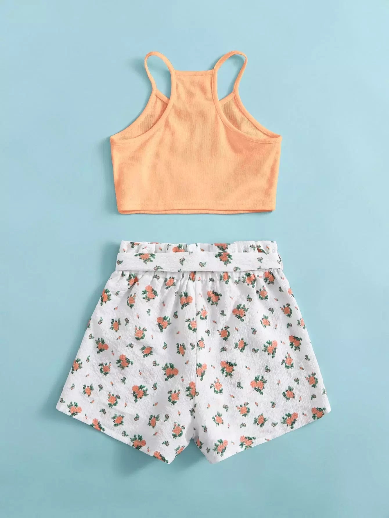 Girls Cami Top & Self Ditsy Floral Shorts Set Without Belt