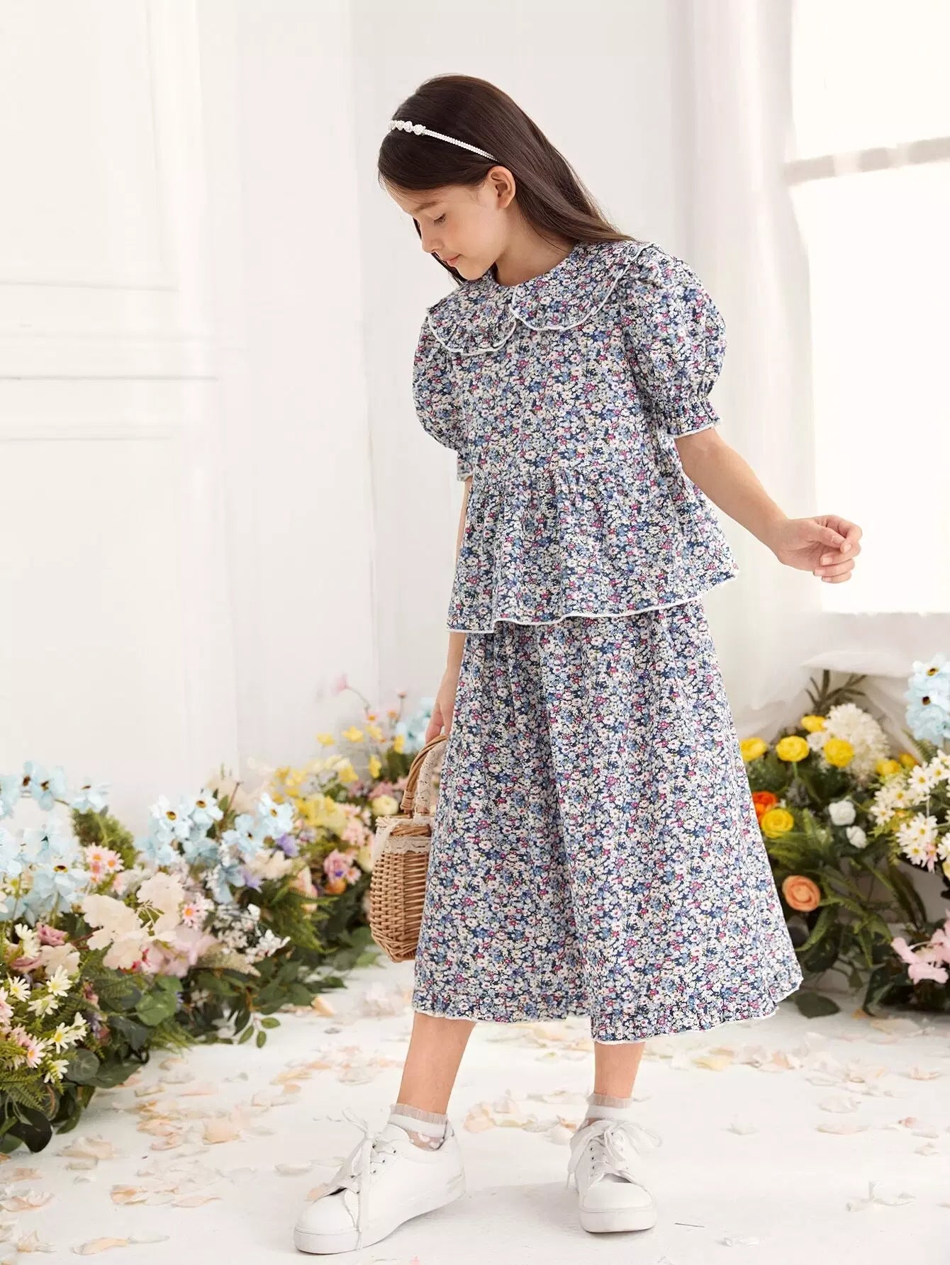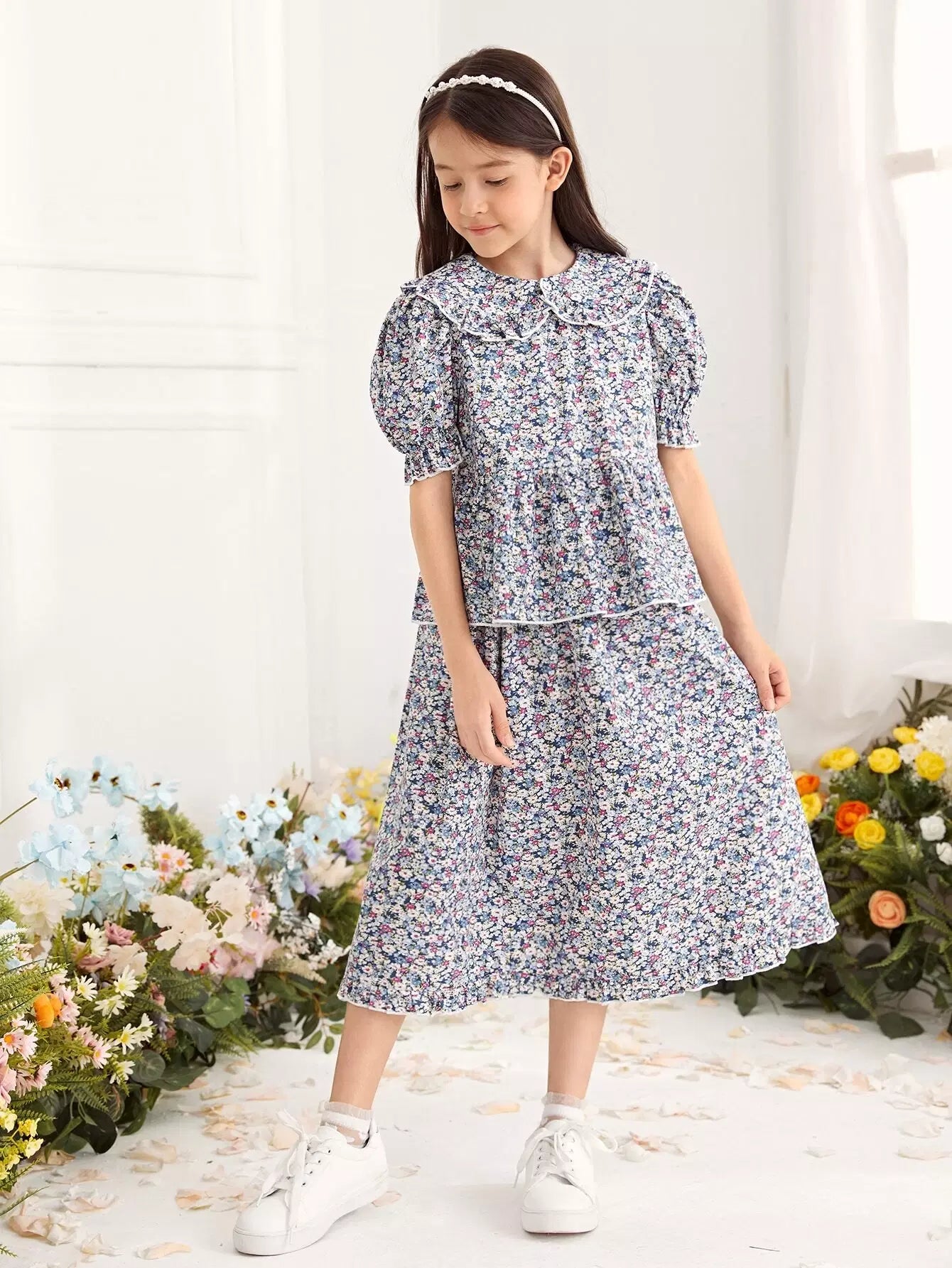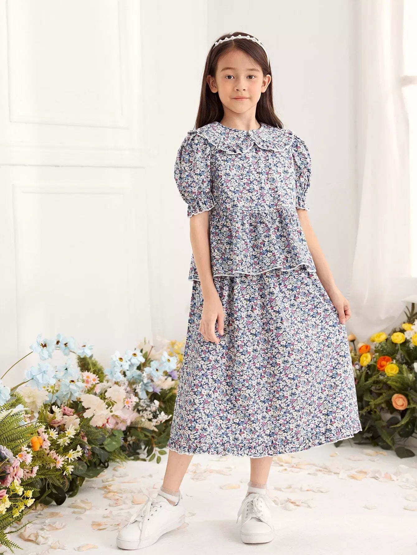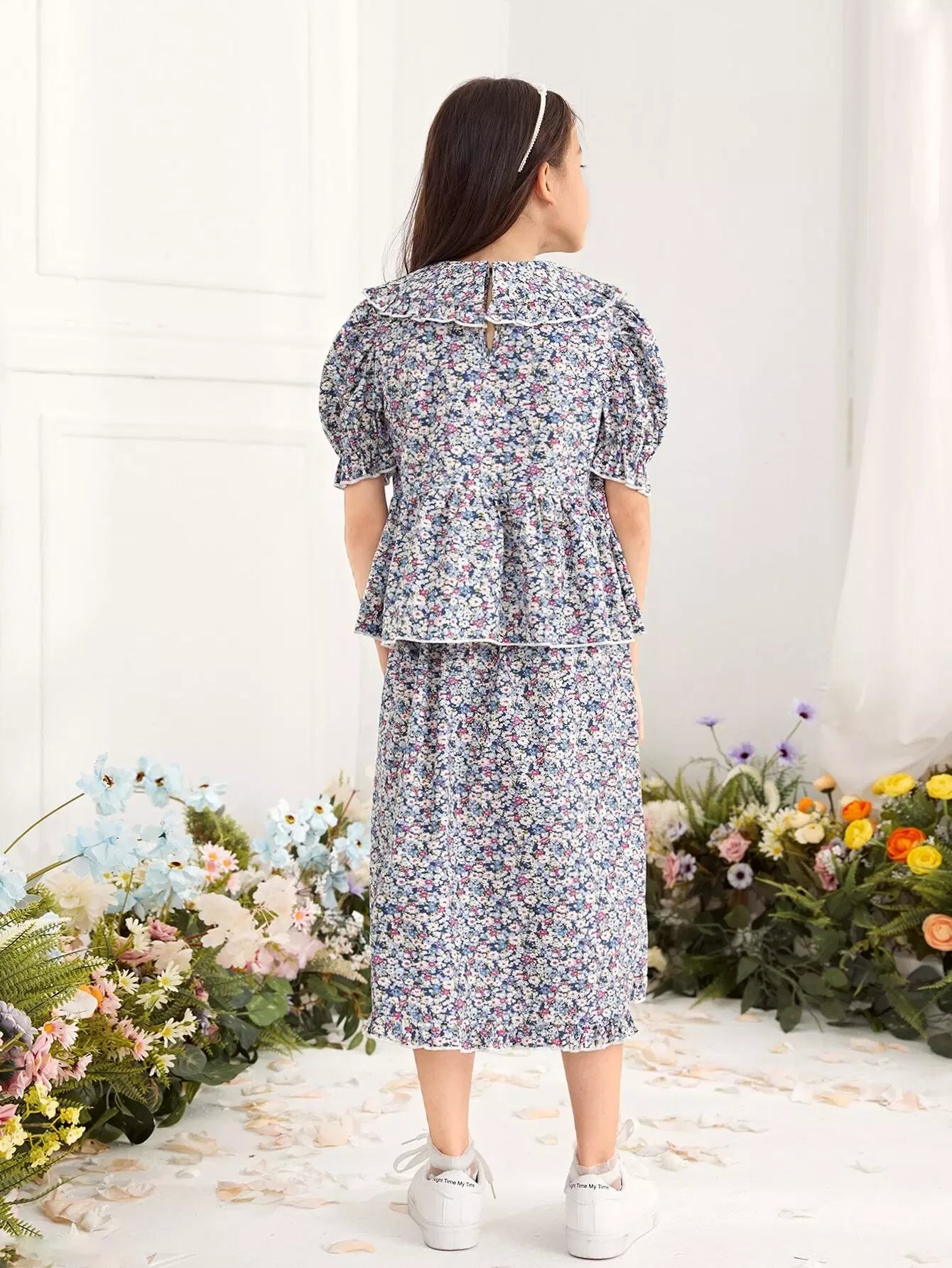 Girls Ditsy Floral Peter Pan Collar Puff Sleeve Ruffle Hem Peplum Top & Skirt