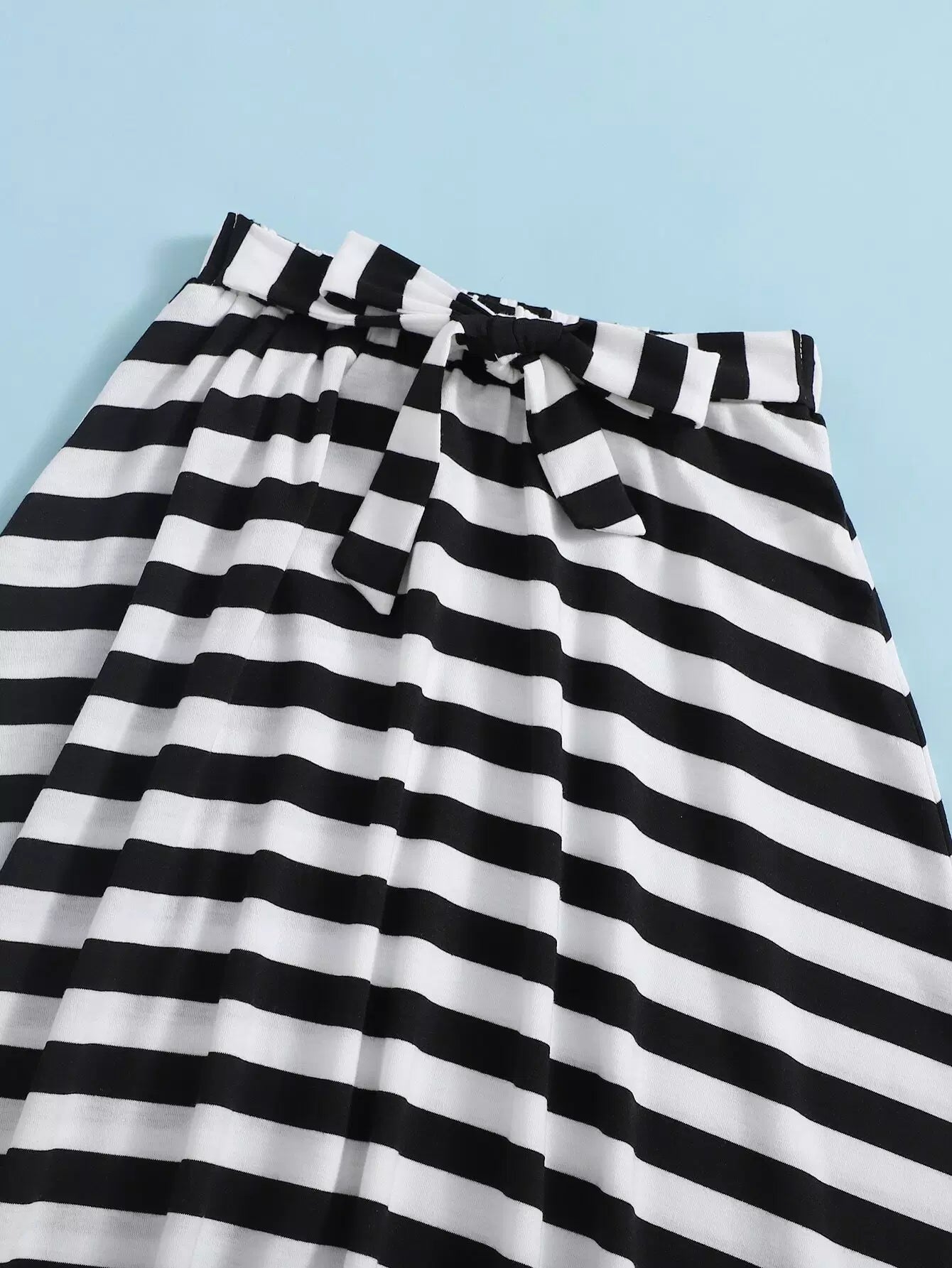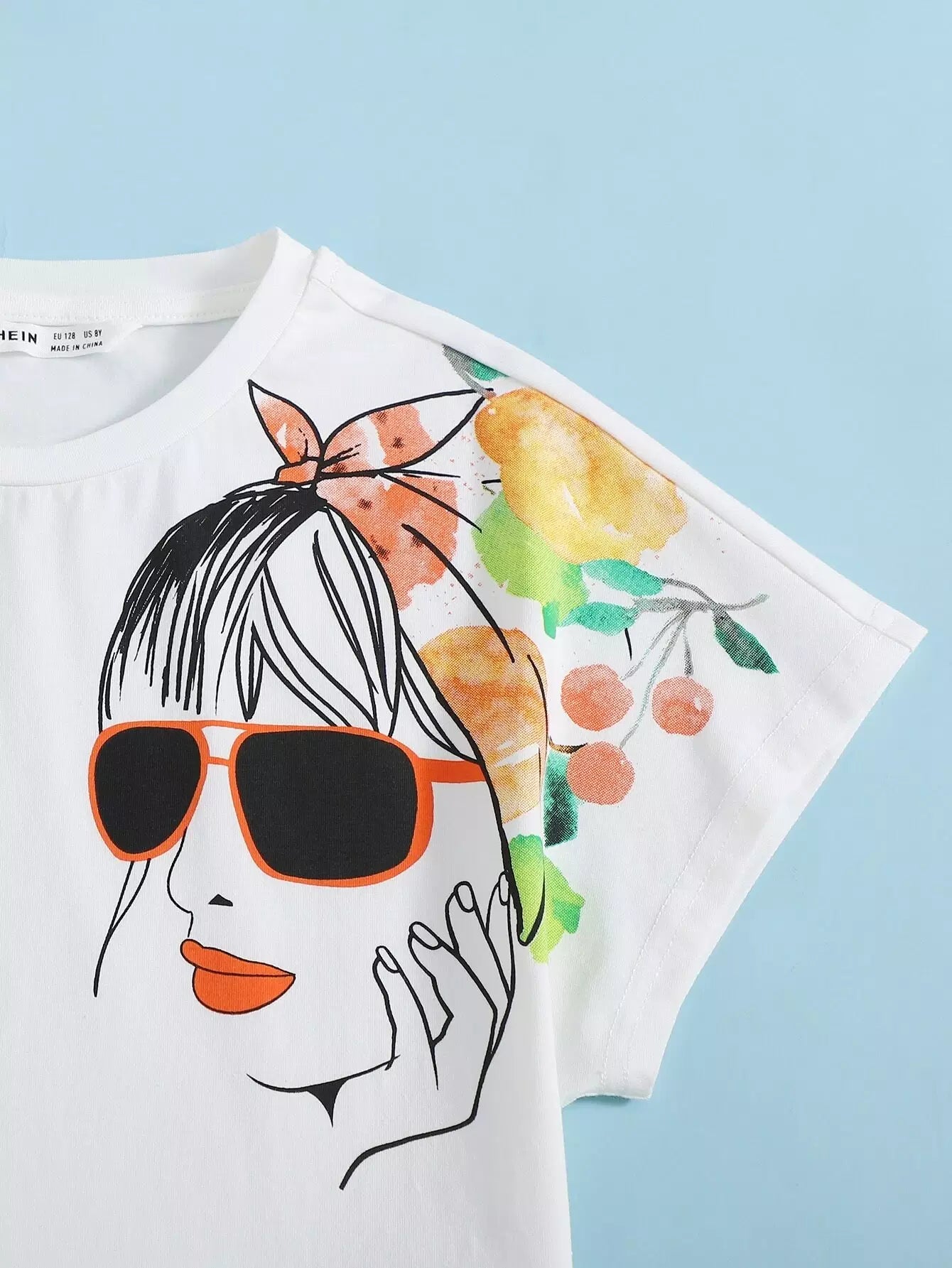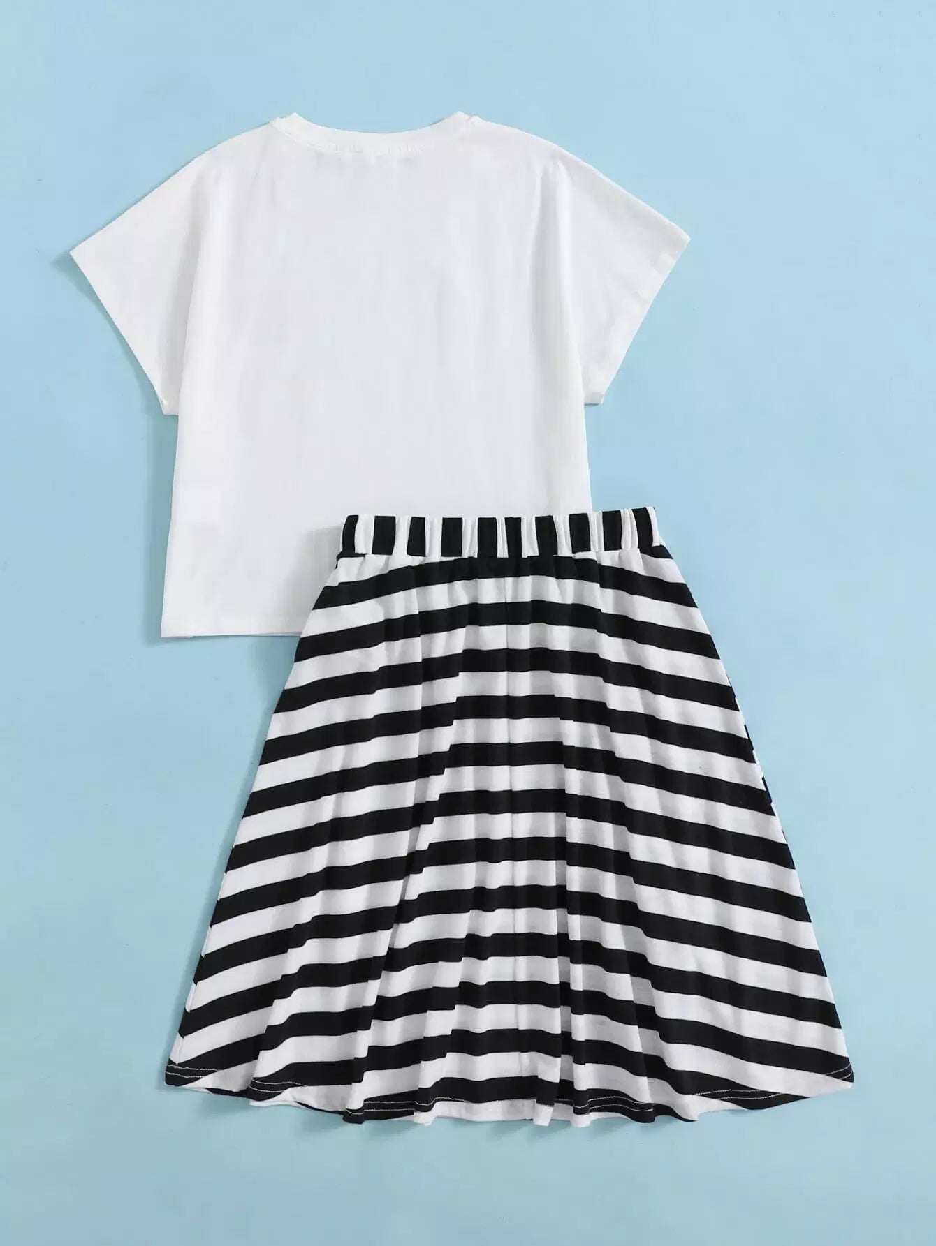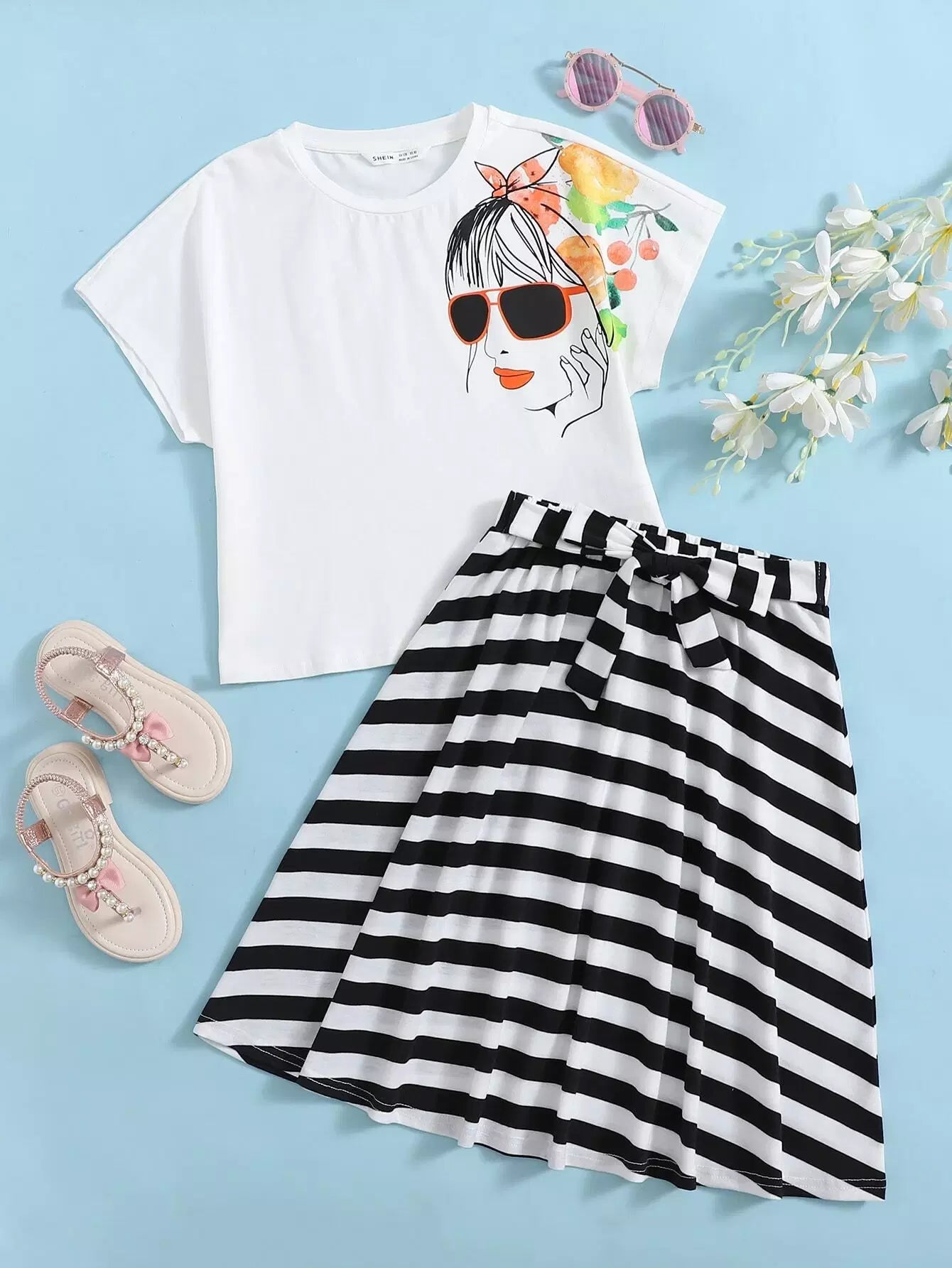 Girls Figure Graphic Top & Self Striped Skirt Set Without Belt