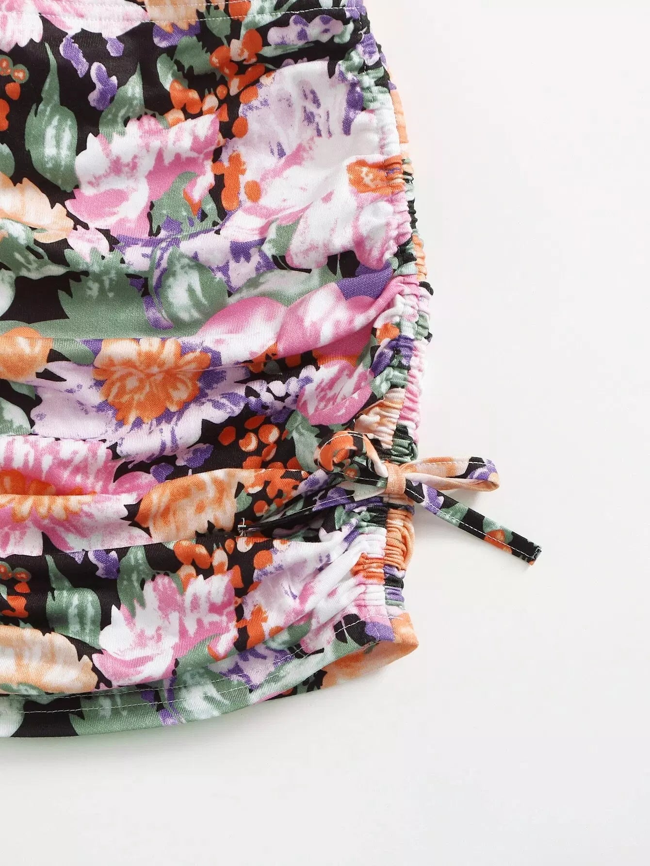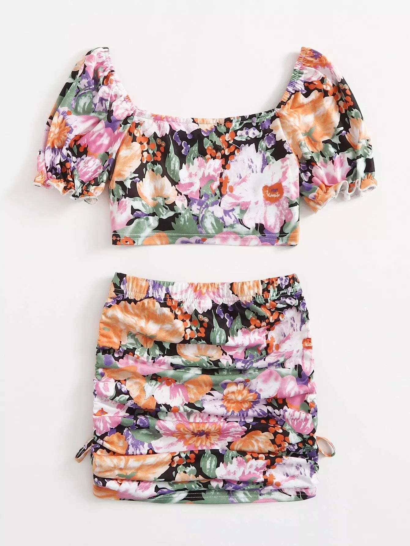 Girls Floral Print Puff Sleeve Drawstring Ruched Crop Top & Skirt Set