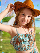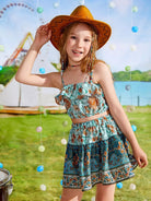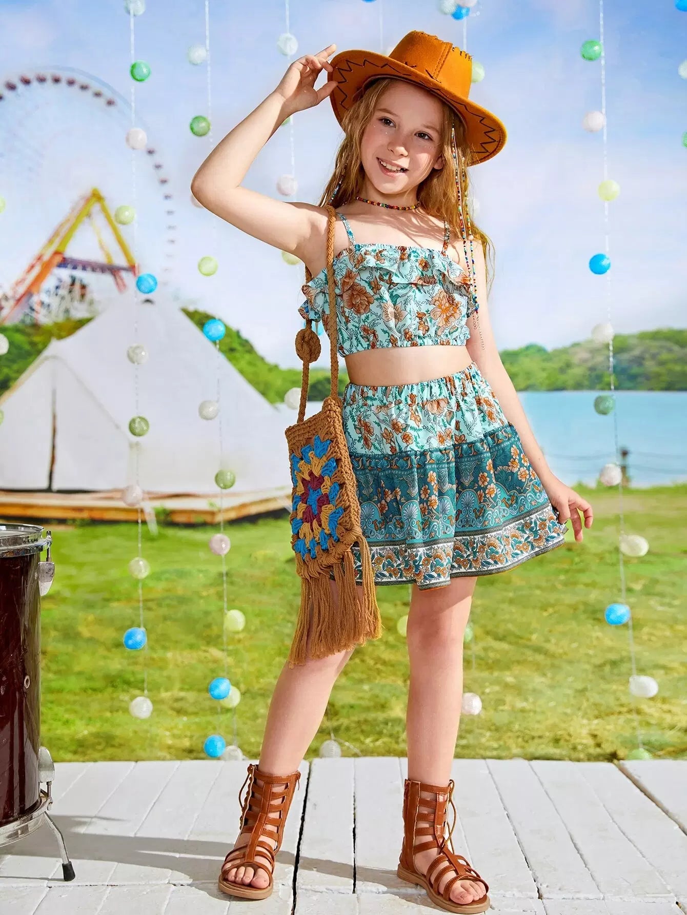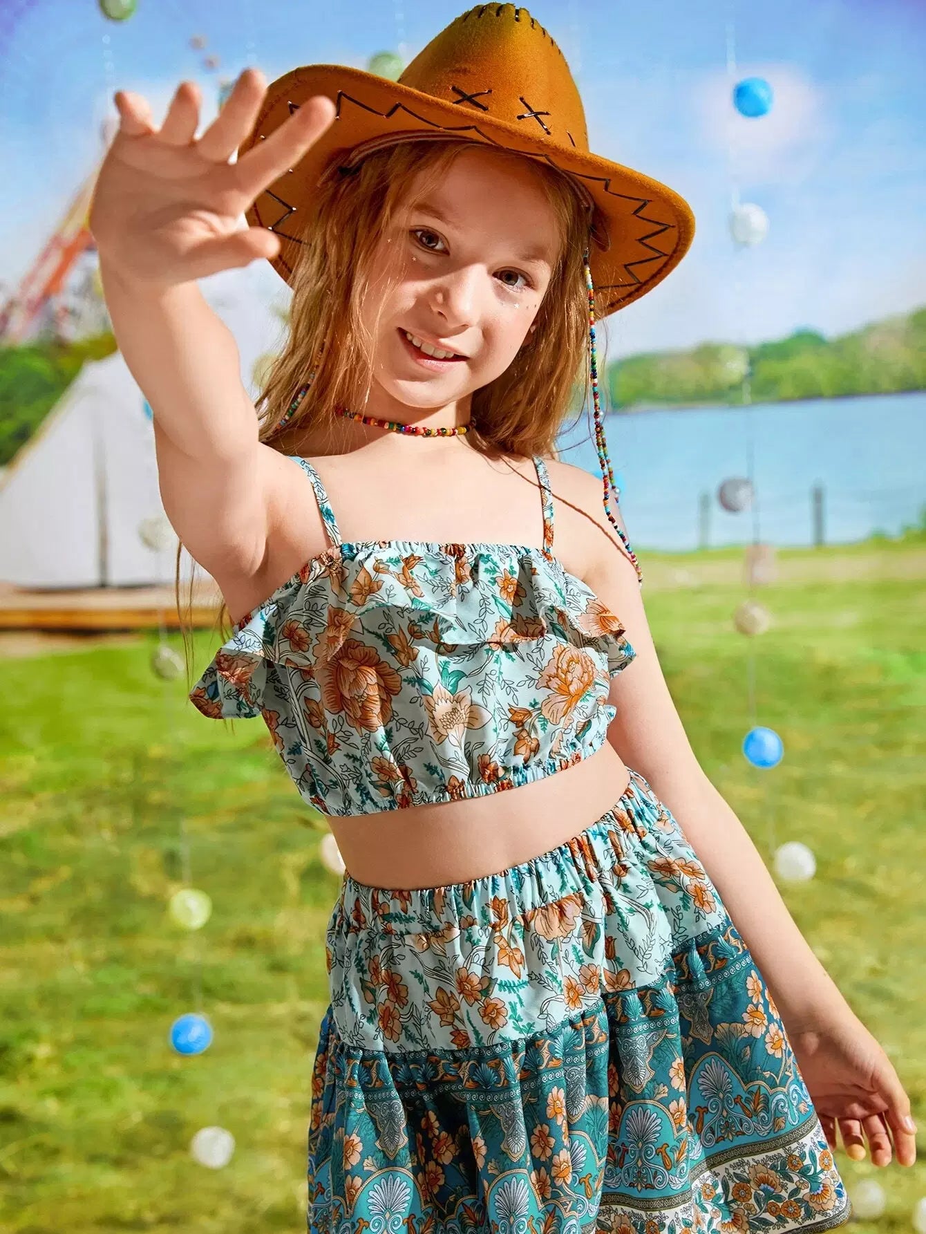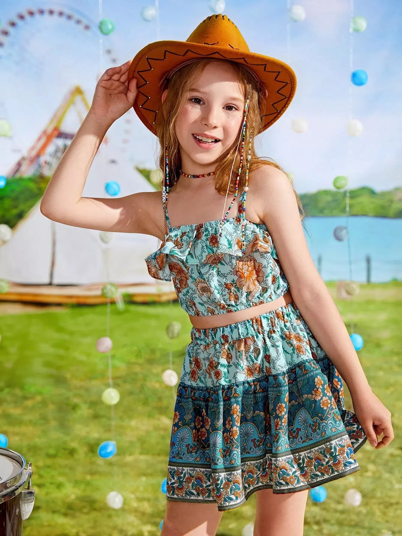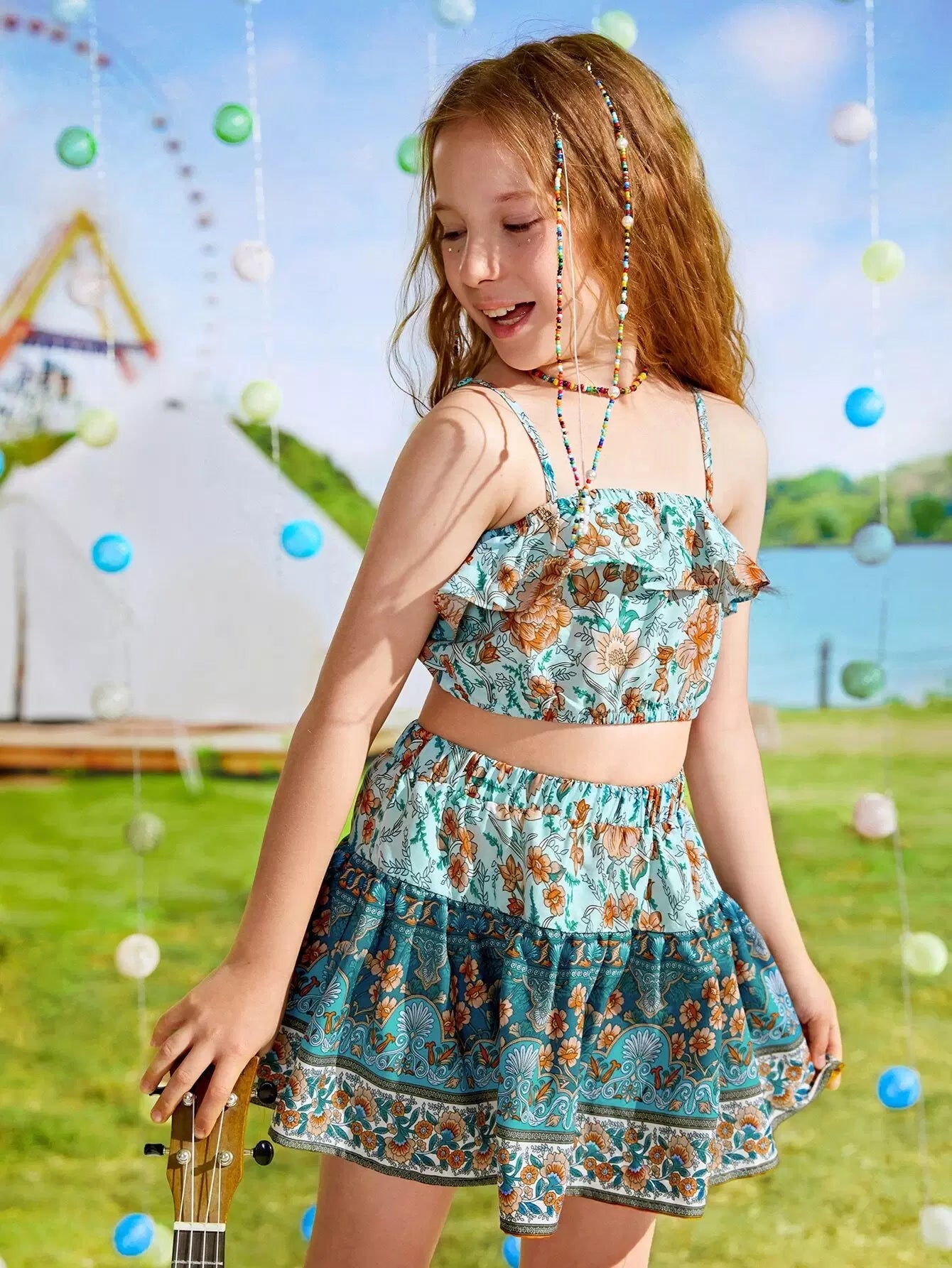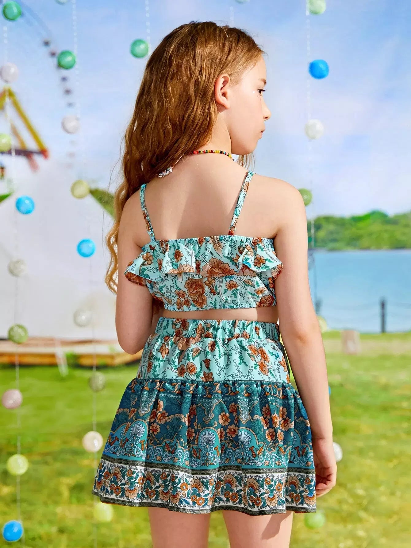 Girls Floral Print Ruffle Trim Cami Top & Skirt