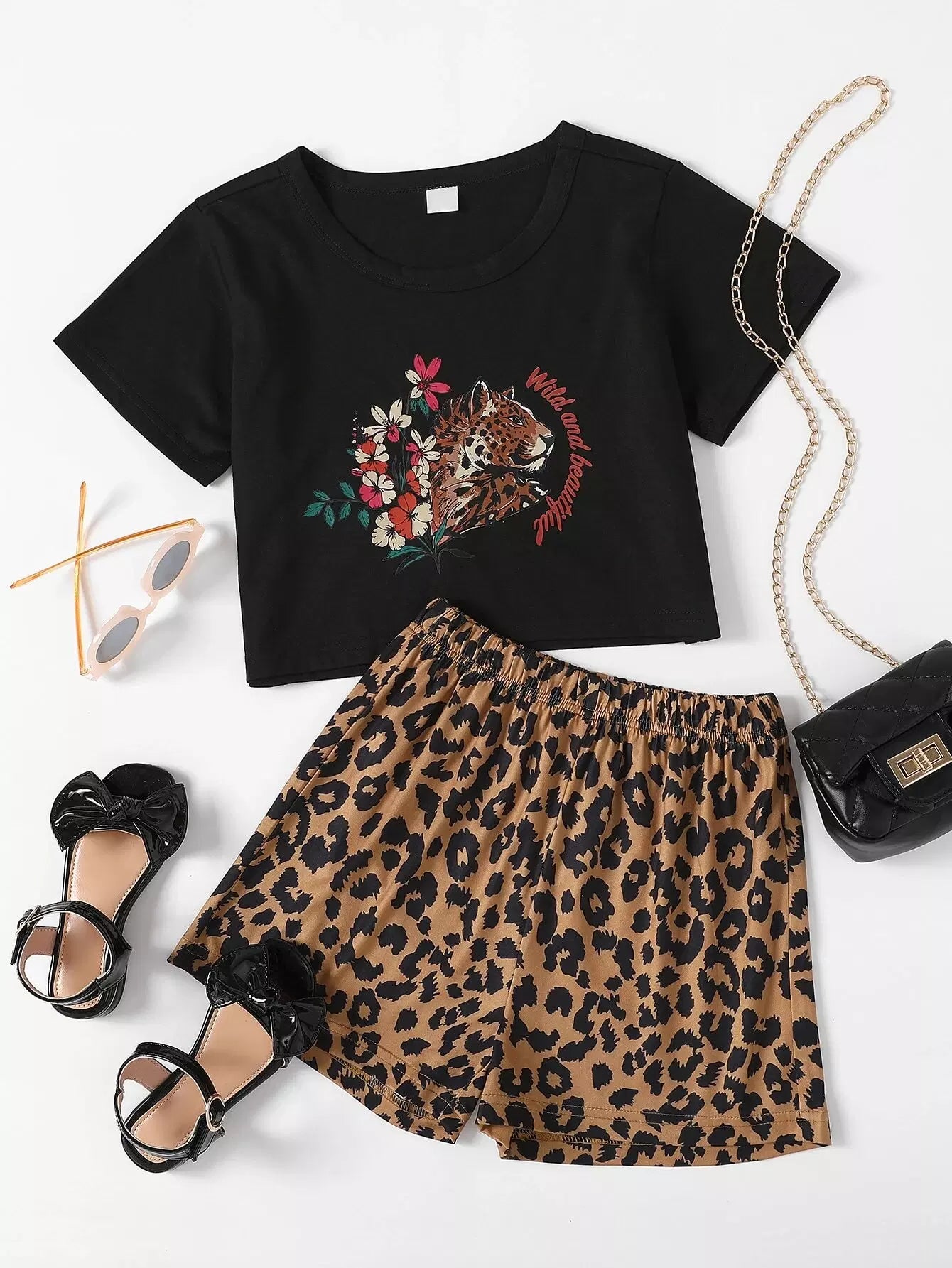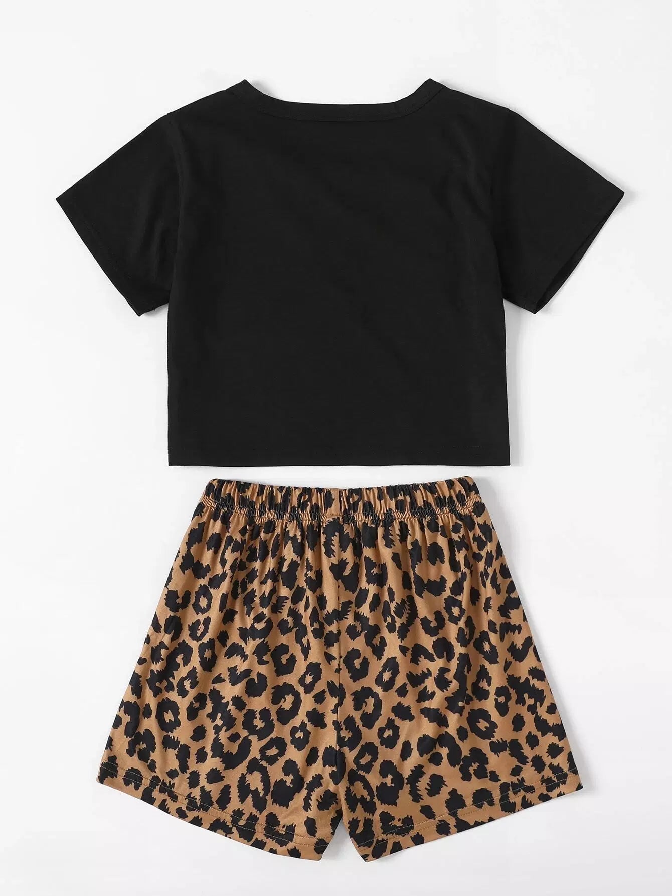 Girls Floral Print Tee With Leopard Shorts