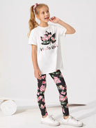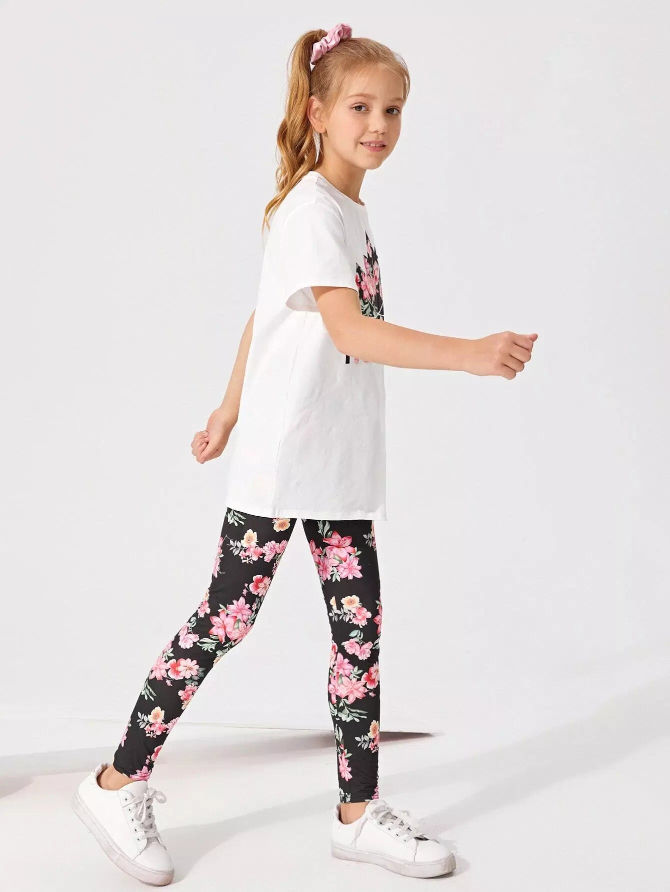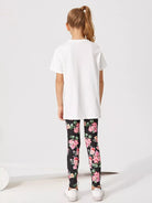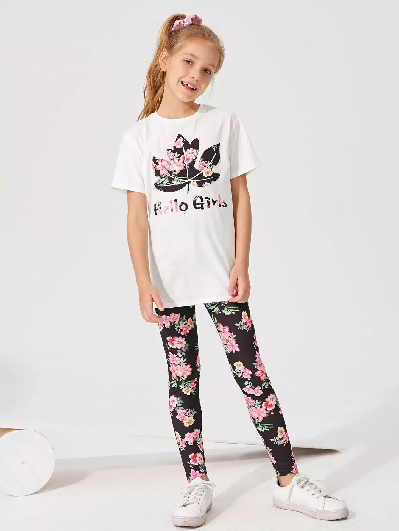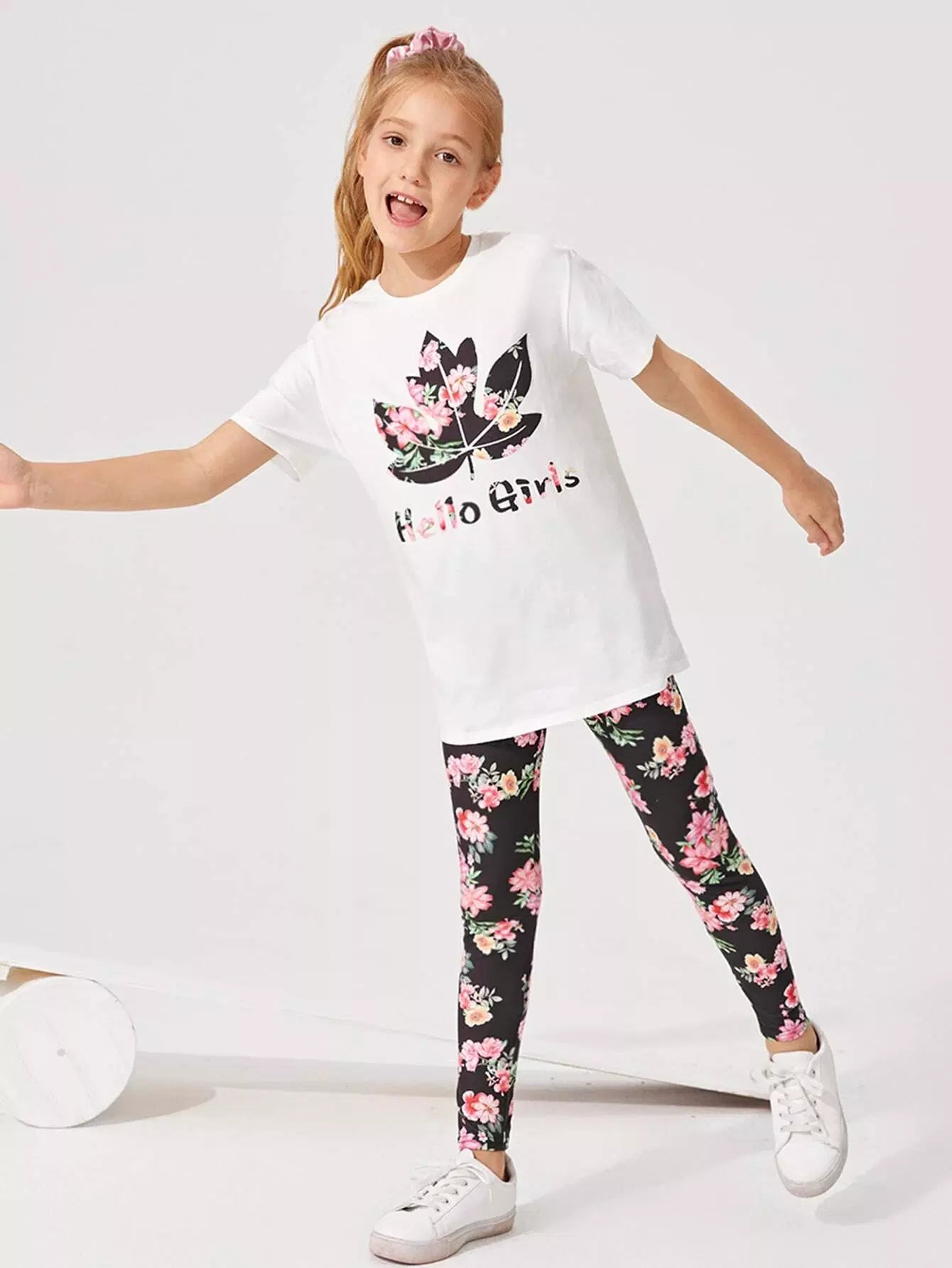 Girls Floral Slogan Graphic Tee & Leggings Set
