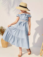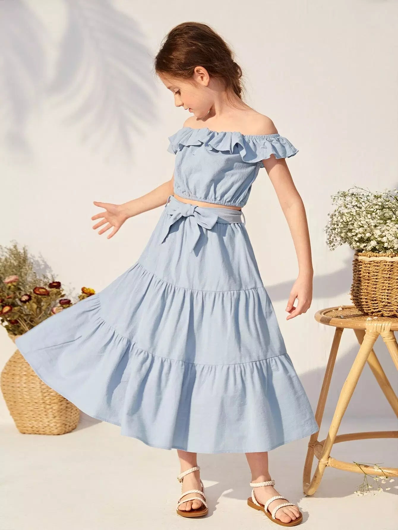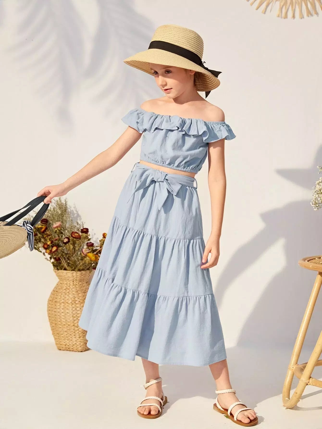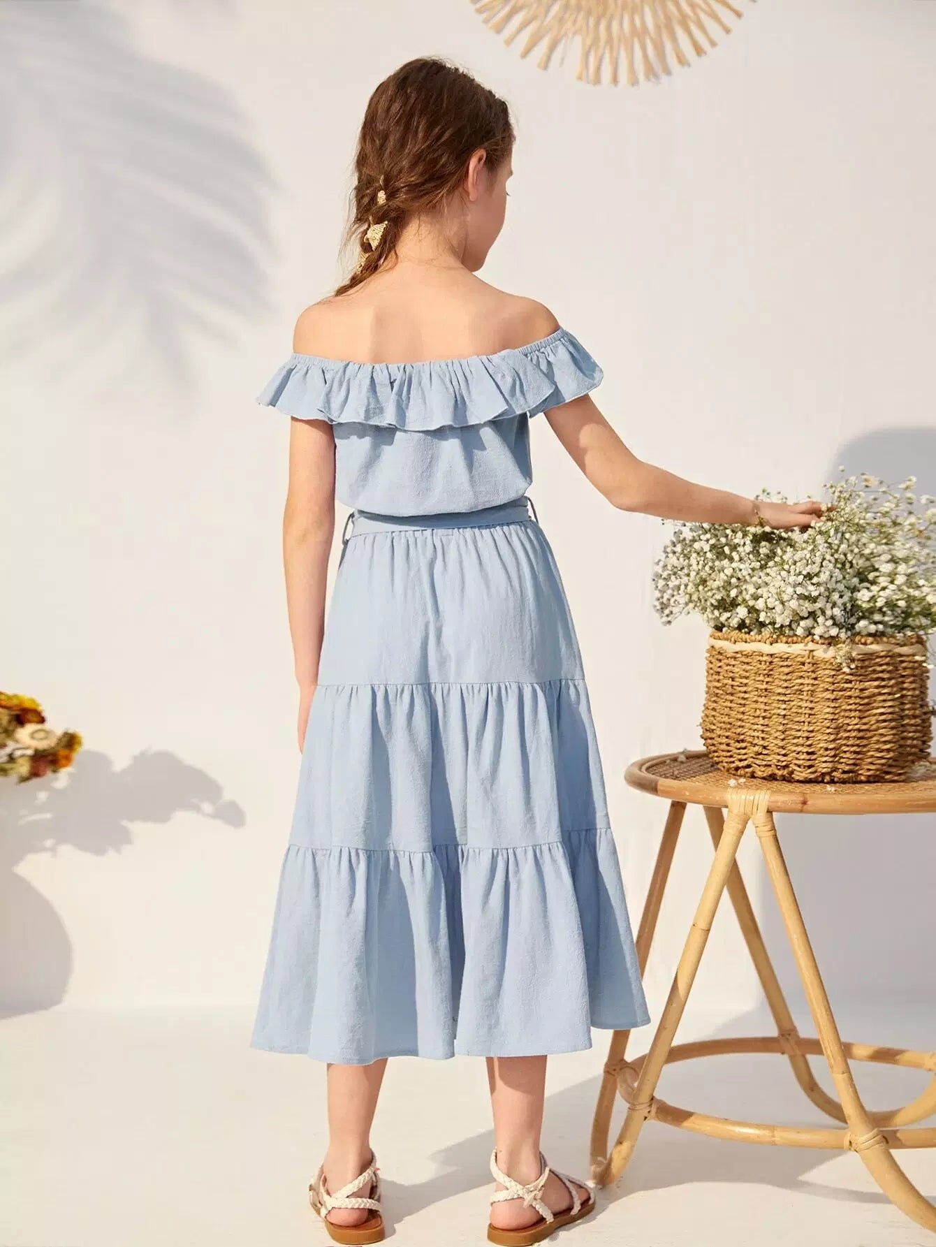 Girls Flounce Off Shoulder Top And Skirt Set Without Belt
