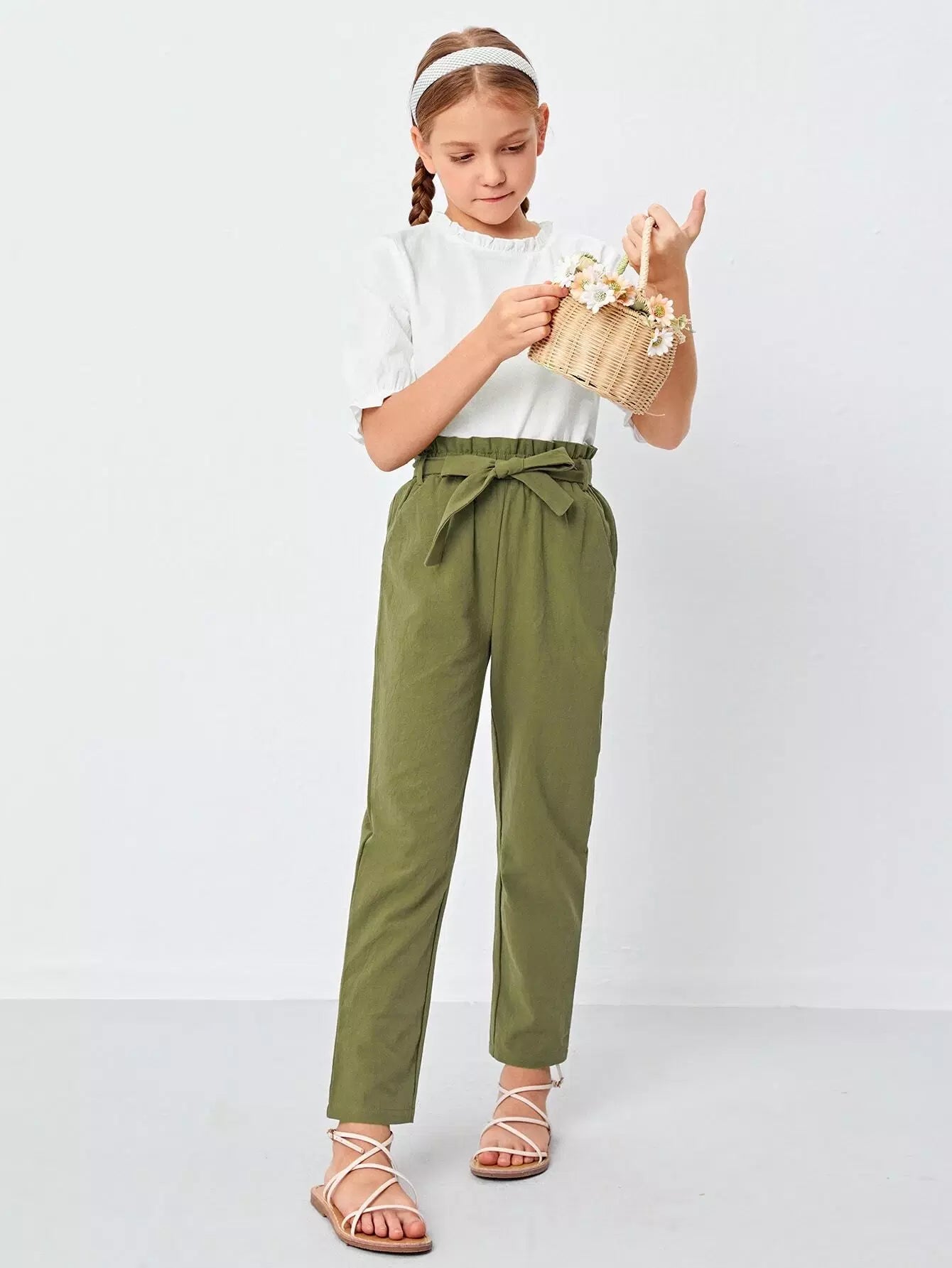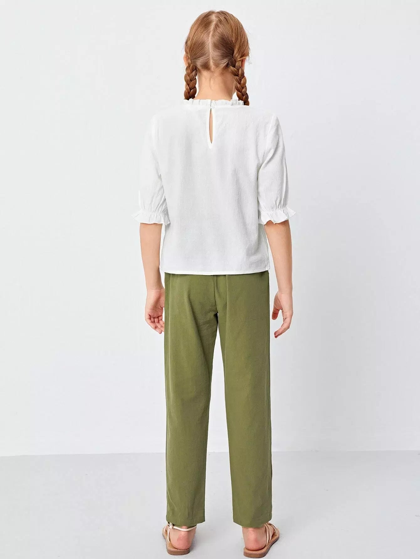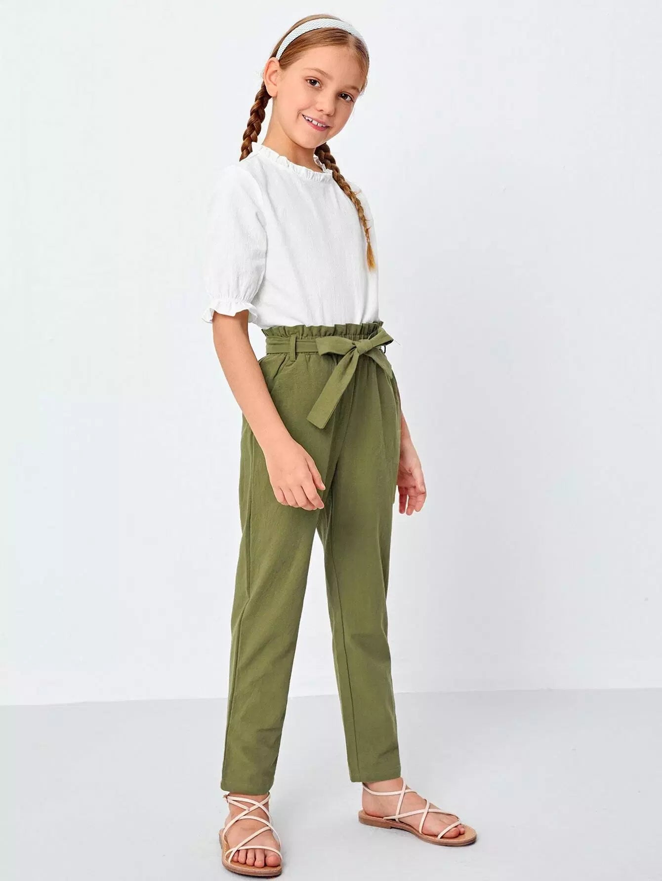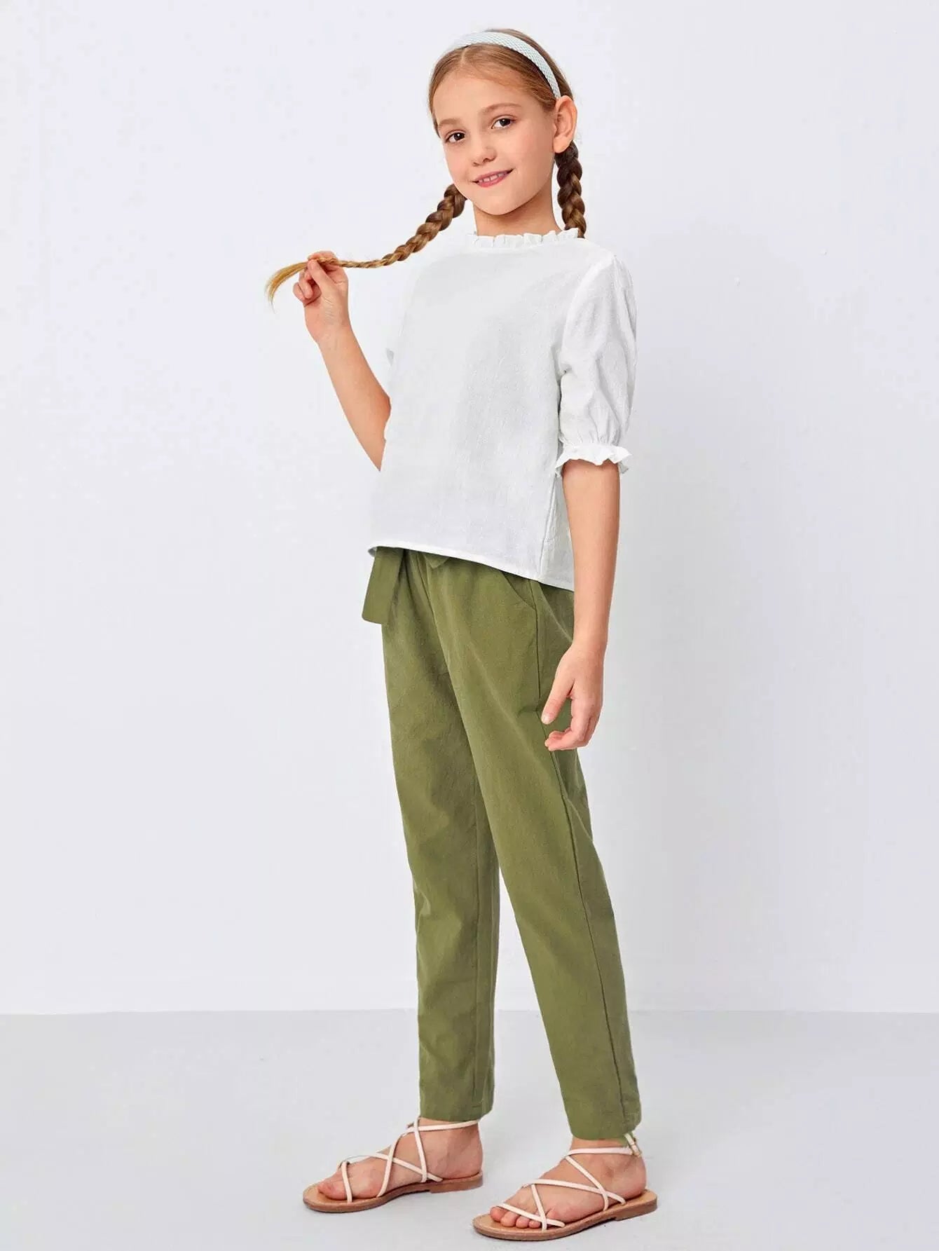 Girls Frill Mock Neck Ruffle Cuff Top & Paperbag Waist Pants Set Without Belt