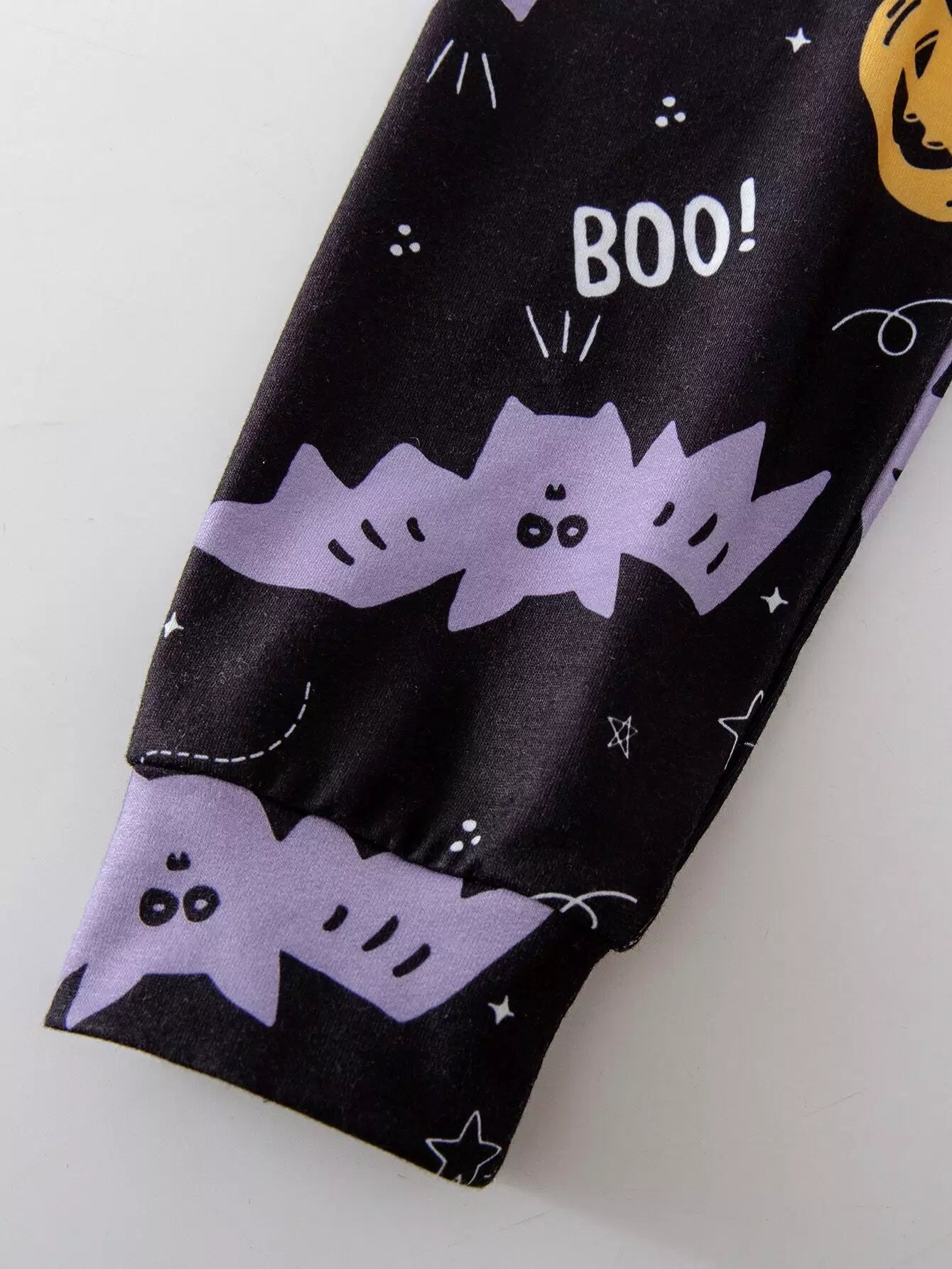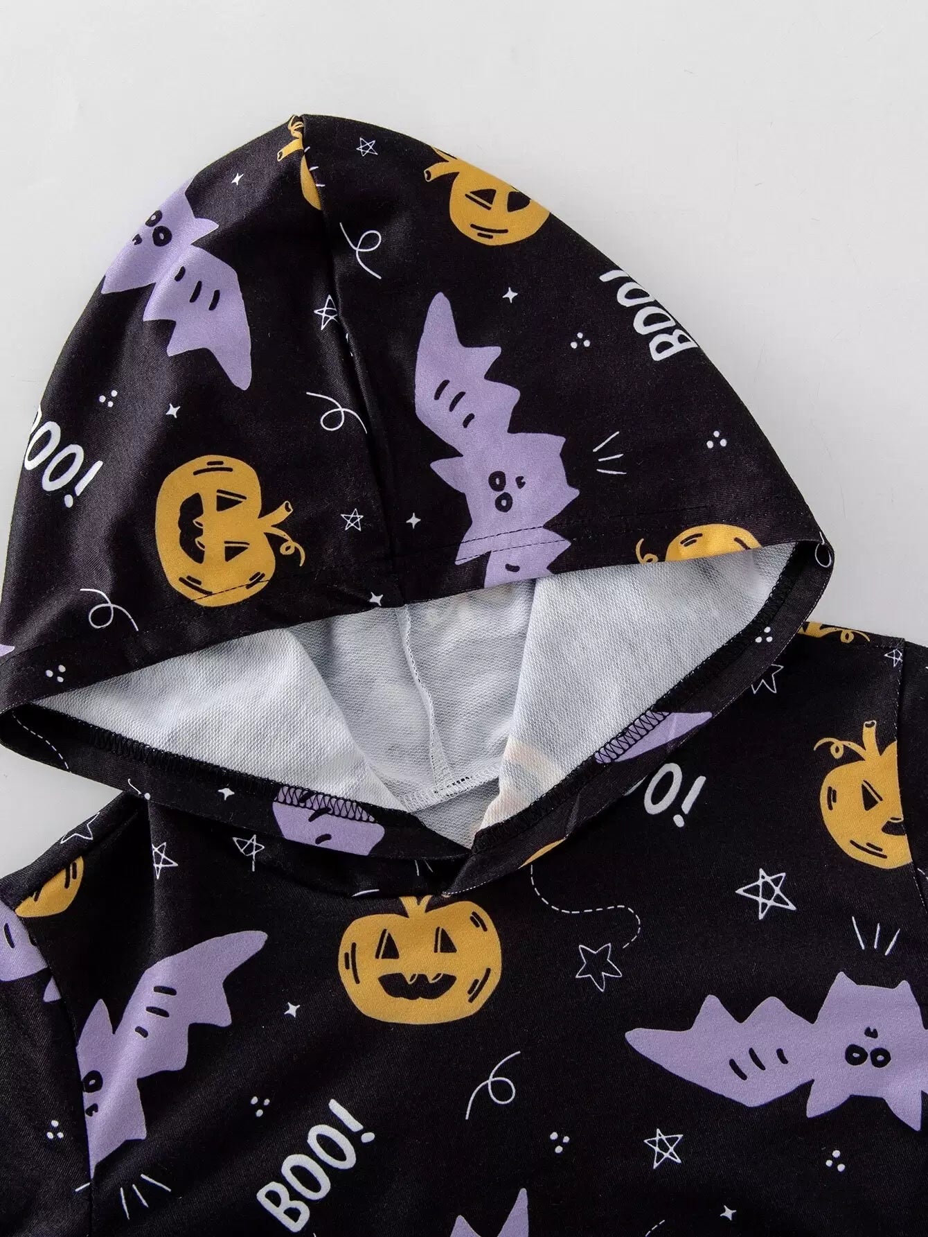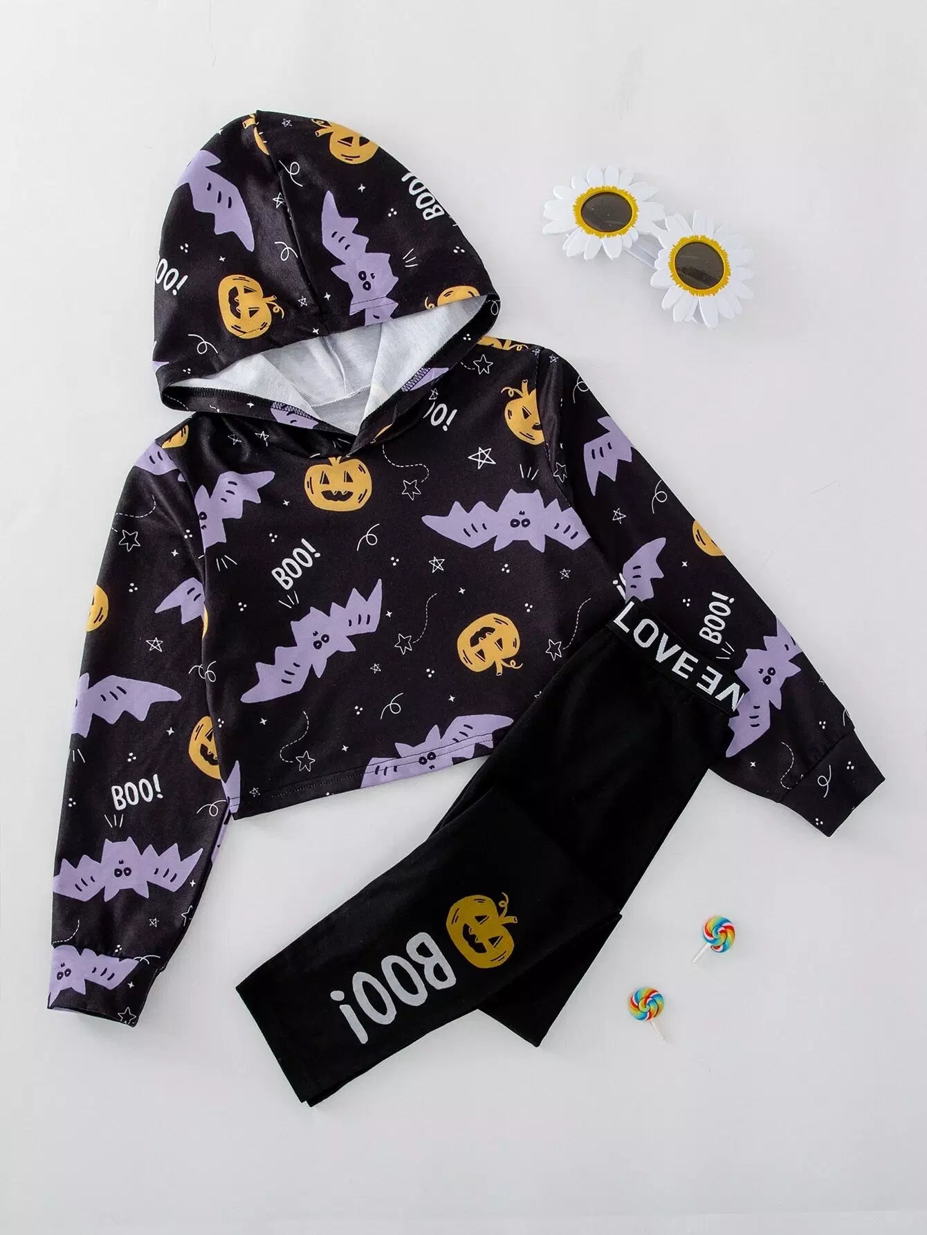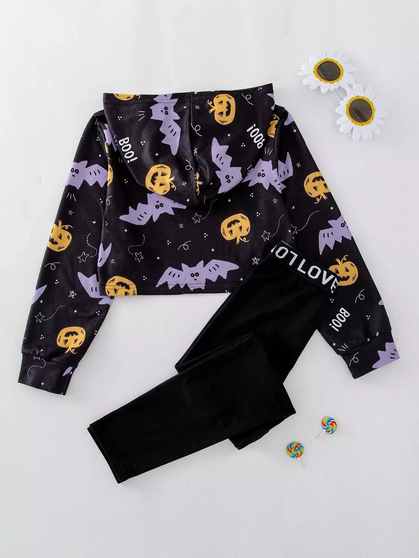 Girls Halloween Pumpkin & Bat Print Hoodie & Leggings