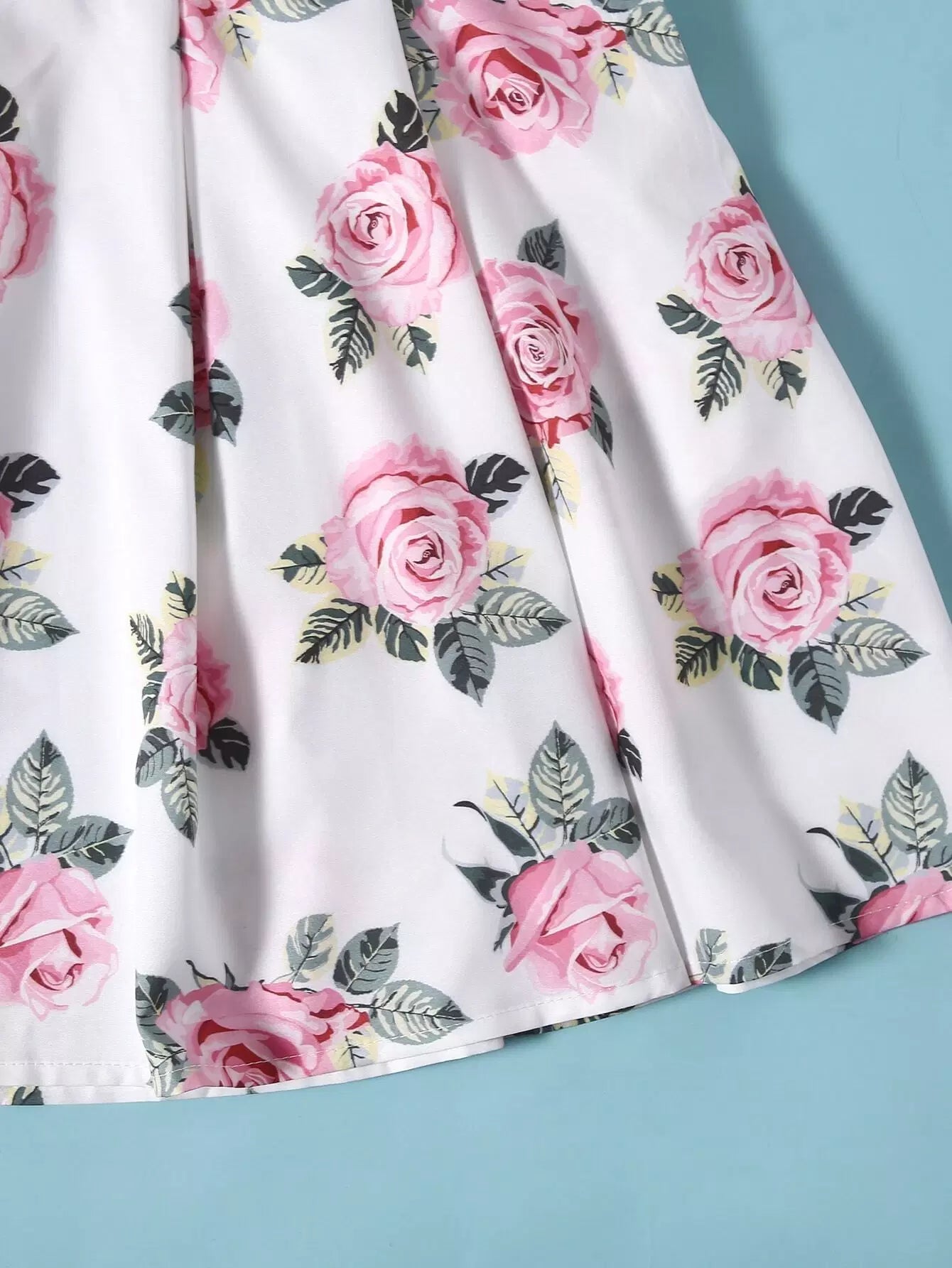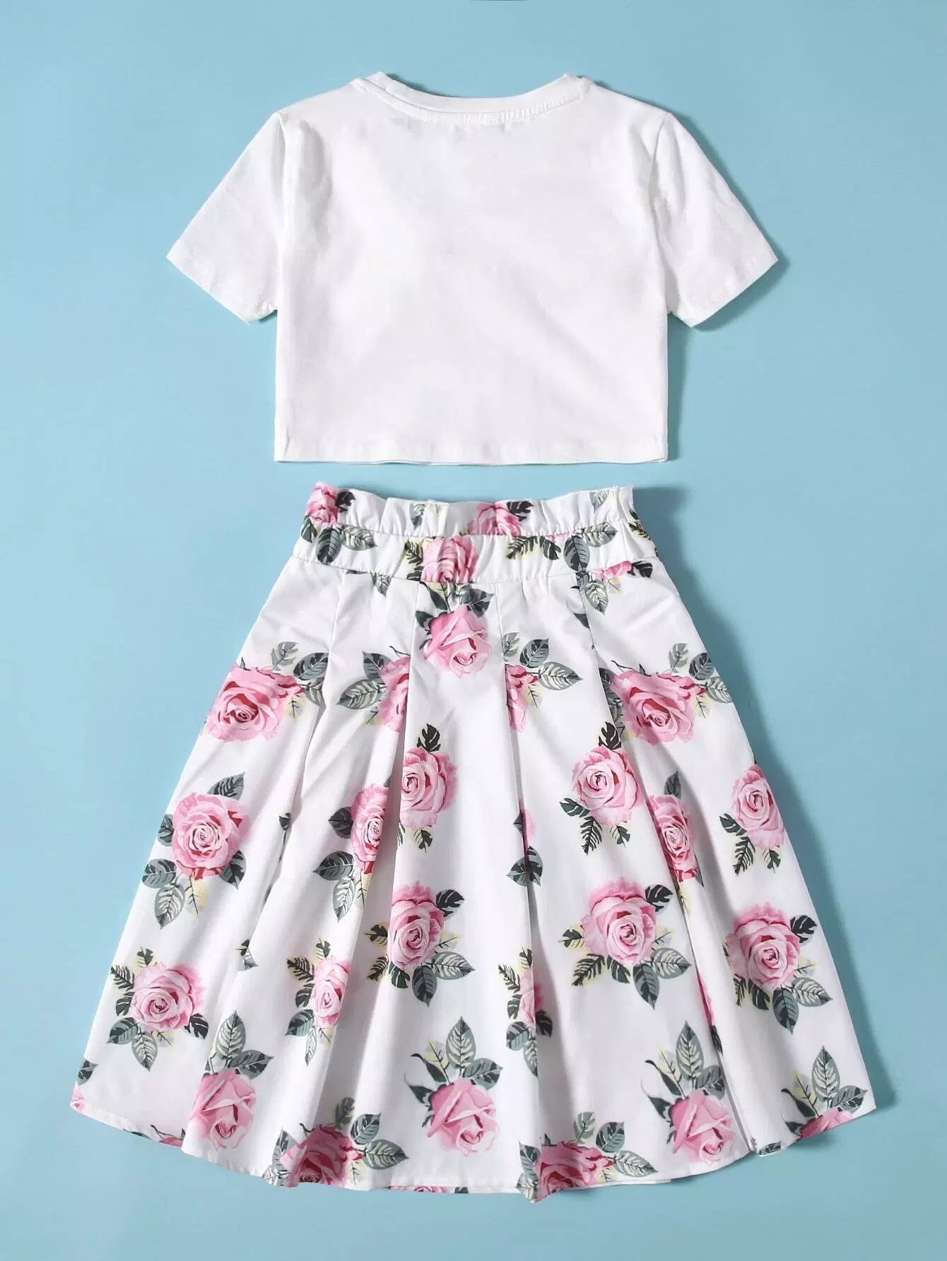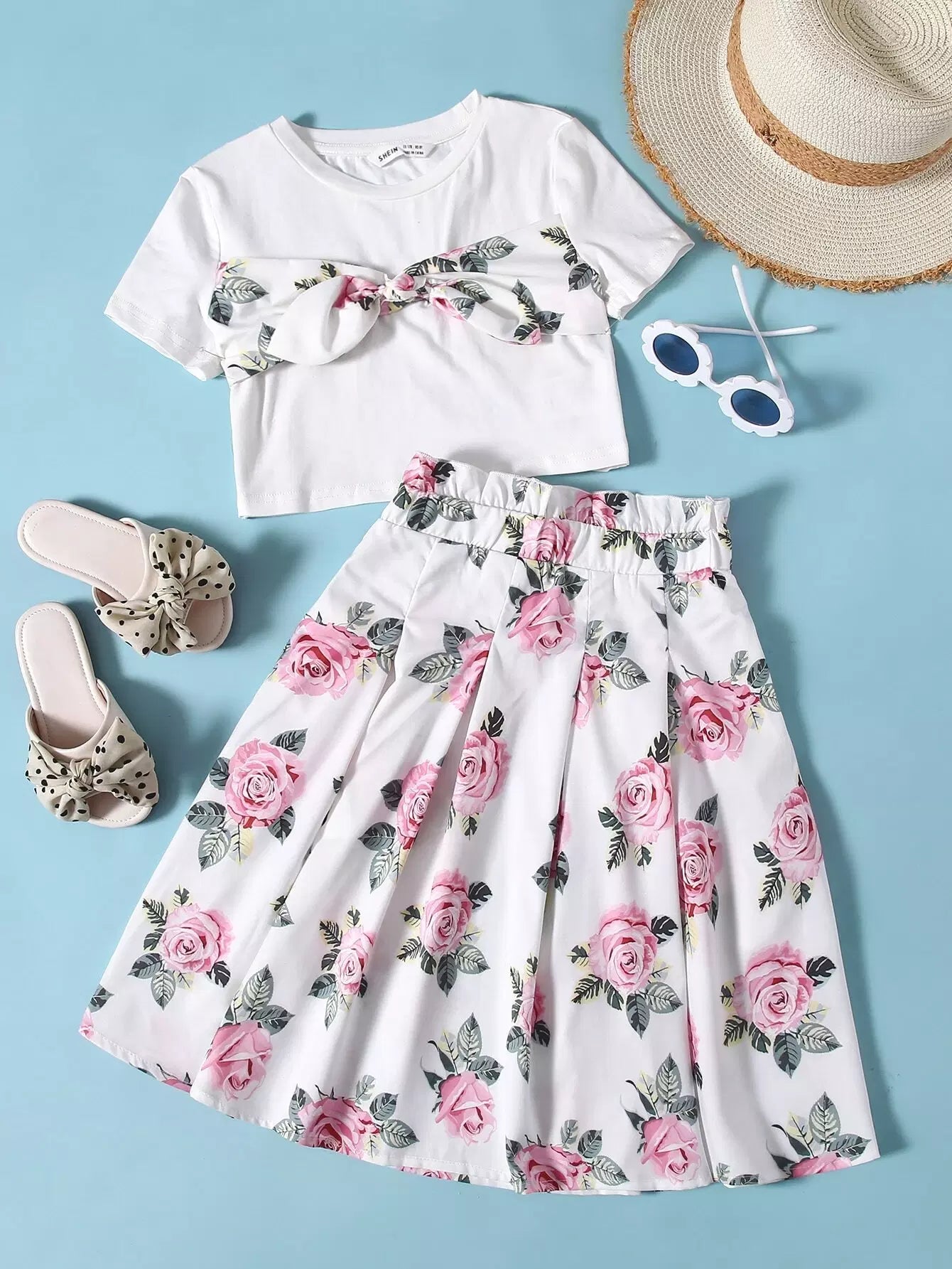 Kids - Girls Knot Front Tee & All Over Floral Paperbag Waist Skirt Set