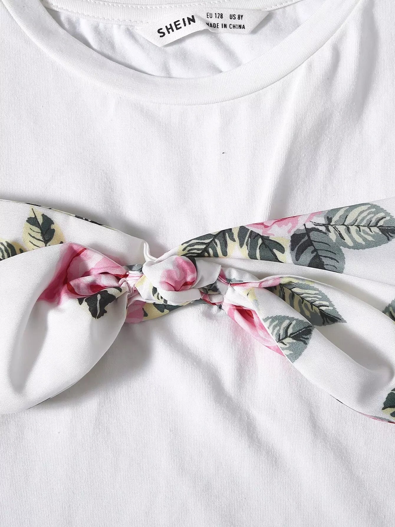 Girls Knot Front Tee & All Over Floral Paperbag Waist Skirt Set