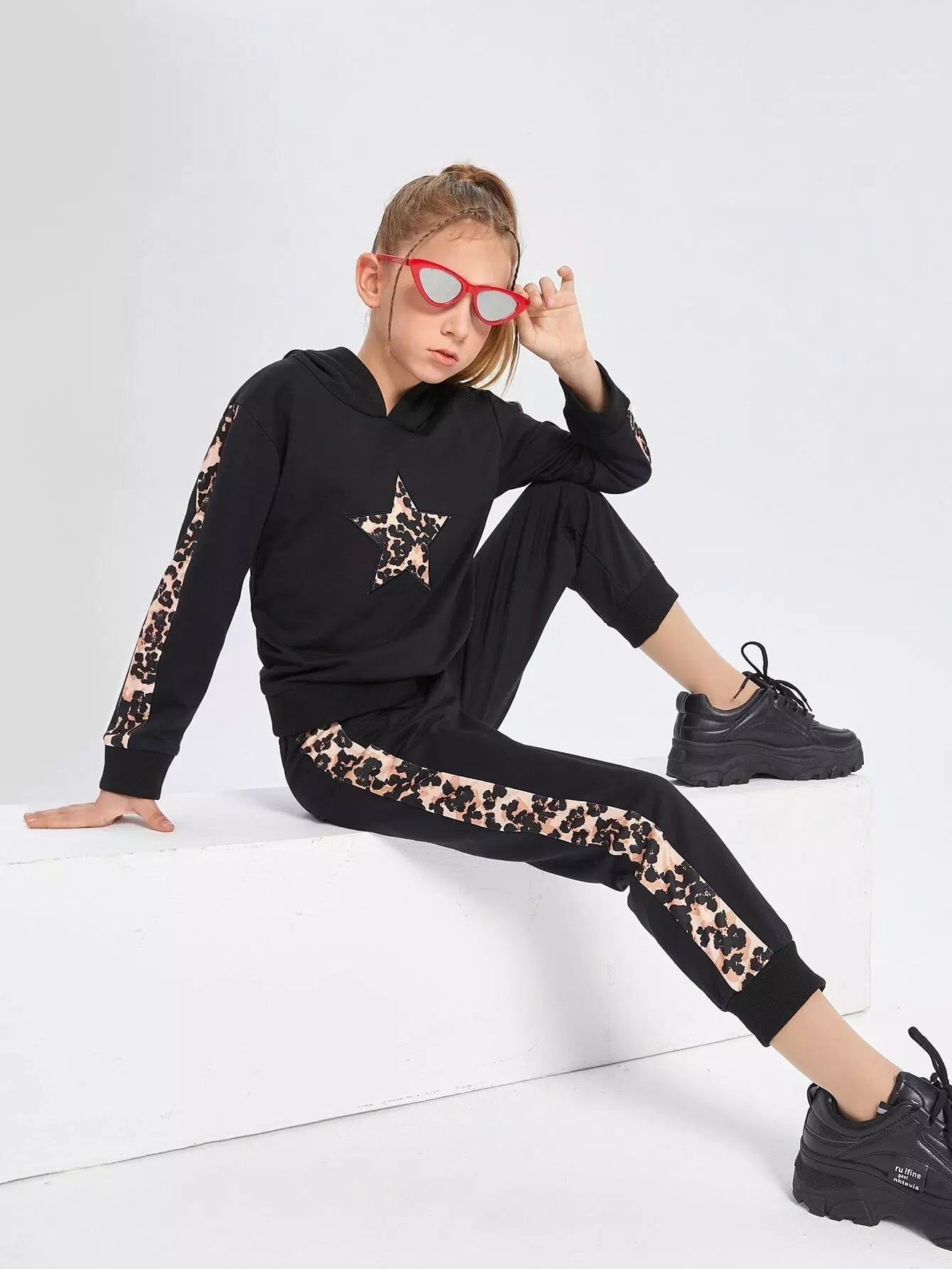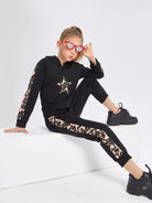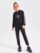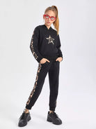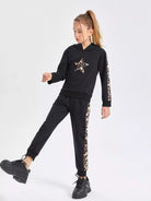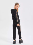 Girls Leopard Print Star Embroidery Contrast Side Seam Hoodie & Sweatpants