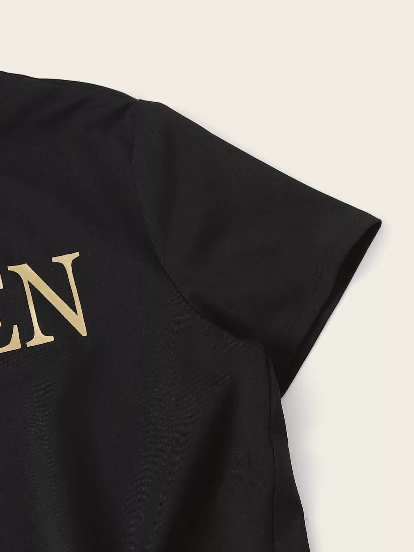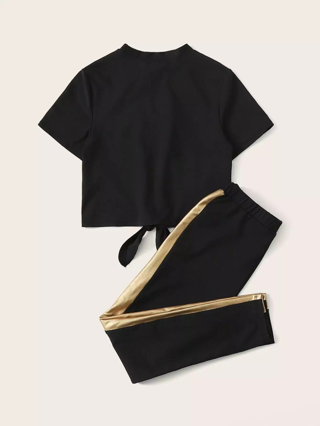 Girls Letter Knotted Tee & Contrast Sideseam Pants Set