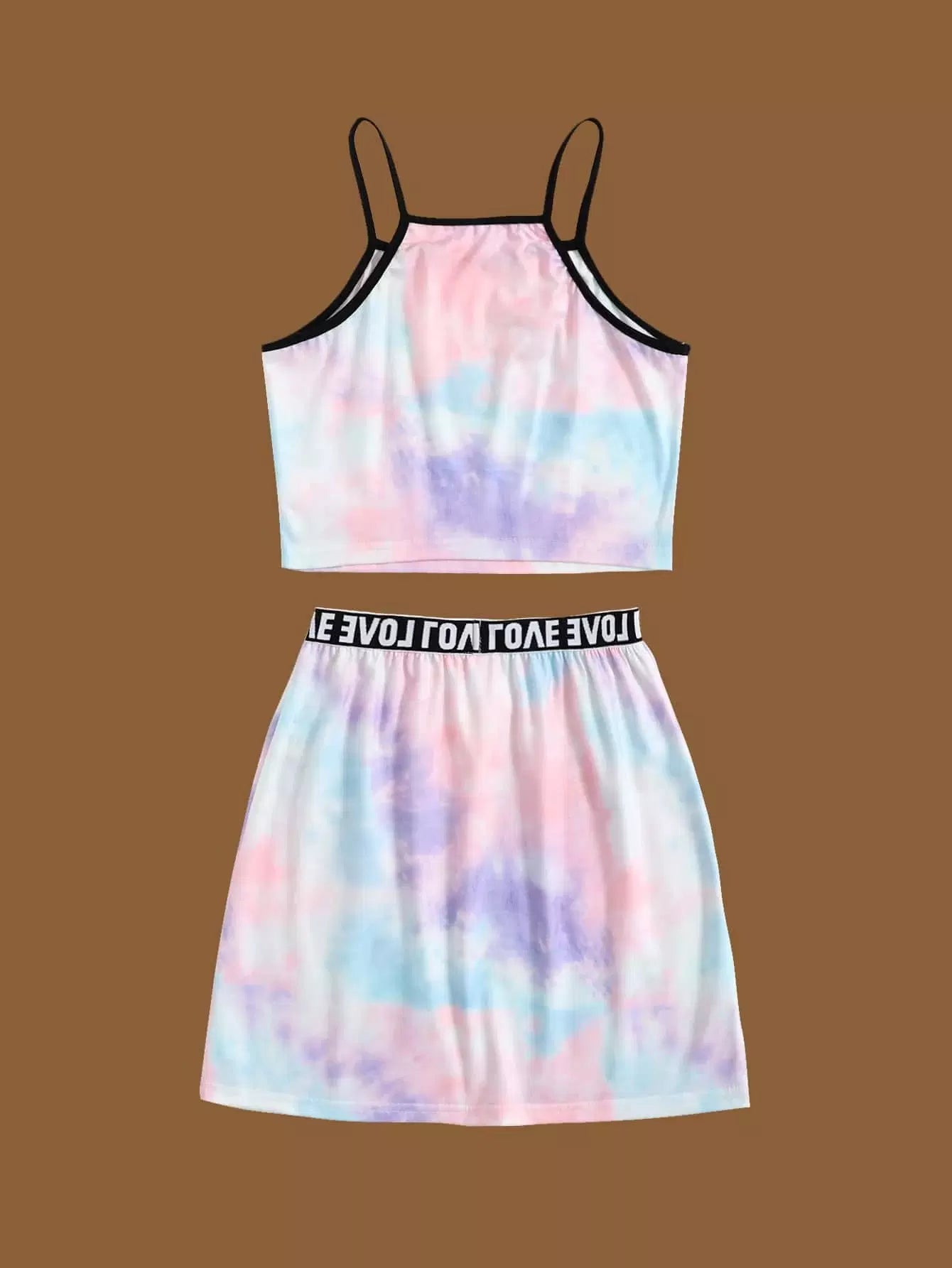 Girls Letter Print Contrast Binding Cami Top & Tie Dye Letter Tape Skirt