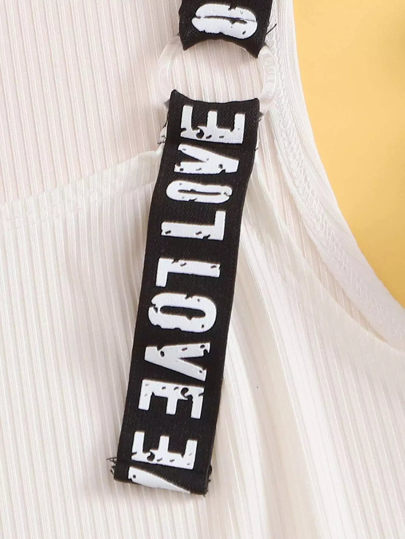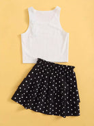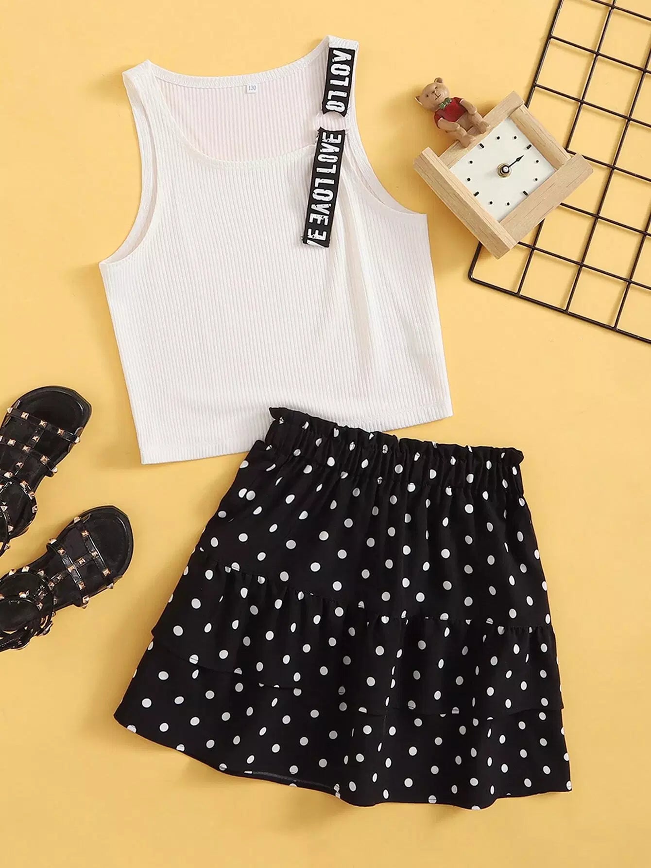 Girls Letter Tape Tank Top With Polka Dot Skirt