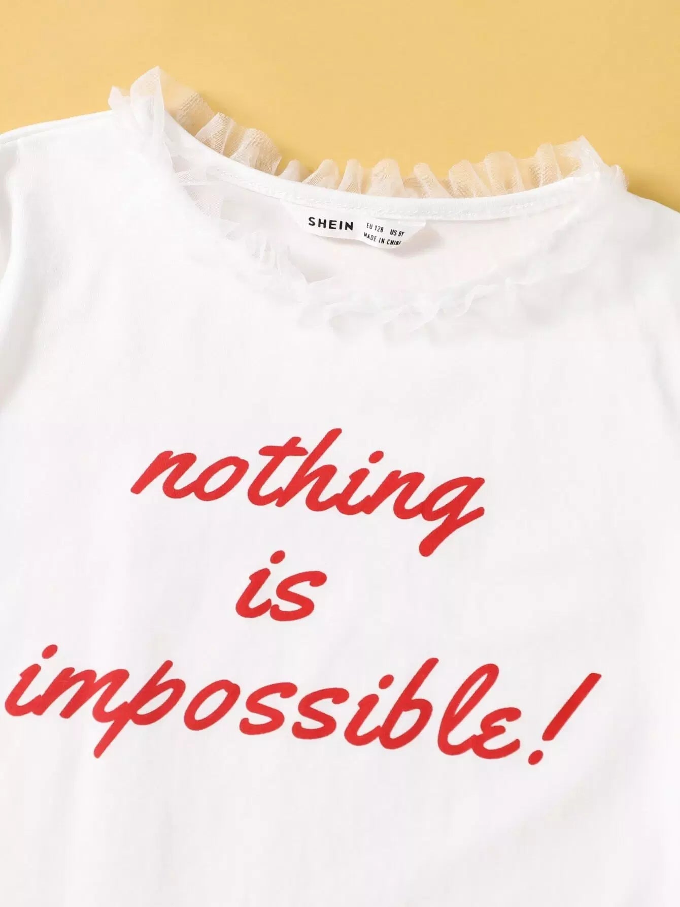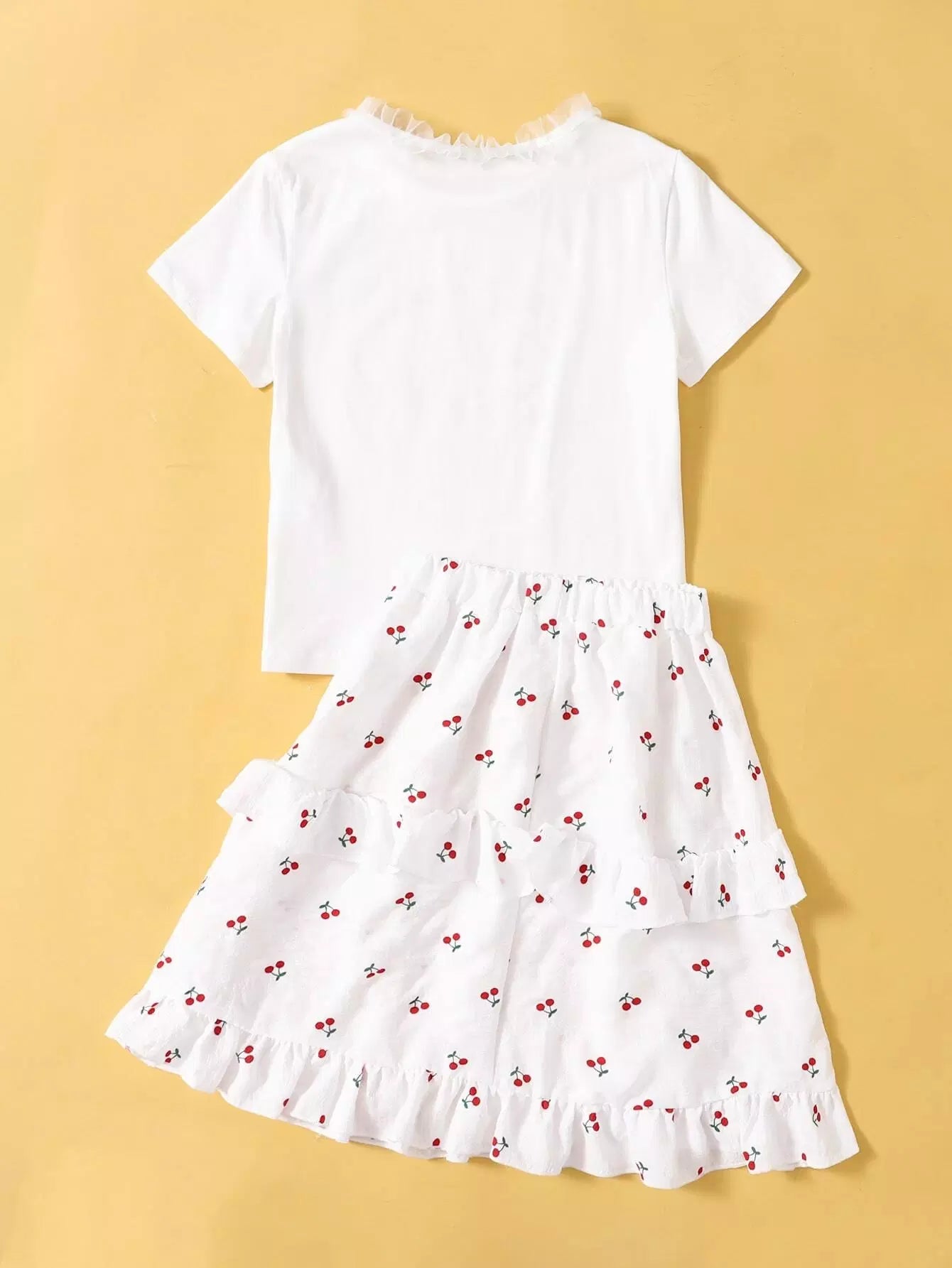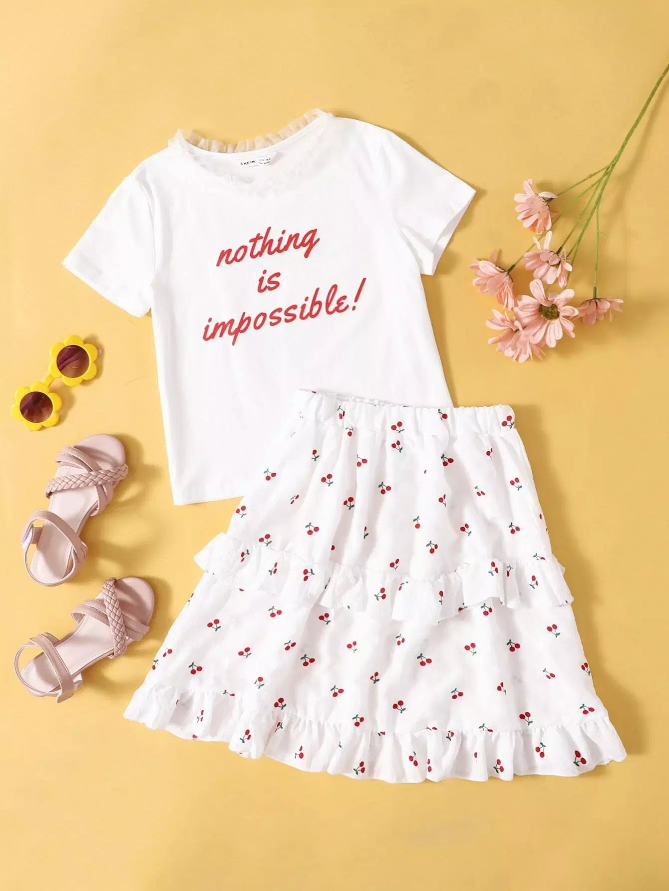 Girls Mesh Neck Slogan Graphic Top & Cherry Print Skirt Set