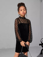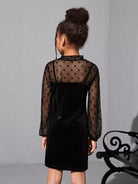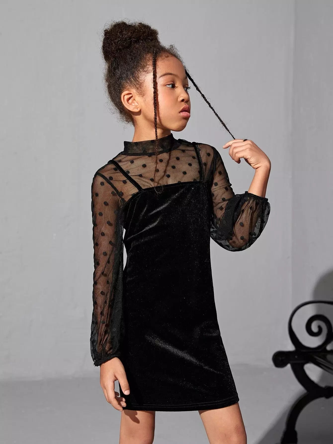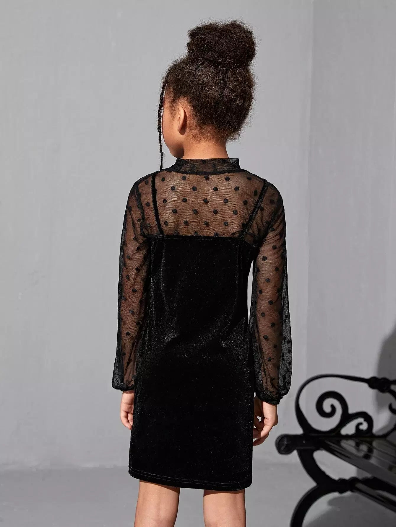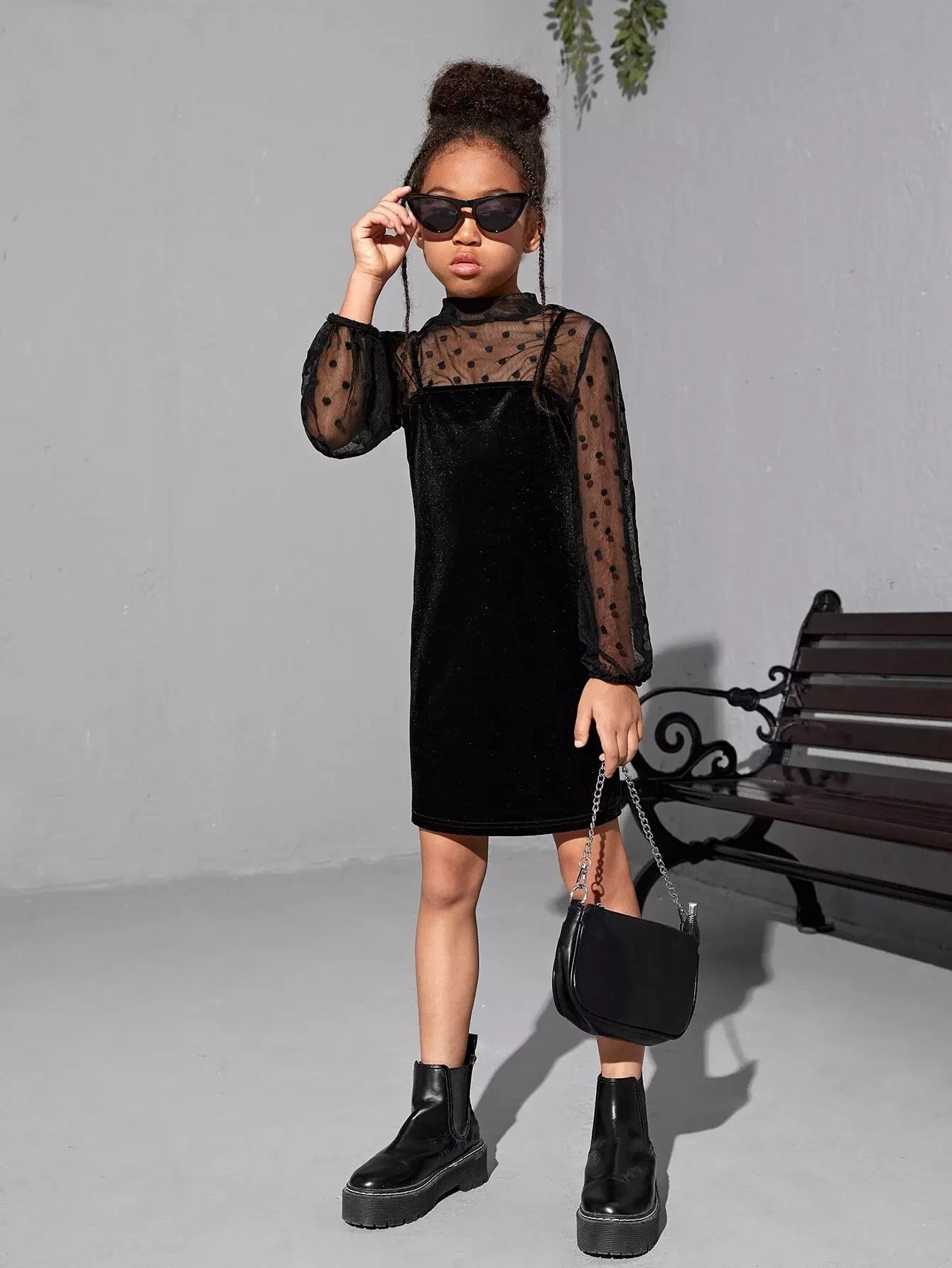 Girls Mock Neck Dobby Mesh Top & Velvet Cami Dress