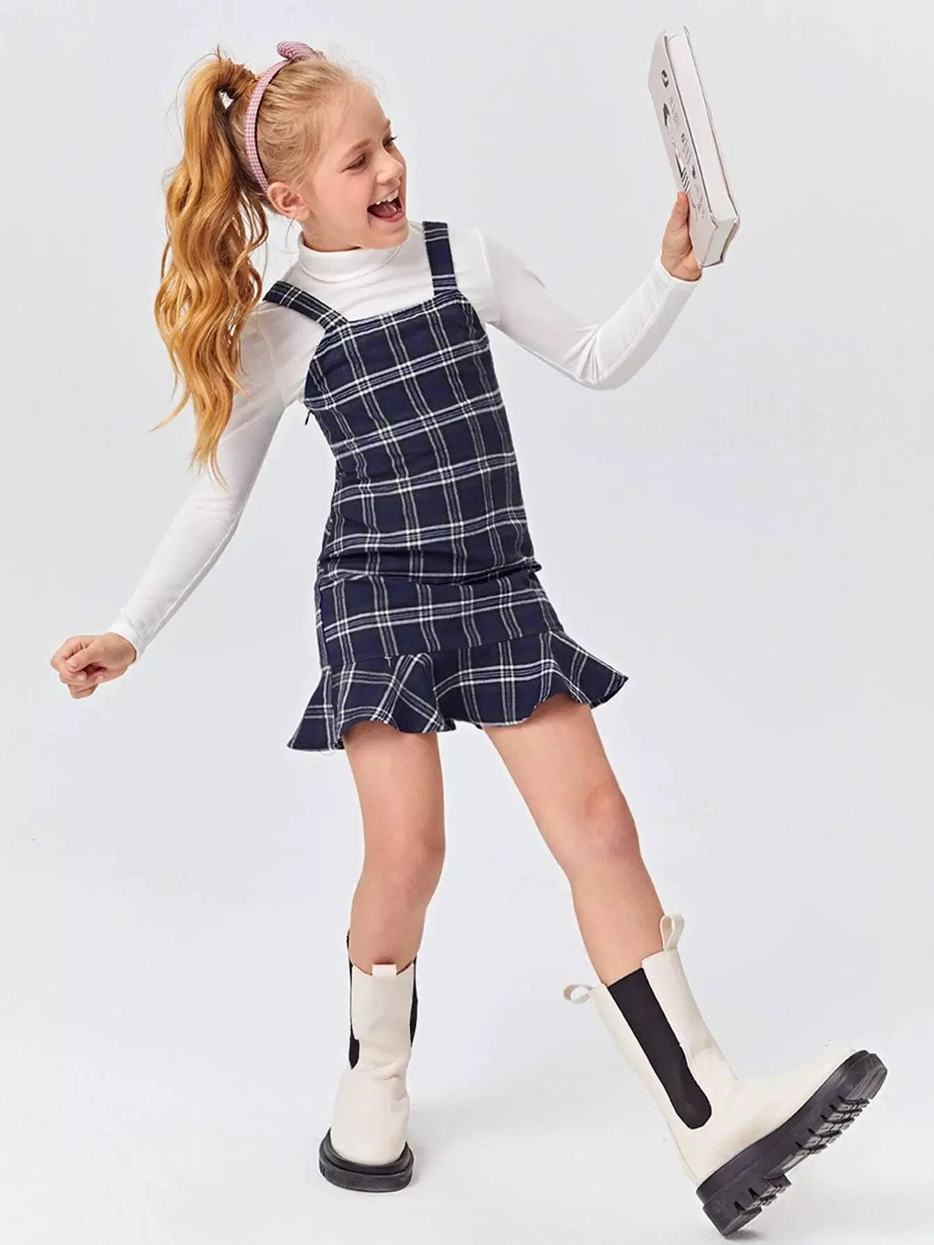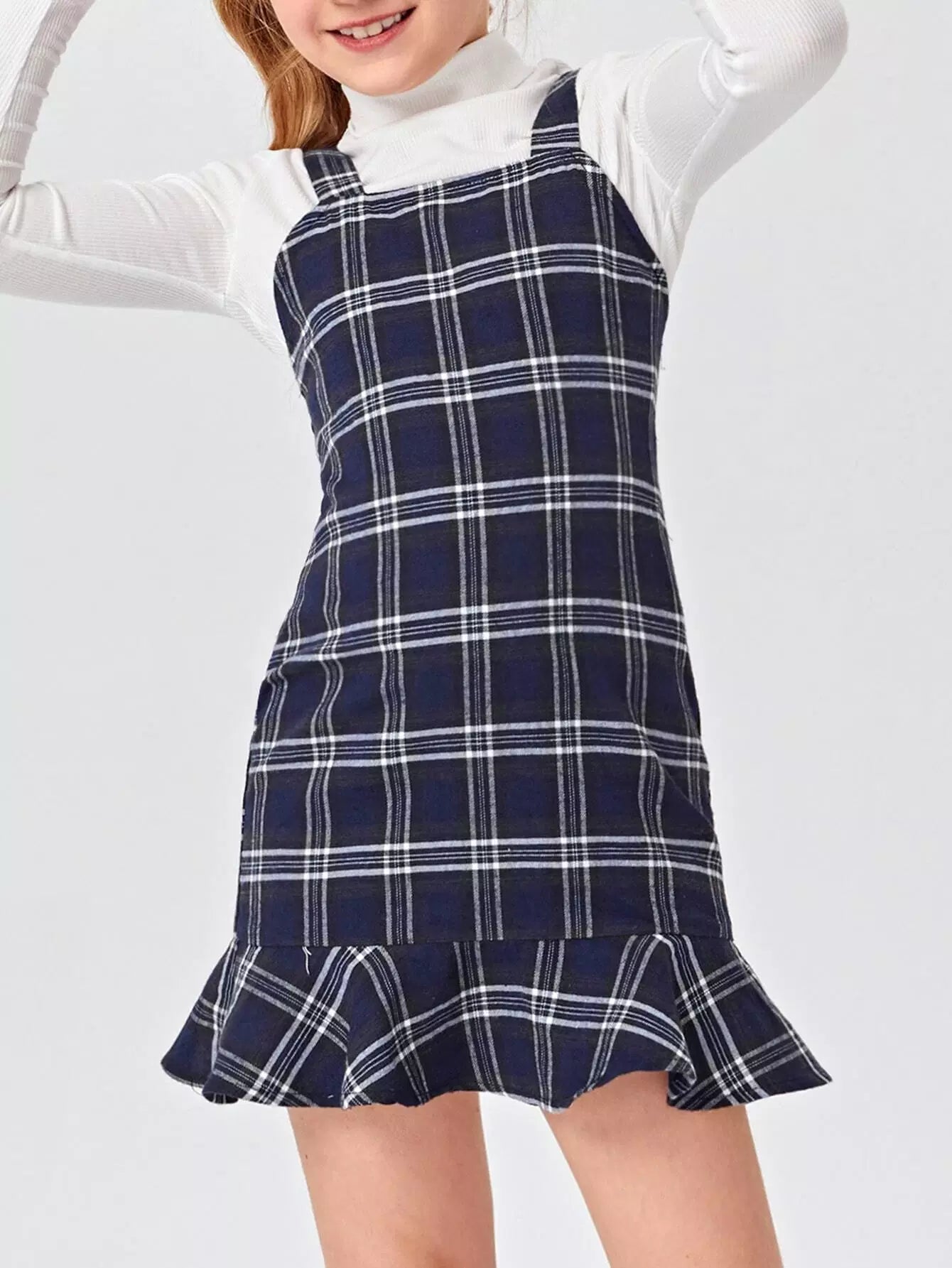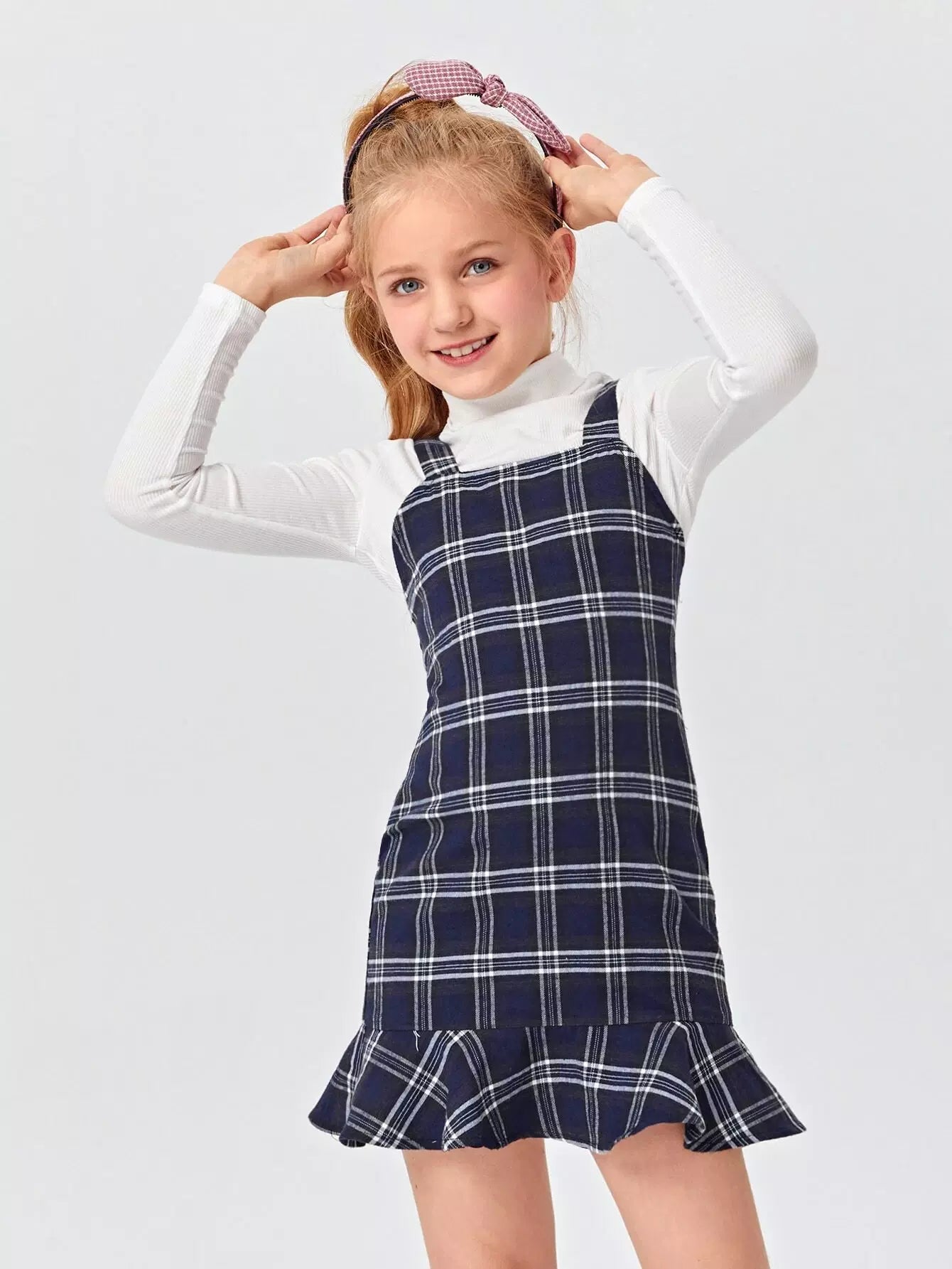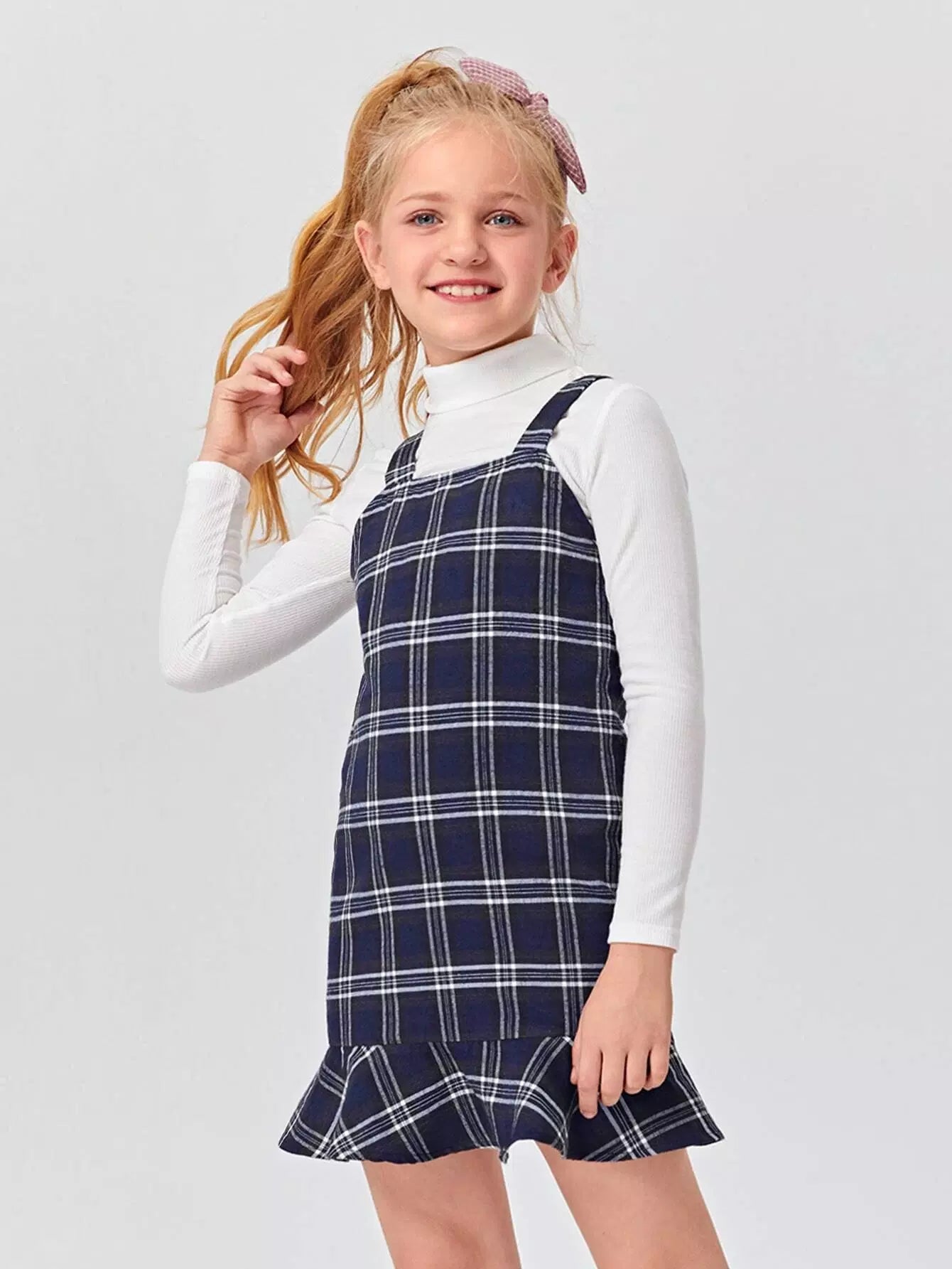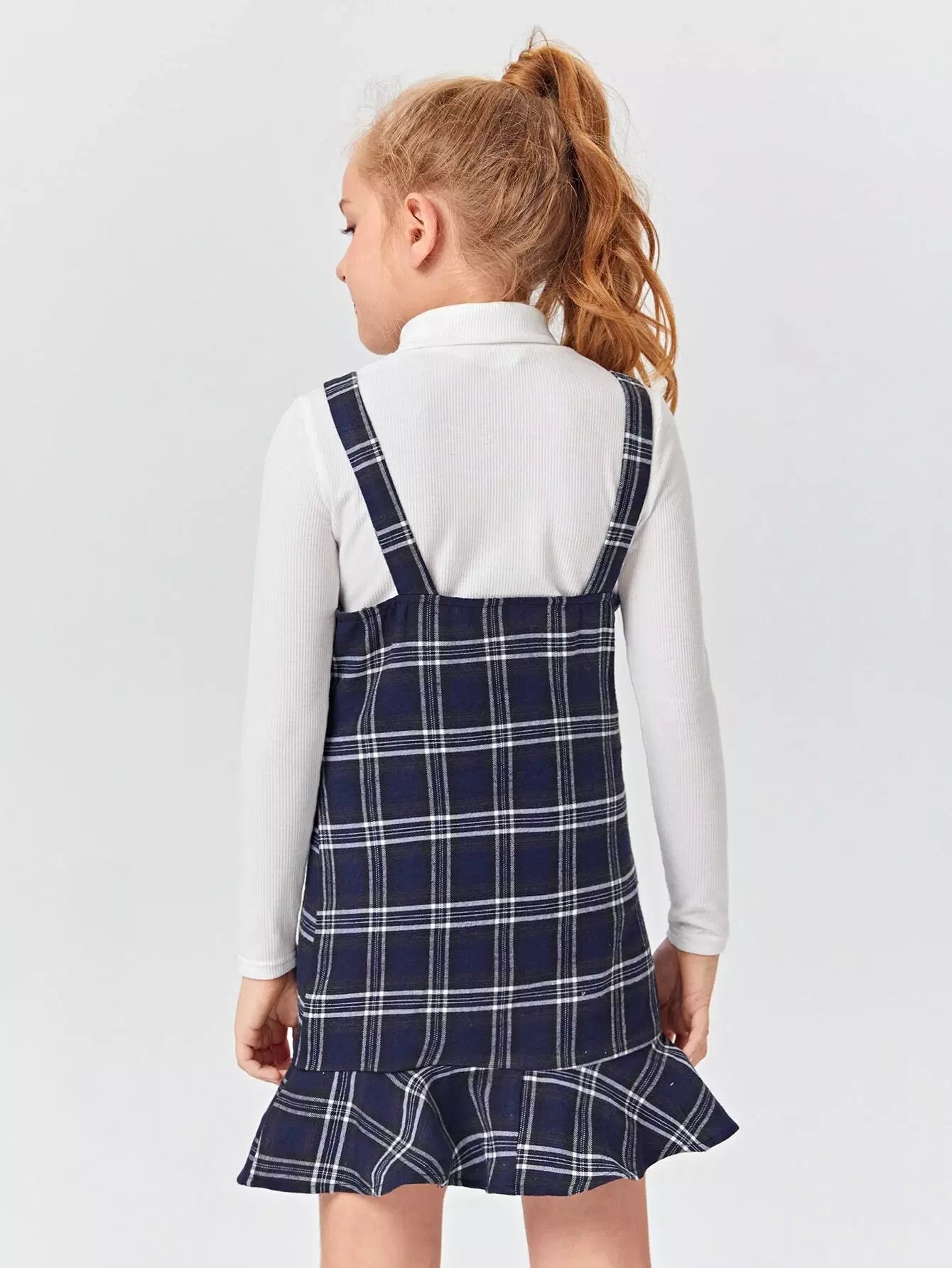 Girls Rolled Neck Tee With Ruffle Hem Overall Dress