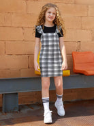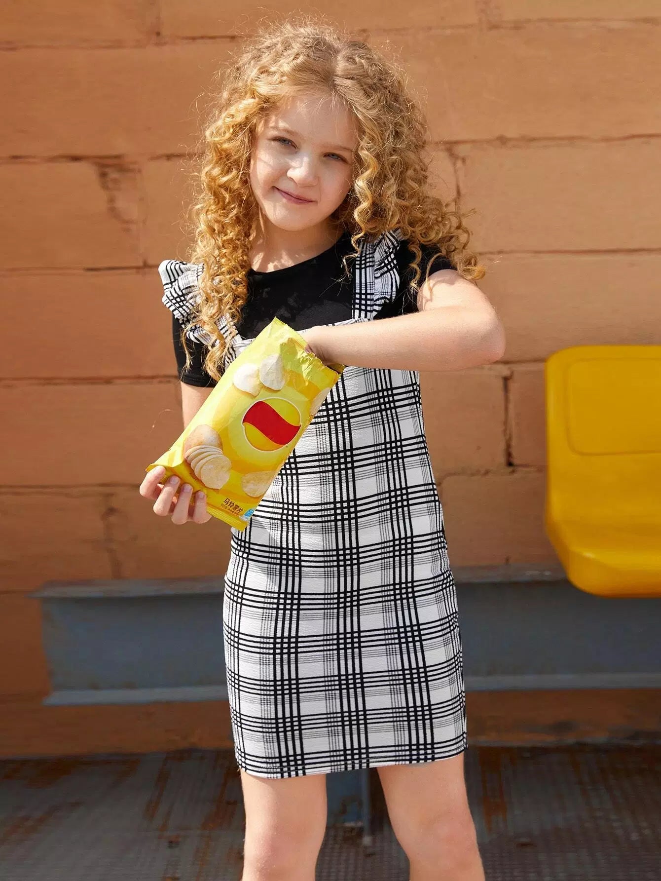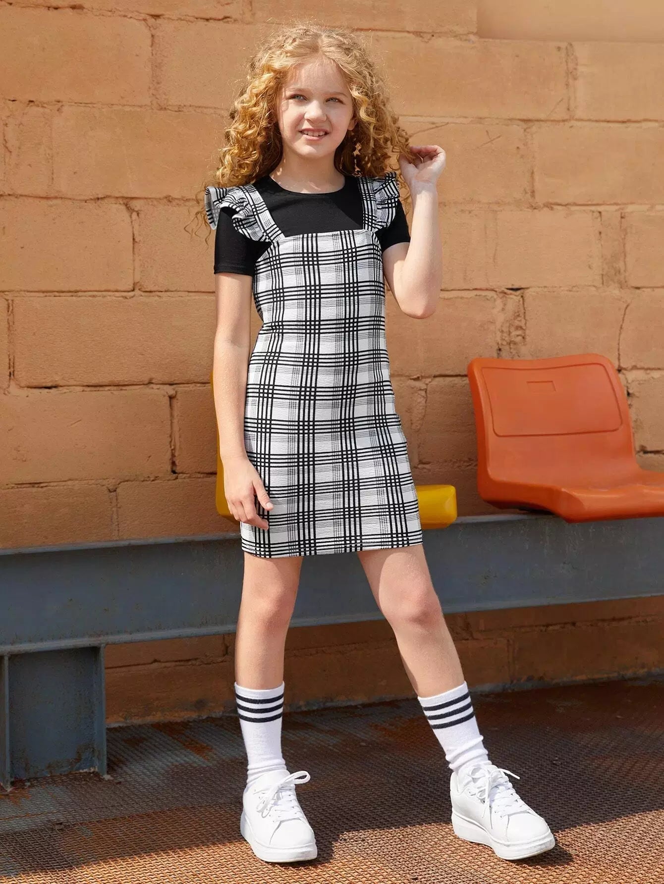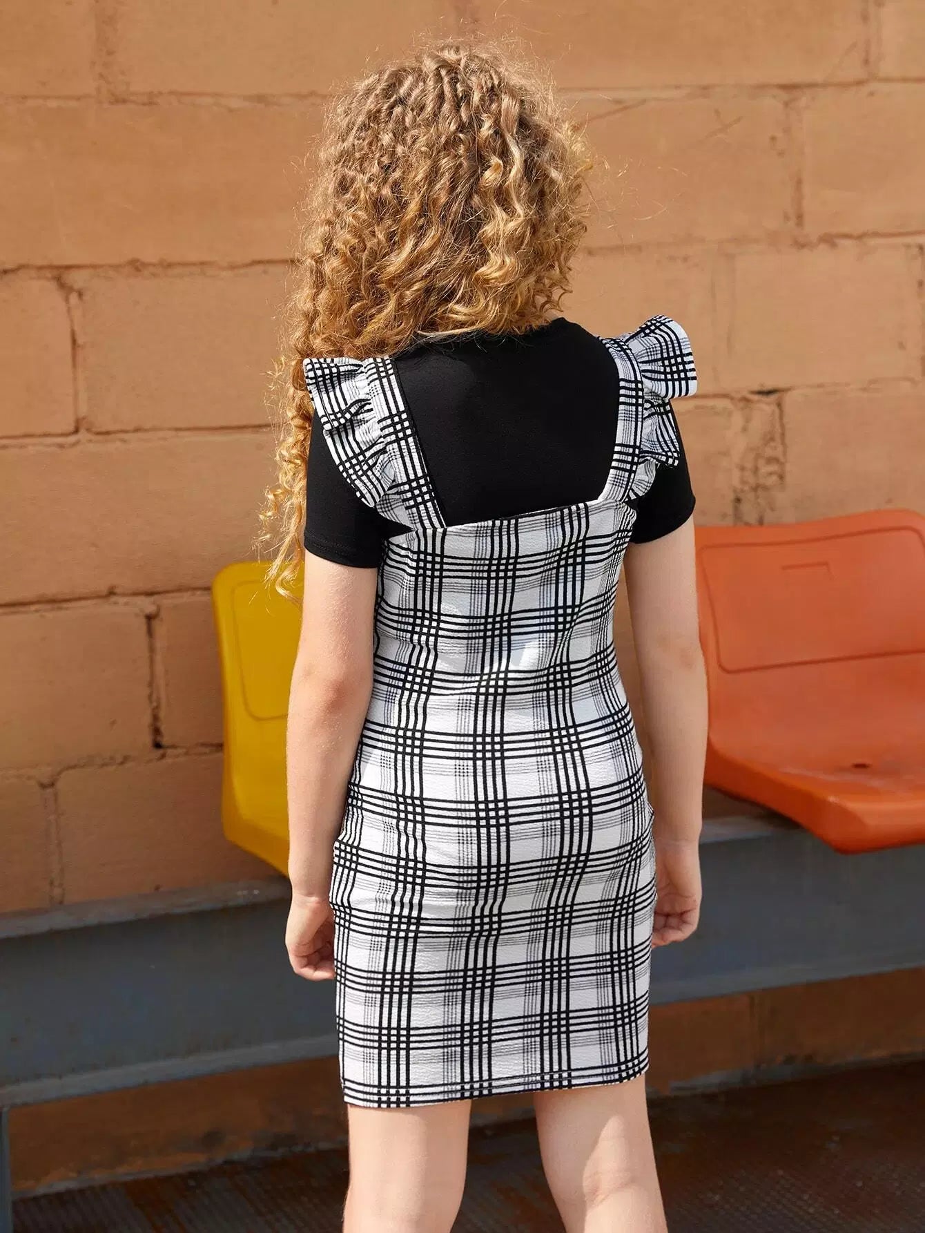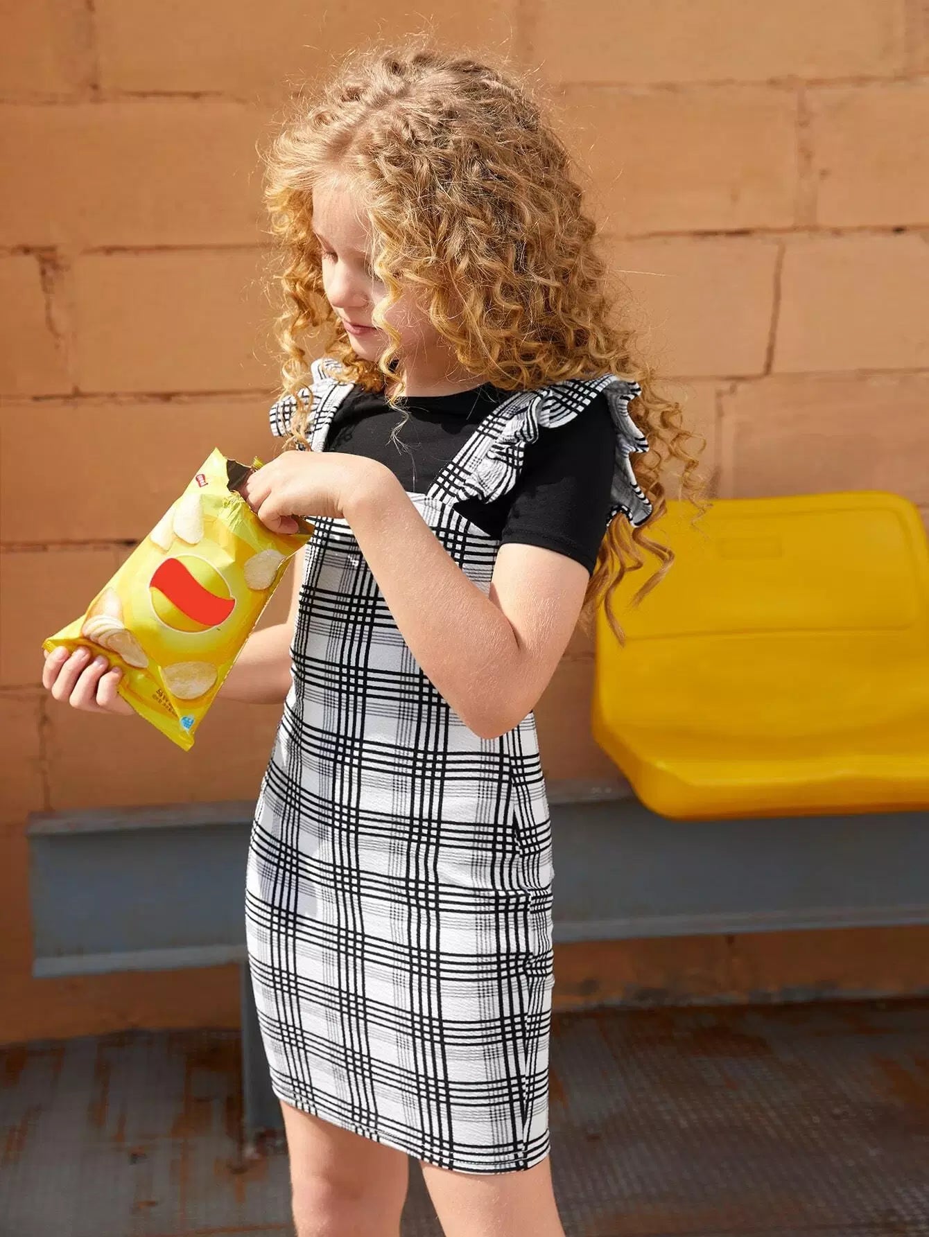 Girls Ruffle Armhole Plaid Overall Dress With Tee