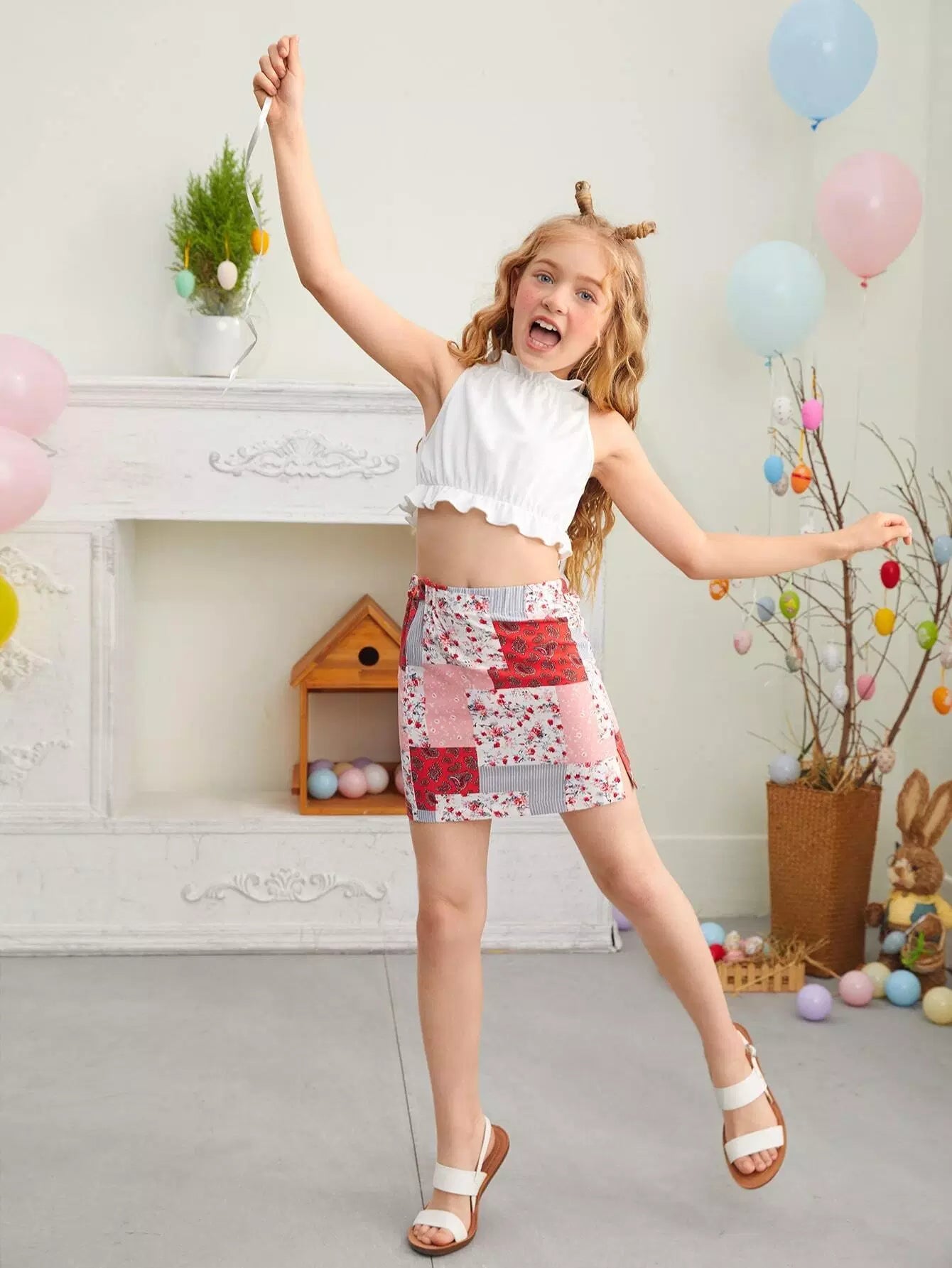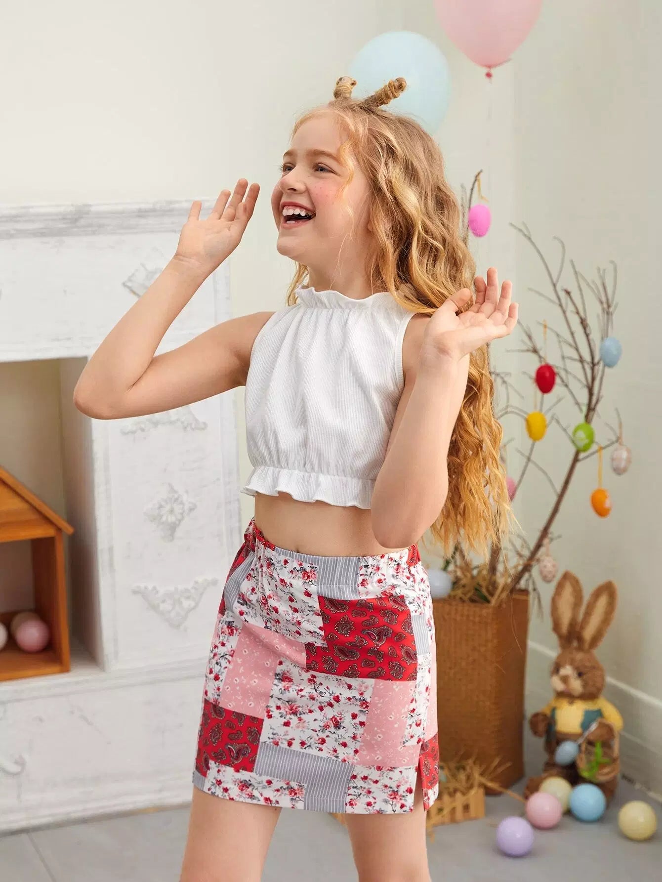 Girls Ruffle Trim Tank Top & Patchwork Print Skirt Set