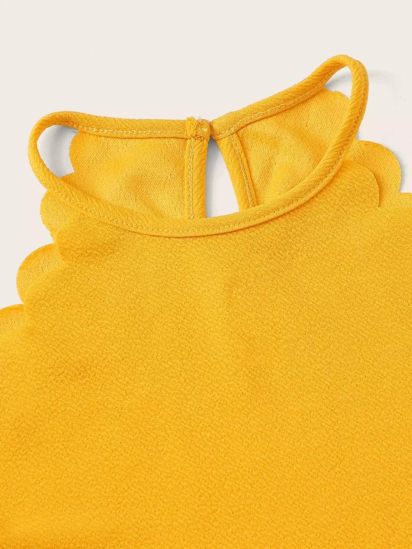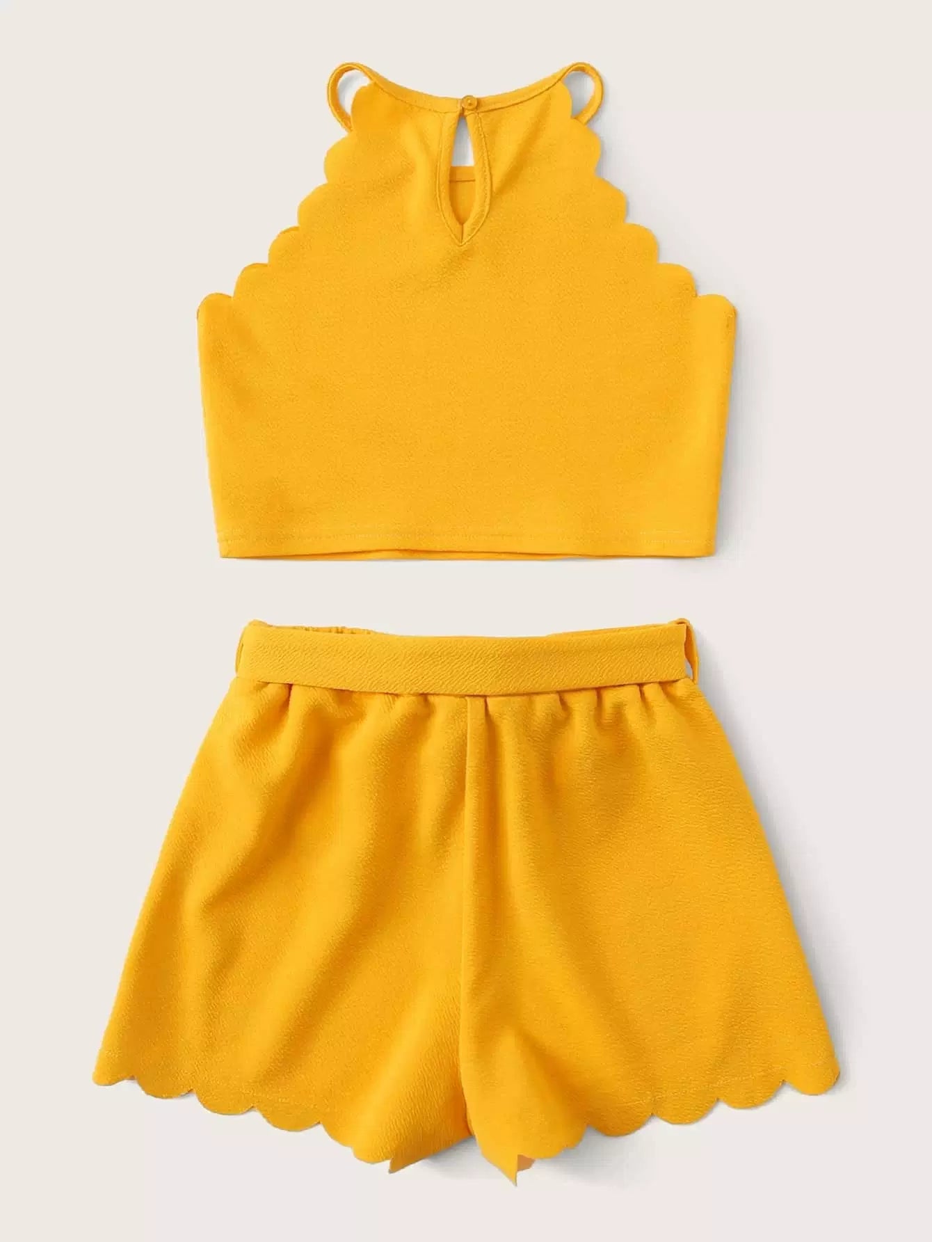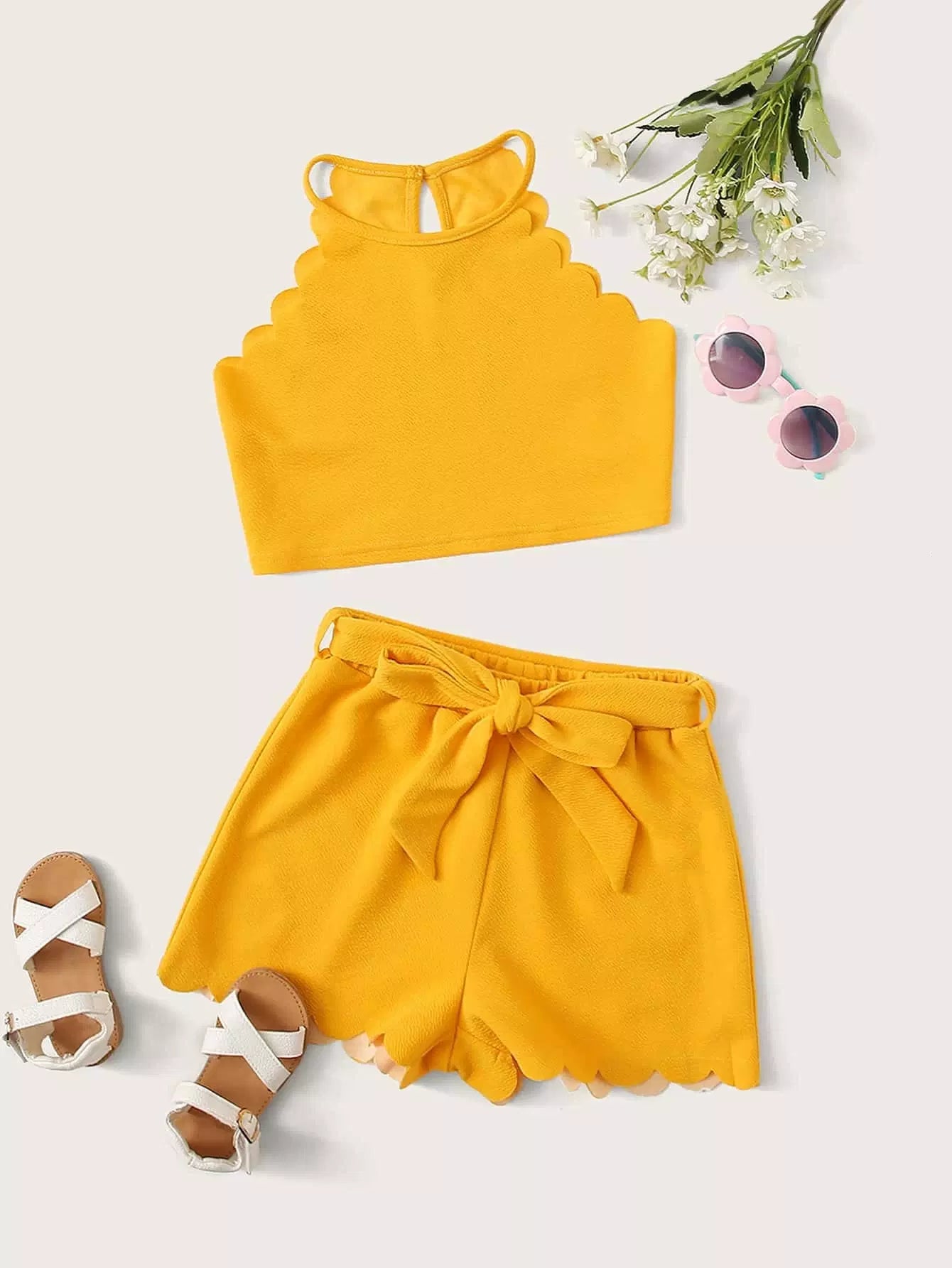 Girls Scallop Trim Halter Top & Shorts Set Without Belt