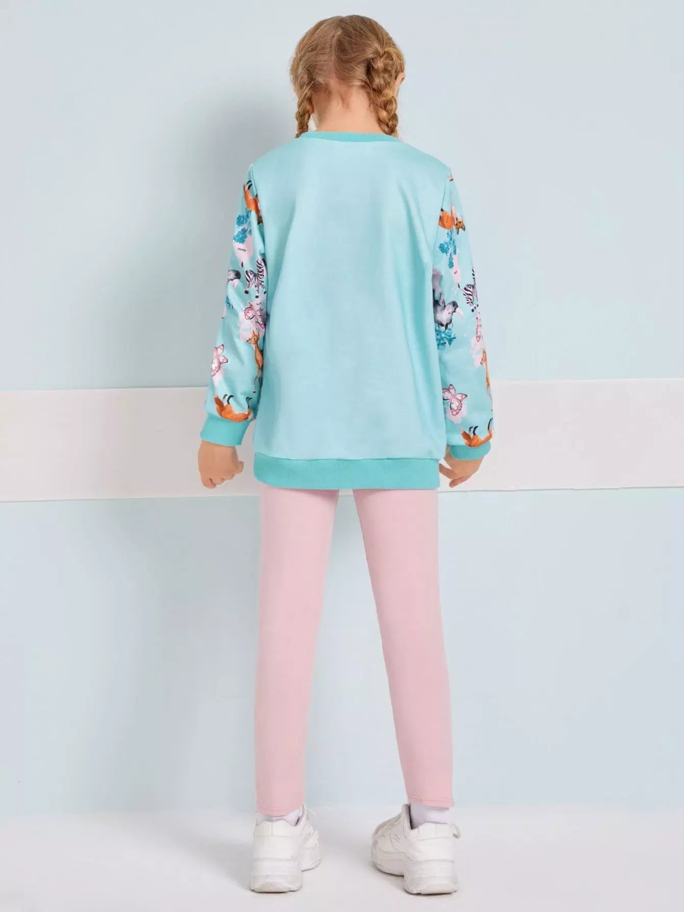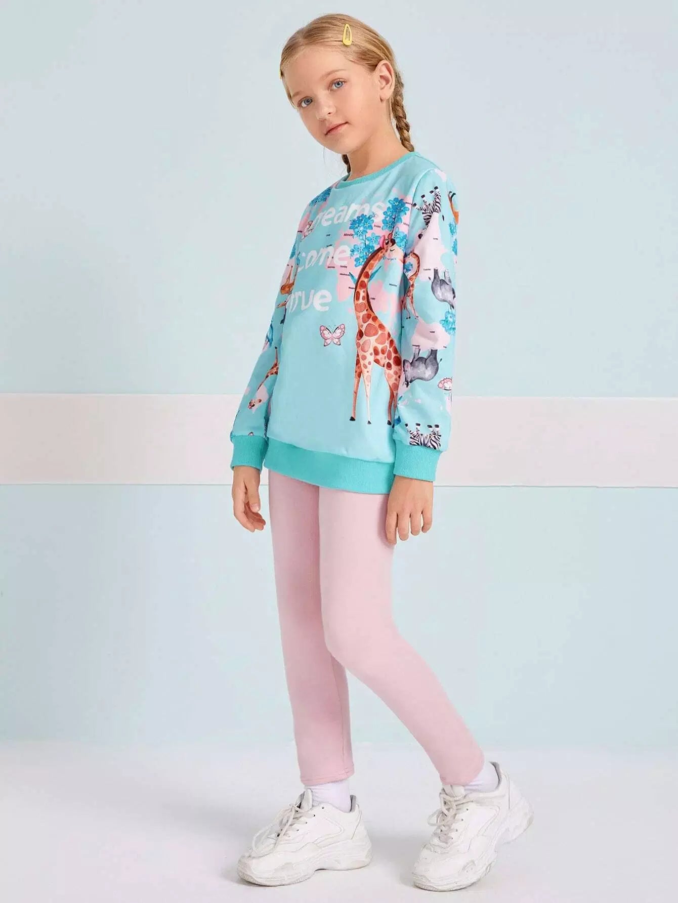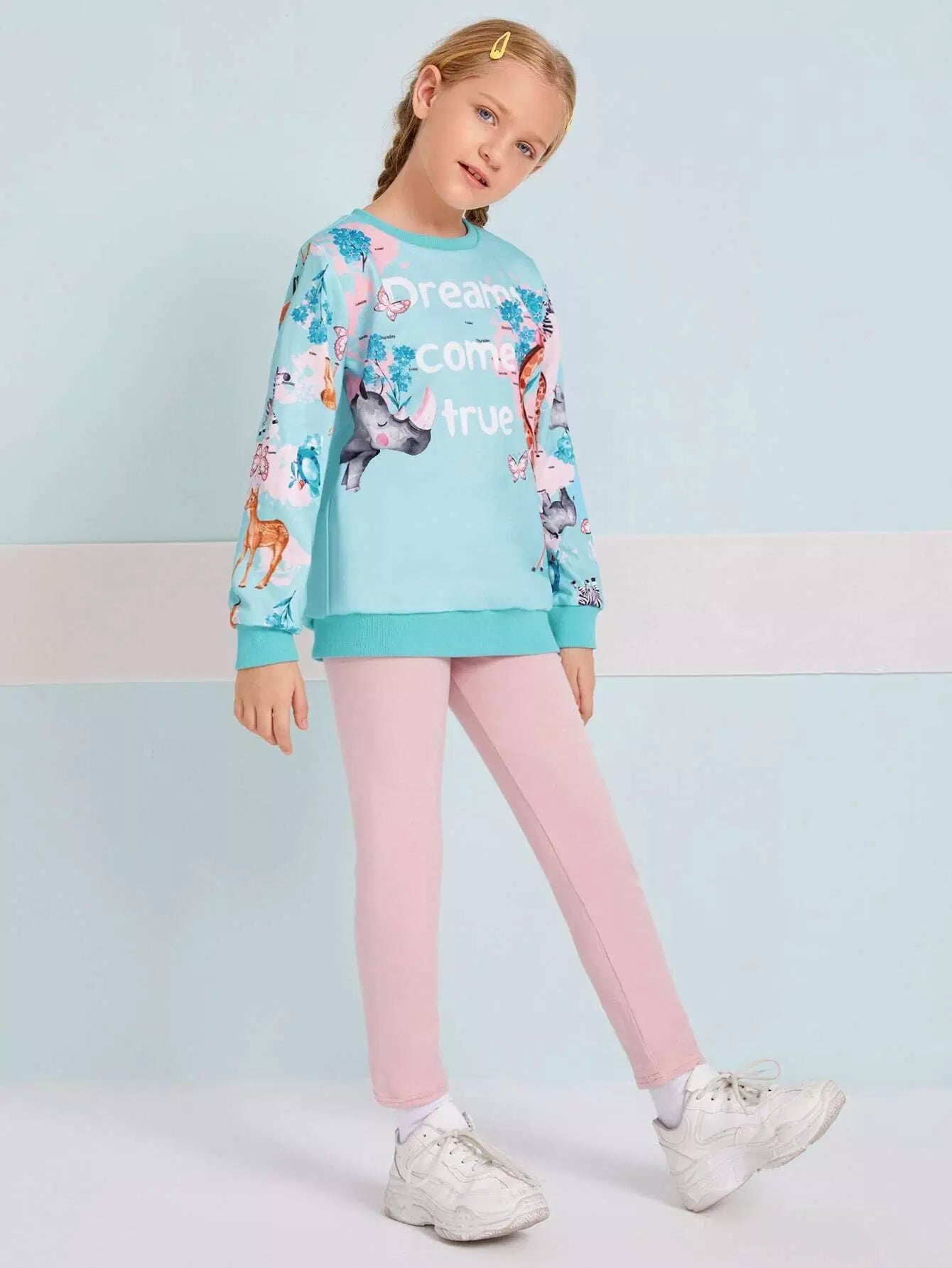 Girls Slogan and Animal Print Pullover & Leggings Set
