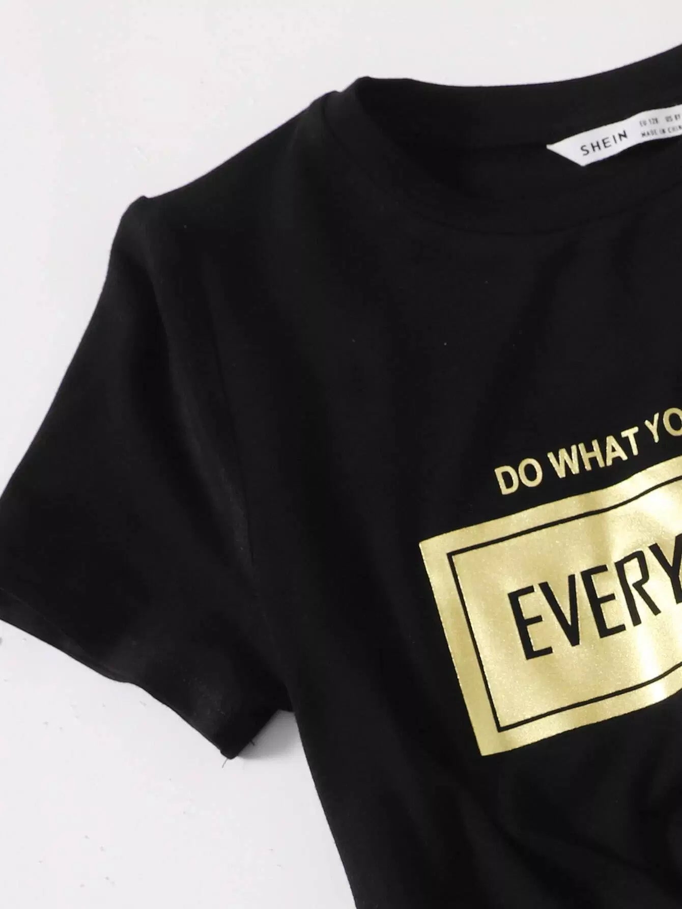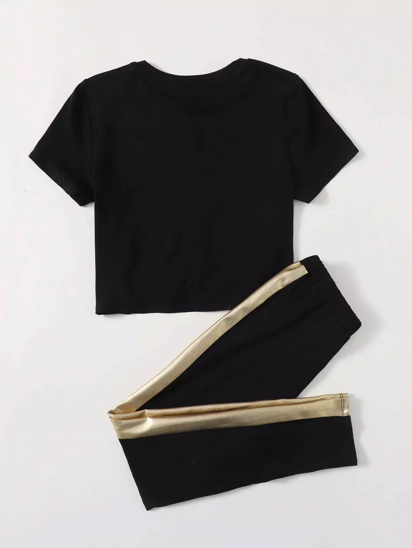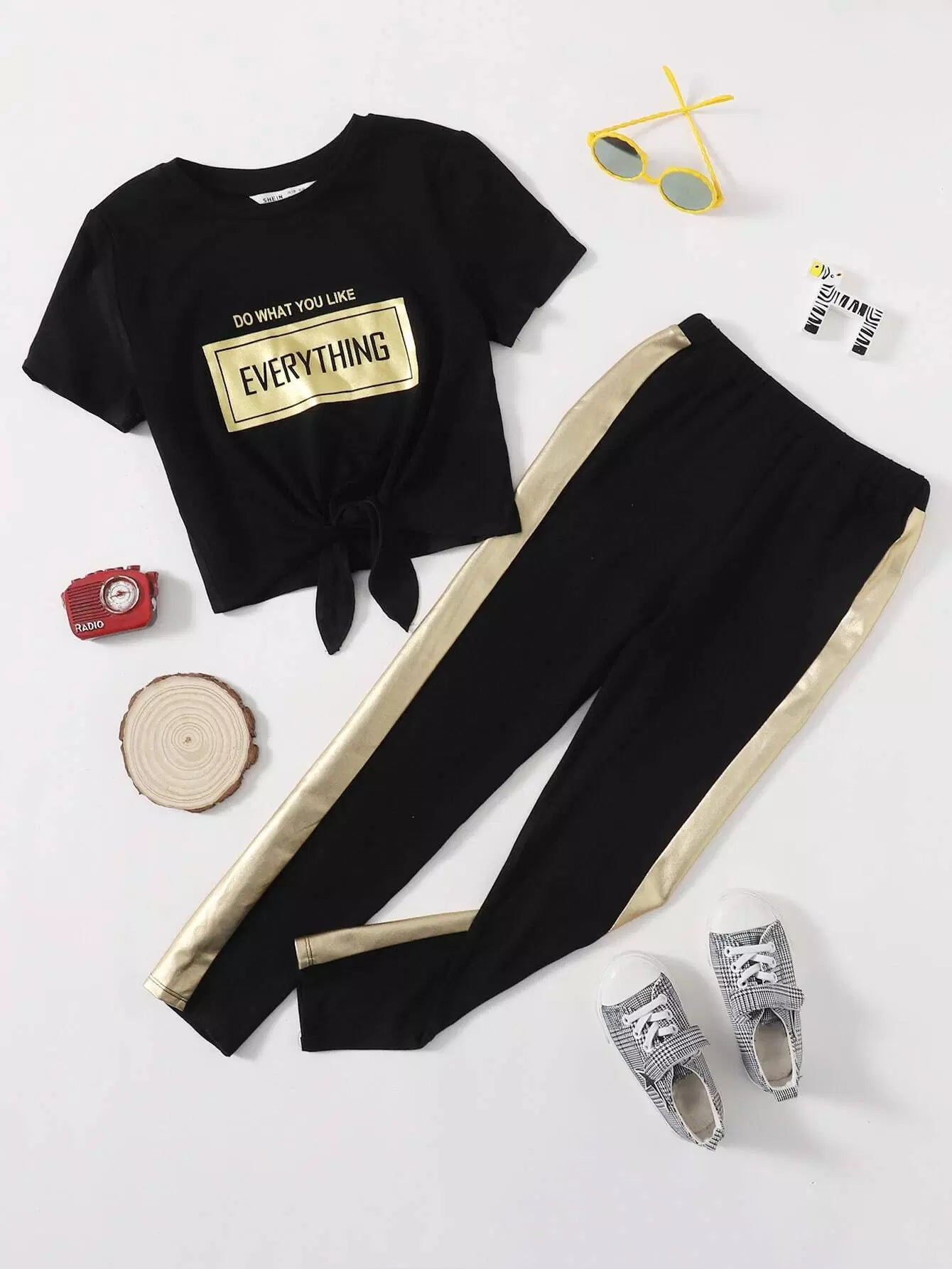 Girls Slogan Graphic Knot Waist Tee & Contrast Sideseam Pants Set