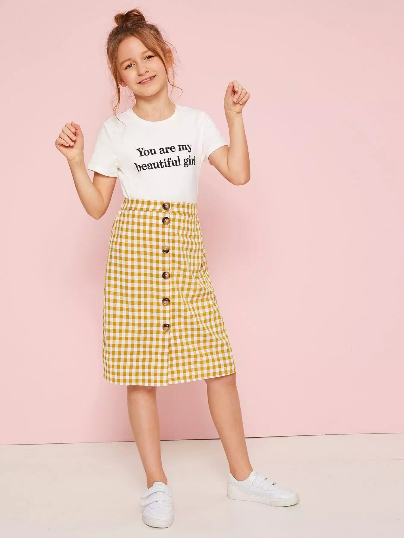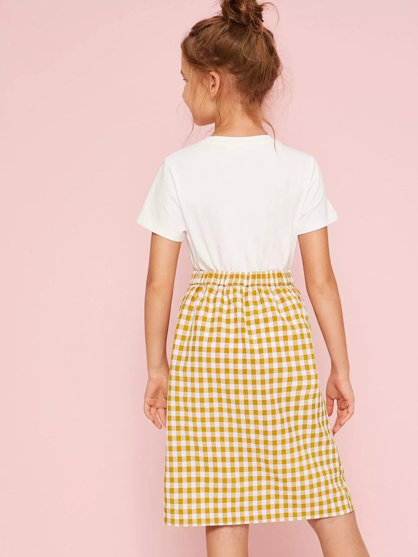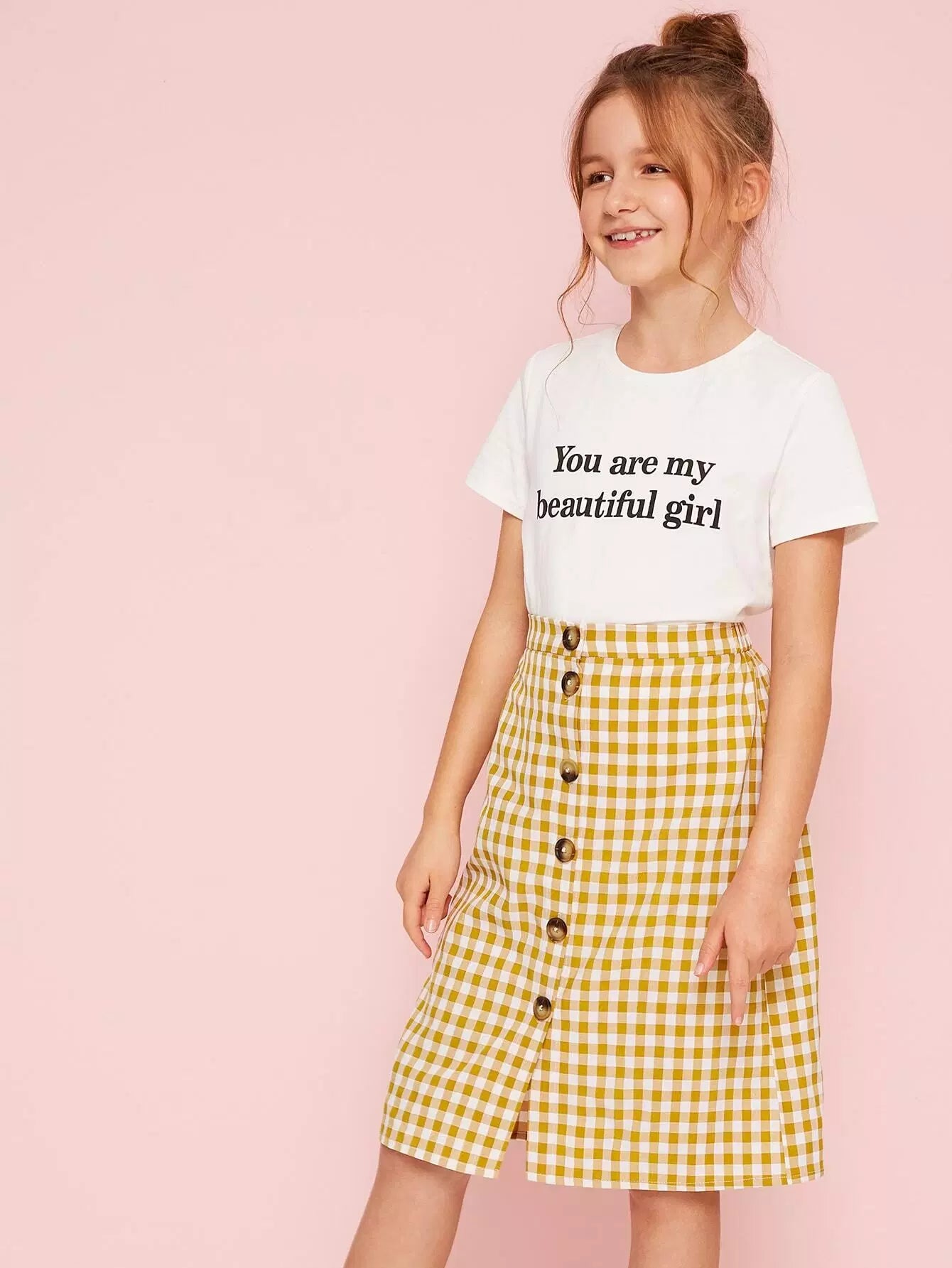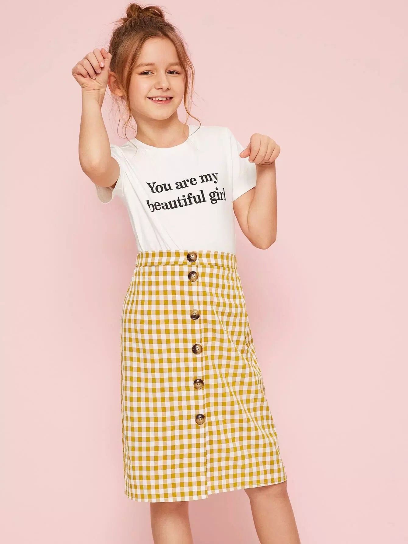 Girls Slogan Graphic Tee and Button Up Gingham Skirt Set