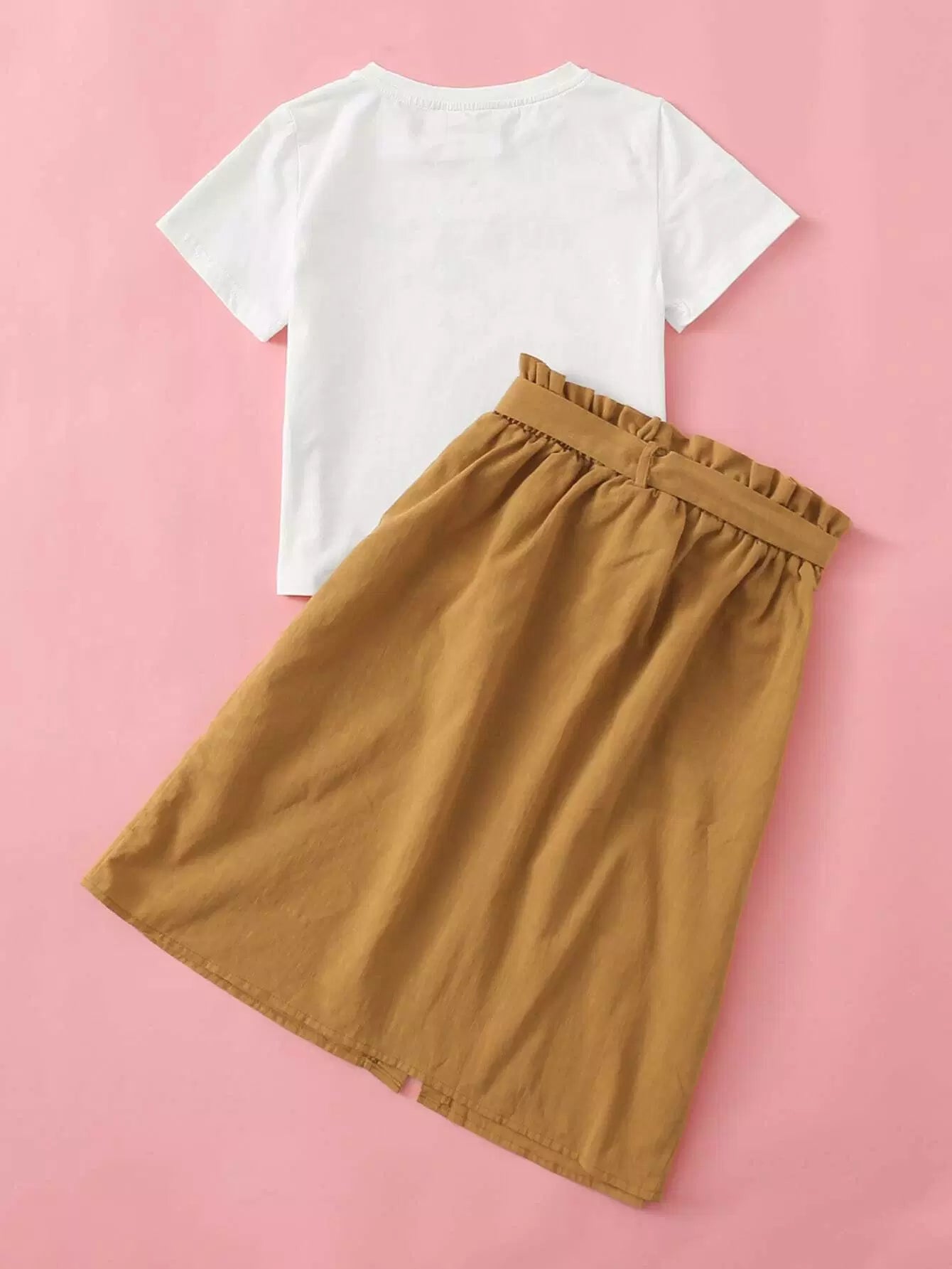 Girls Slogan Graphic Top & Paperbag Waist Buttoned Front Skirt Set