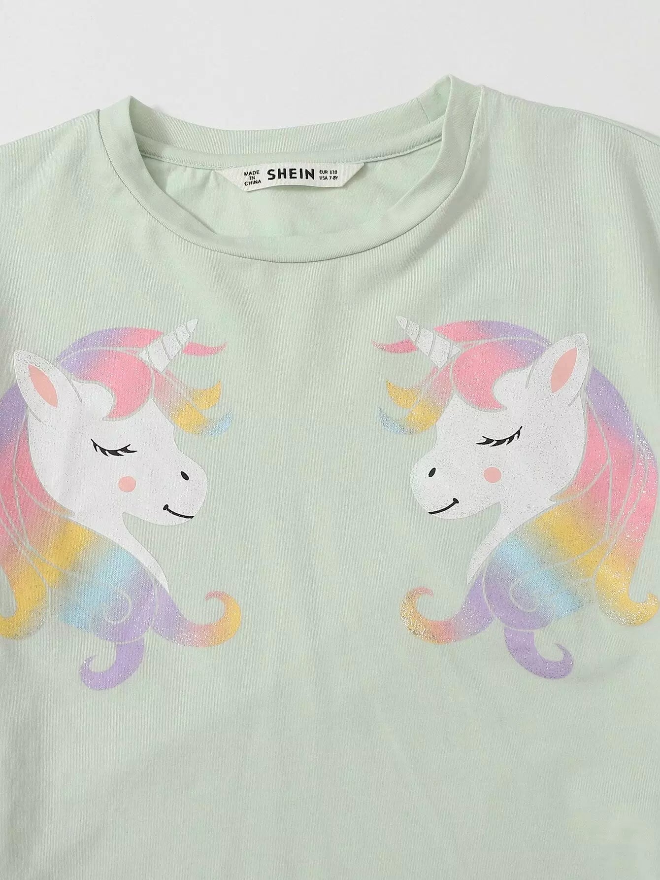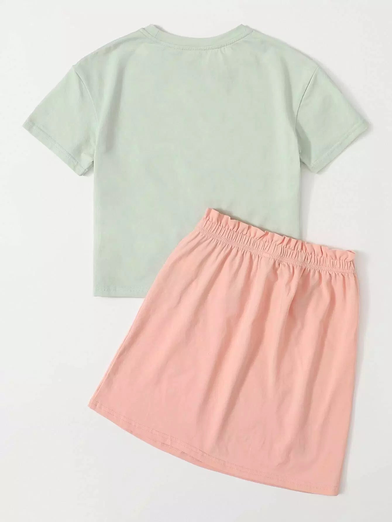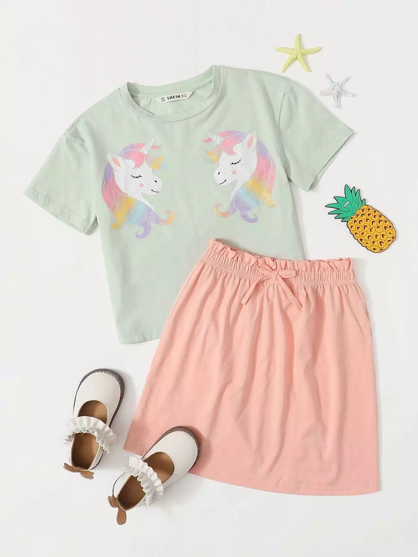 Kids - Girls Unicorn Print Tee and Bow Detail Skirt Set