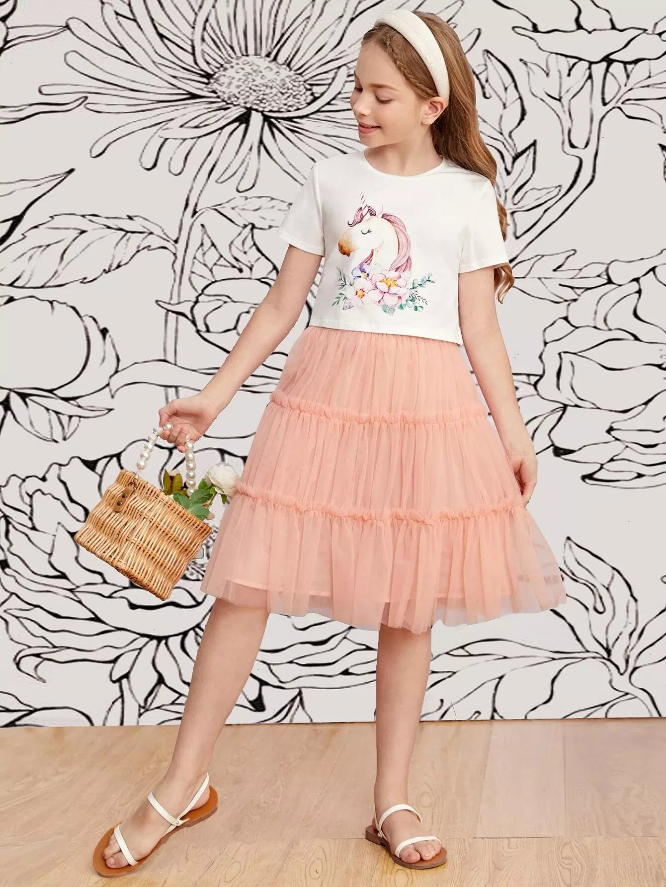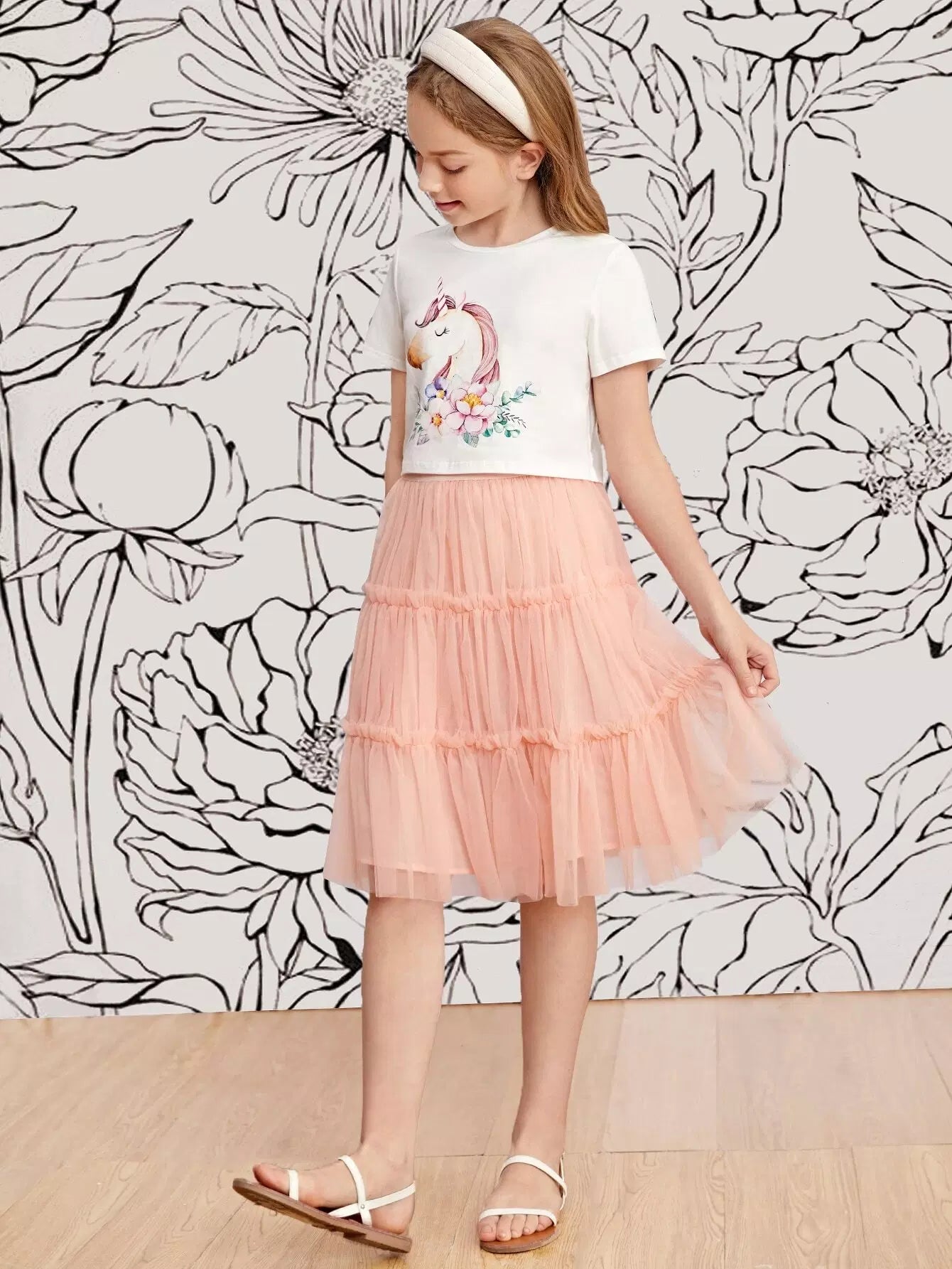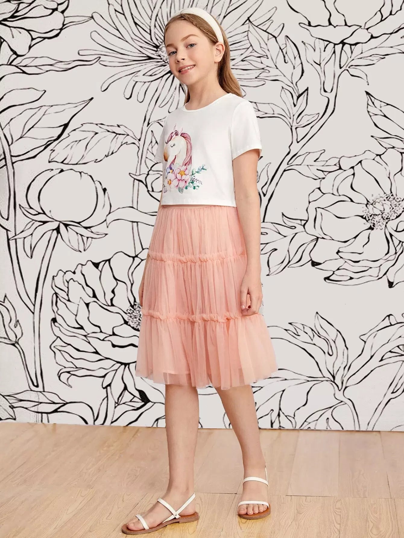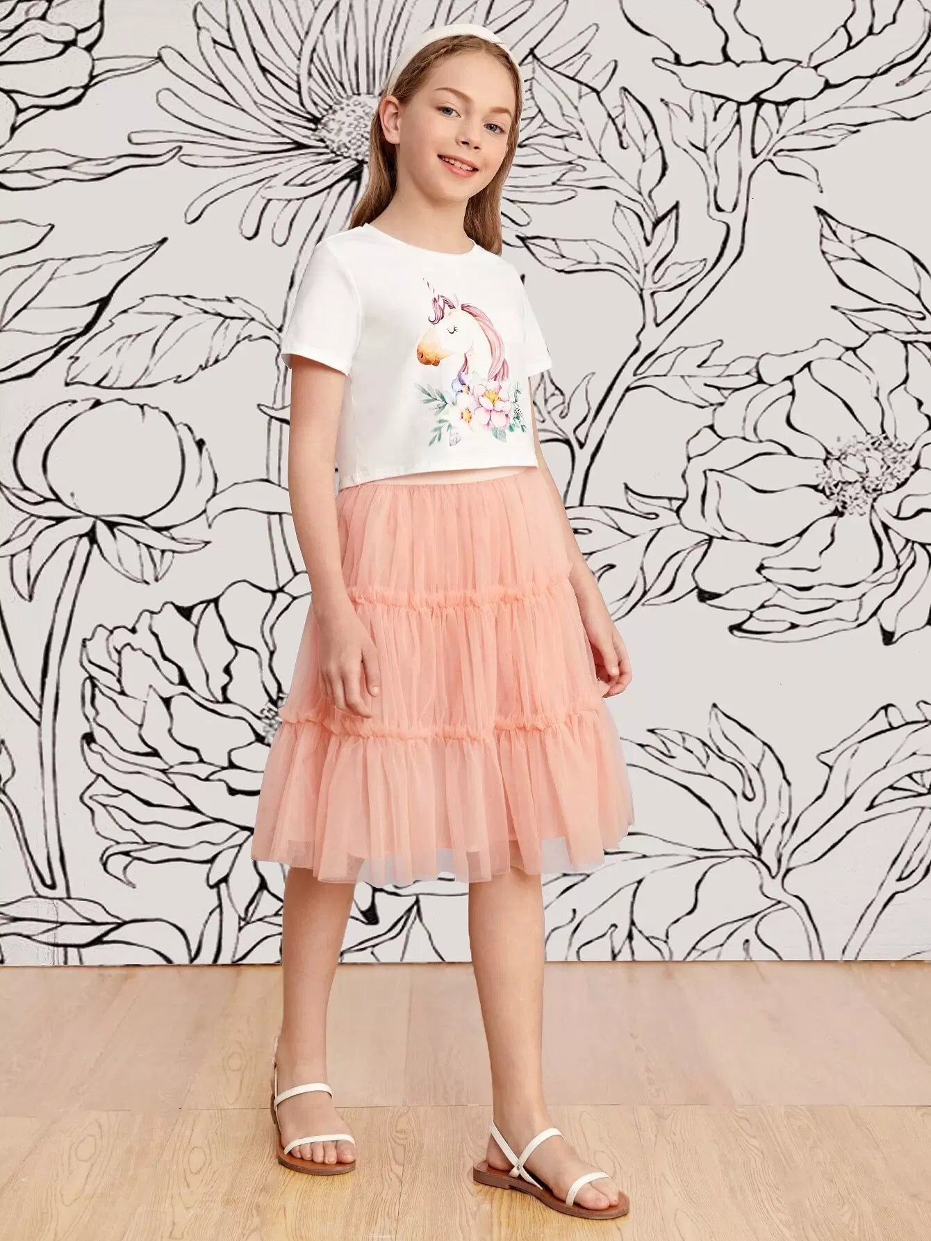 Girls Unicorn Print Top & Frill Trim Mesh Skirt Set