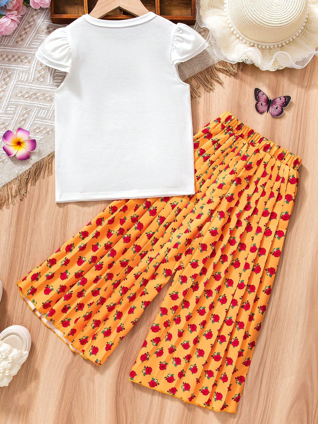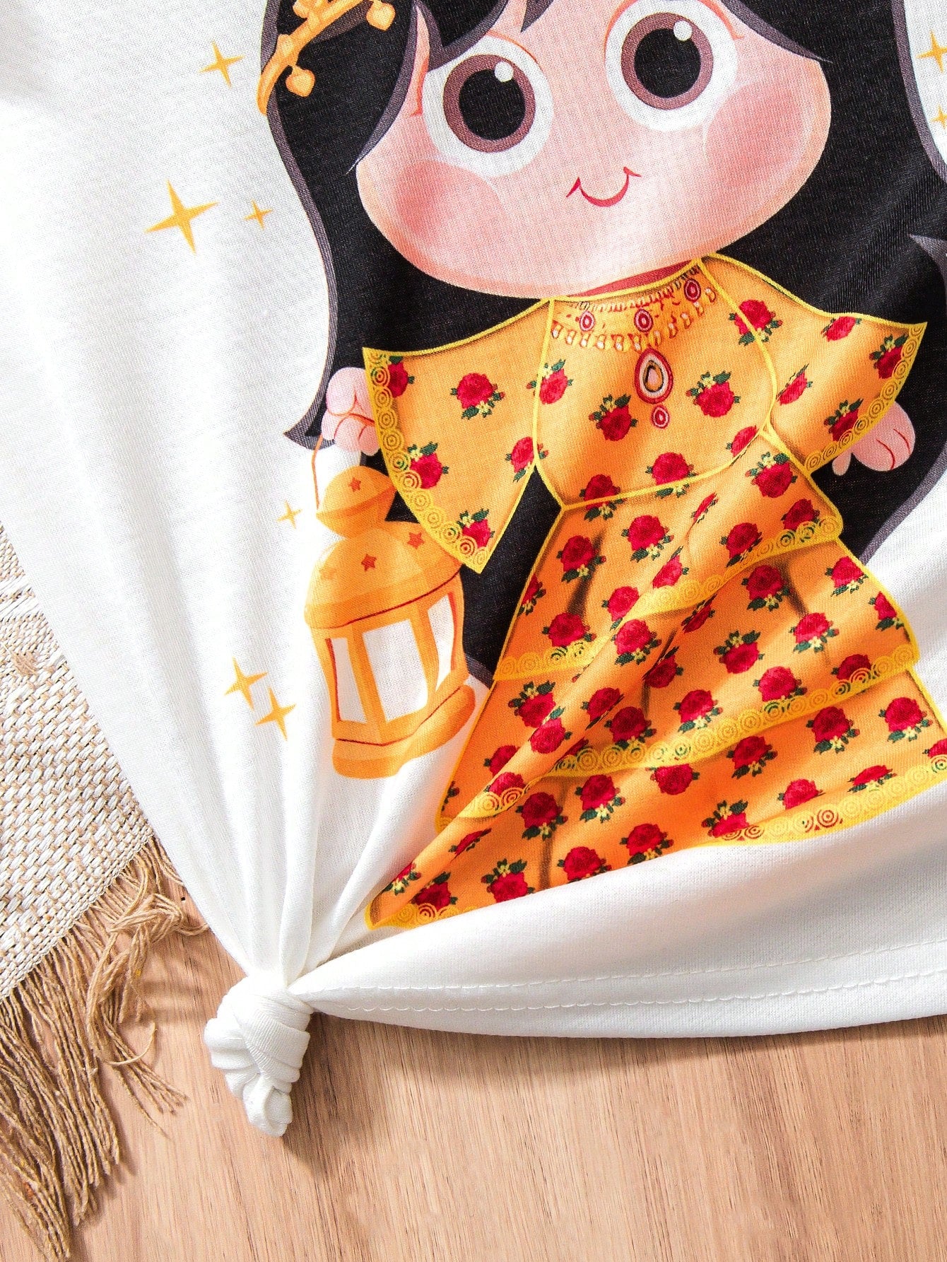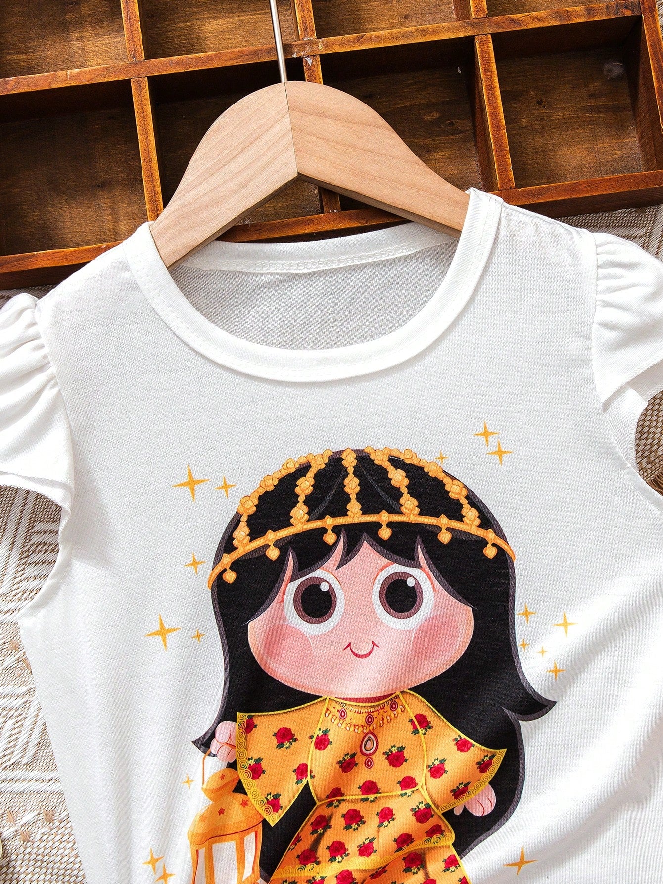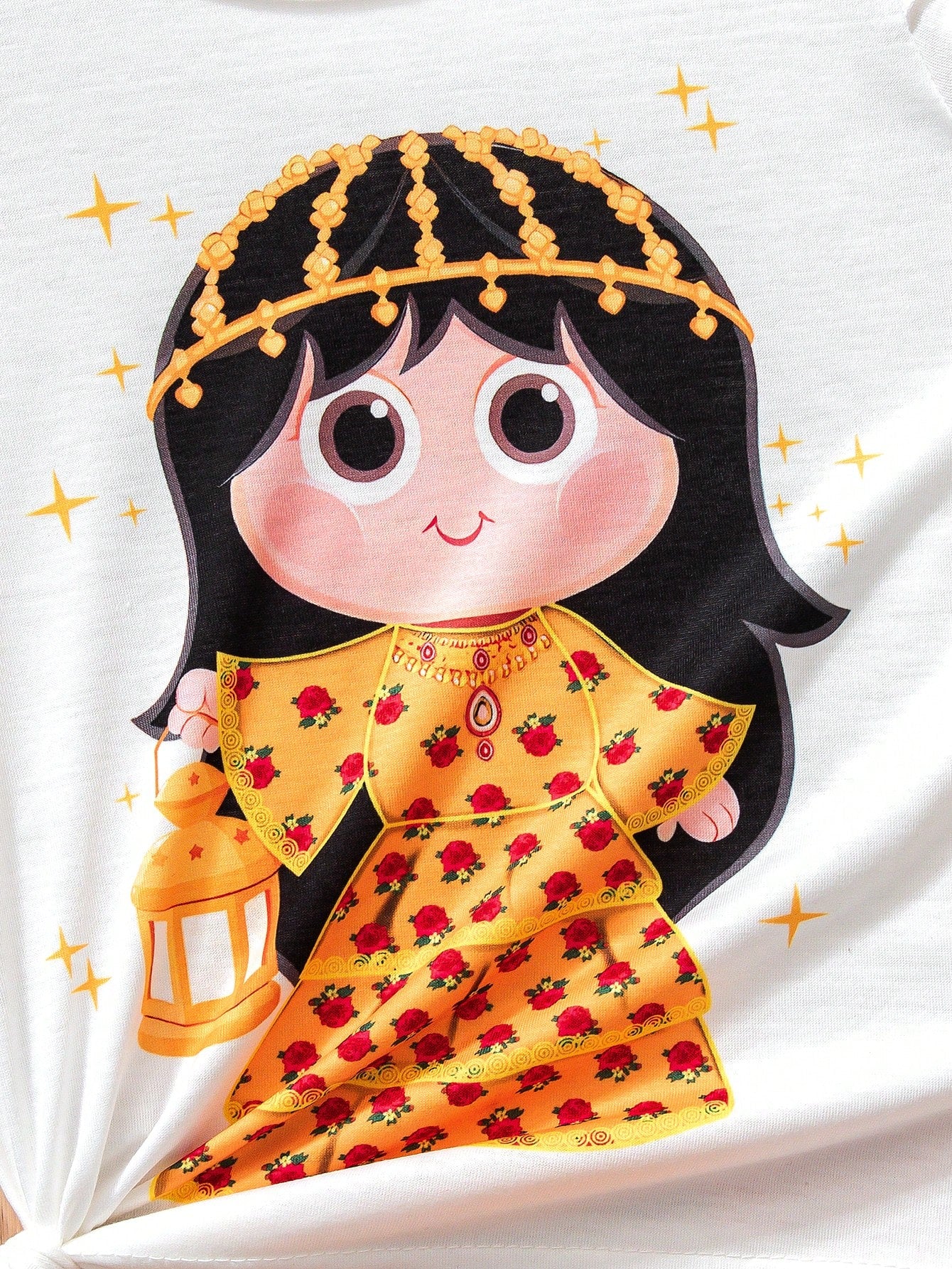 SHEIN 2pcs/Set Young Girl Cute Yellow Tunic Abaya Kaftan Jalabiya Festival Cartoon Pattern Lantern Moon Ditsy Floral Pleated Wide Leg Pants + Cap Sleeve T-Shirt
