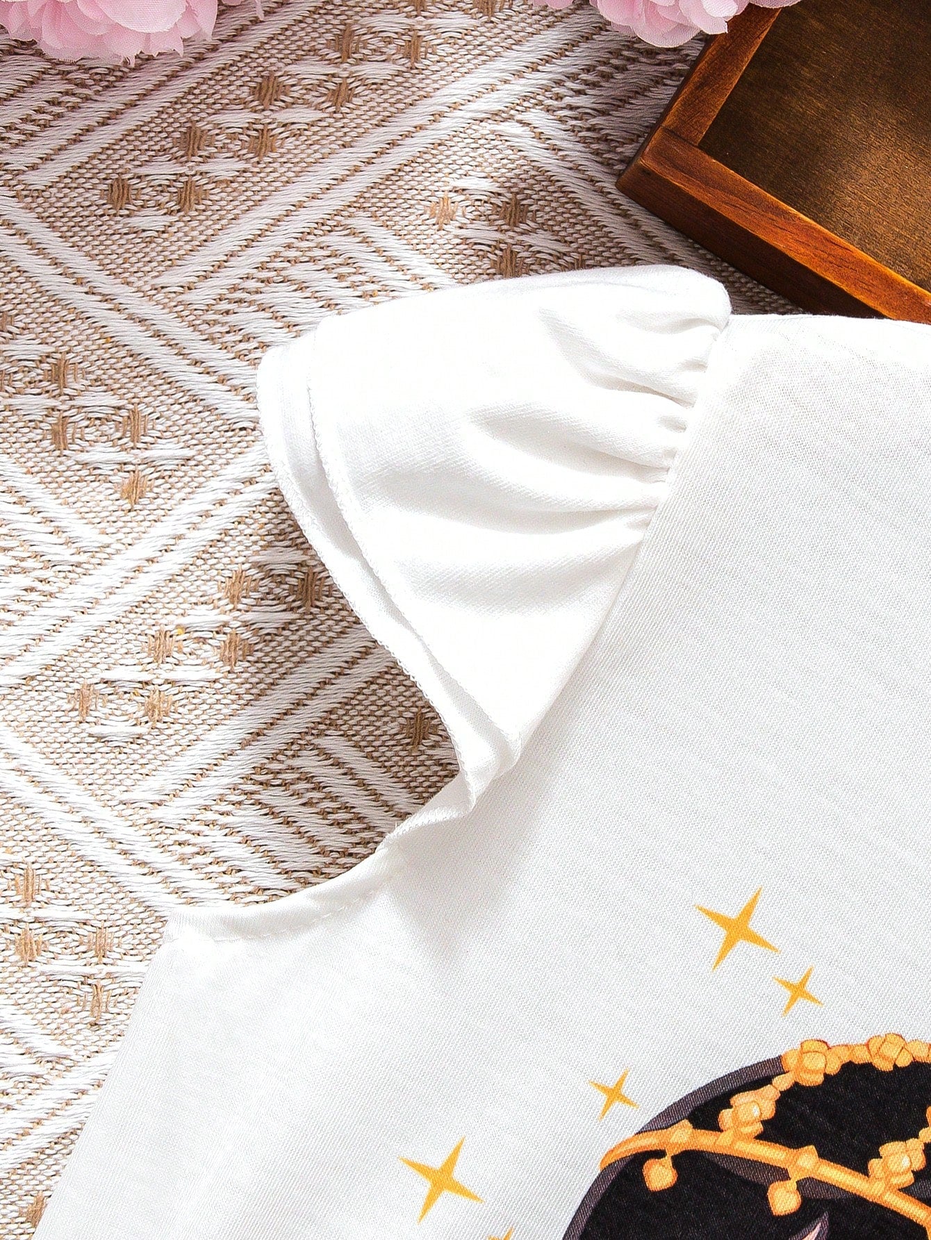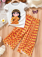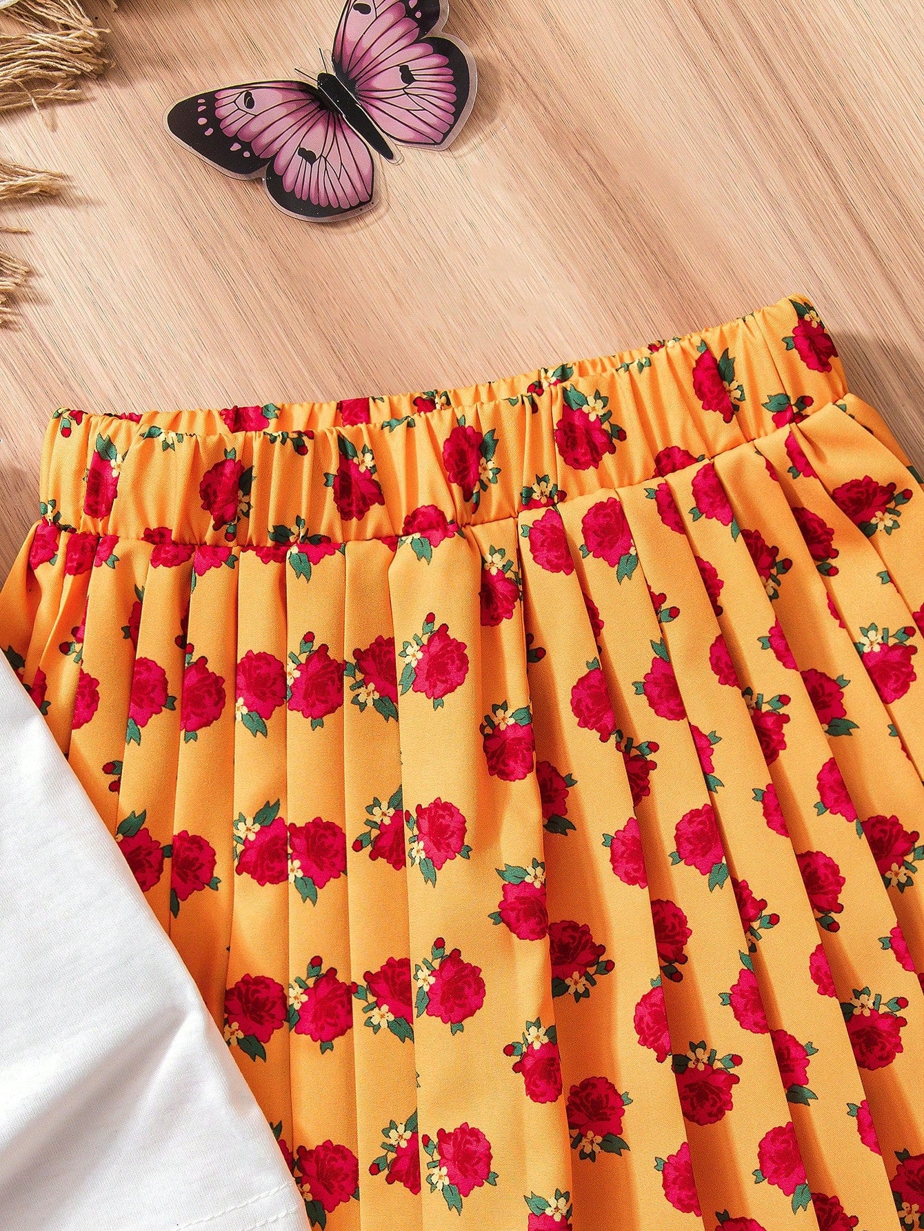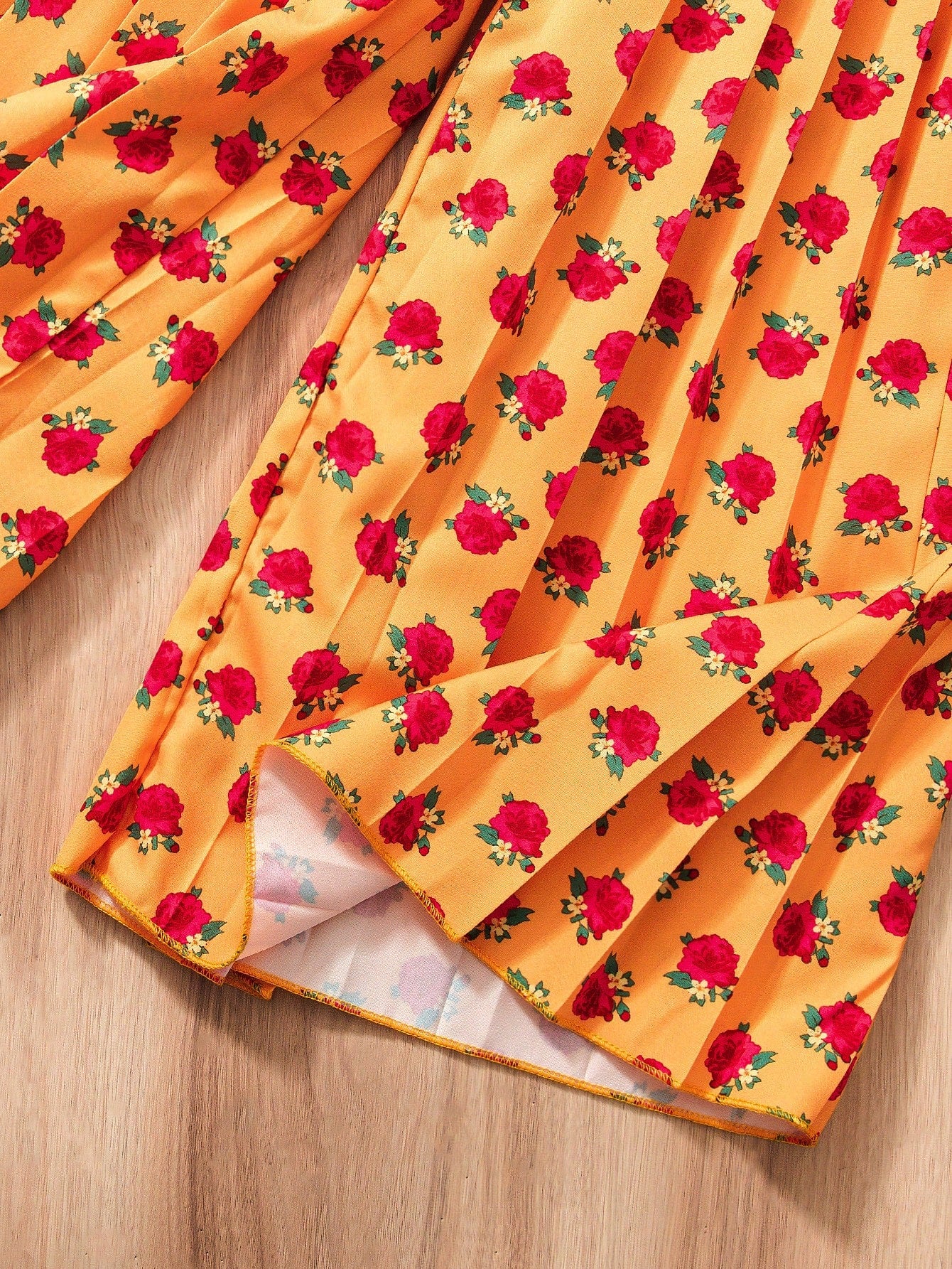 SHEIN 2pcs/Set Young Girl Cute Yellow Tunic Abaya Kaftan Jalabiya Festival Cartoon Pattern Lantern Moon Ditsy Floral Pleated Wide Leg Pants + Cap Sleeve T-Shirt