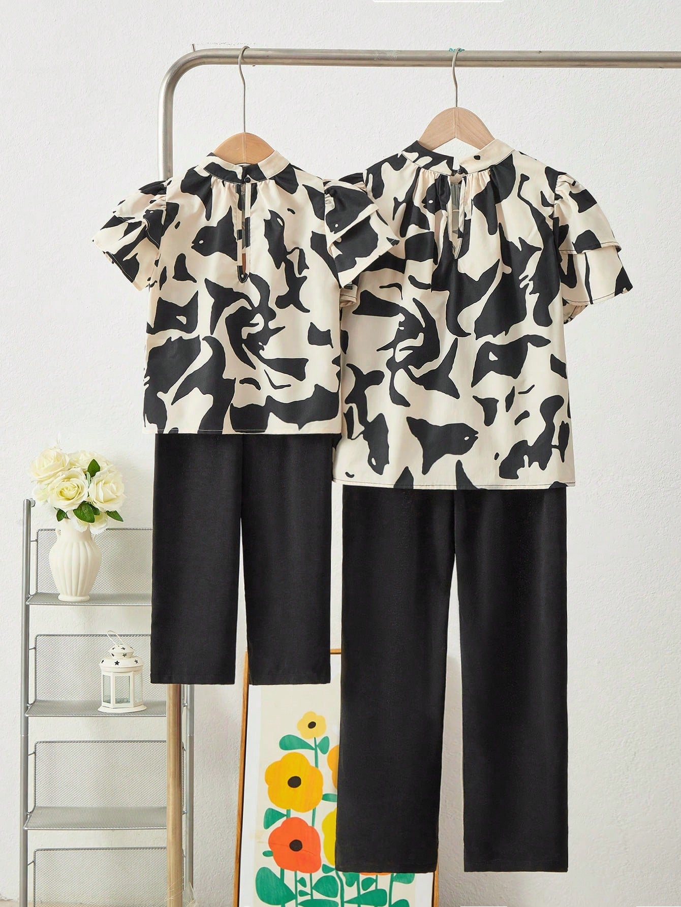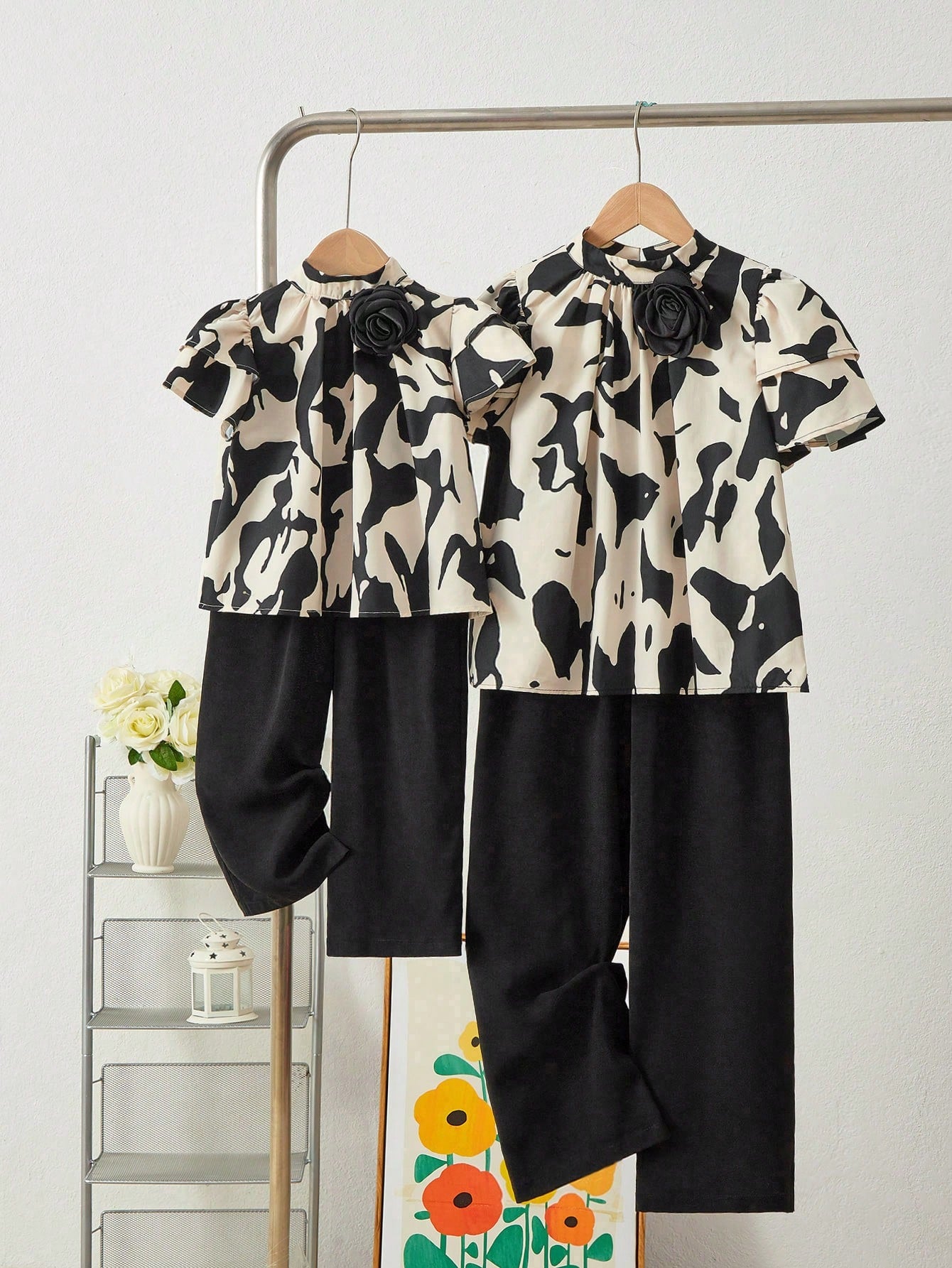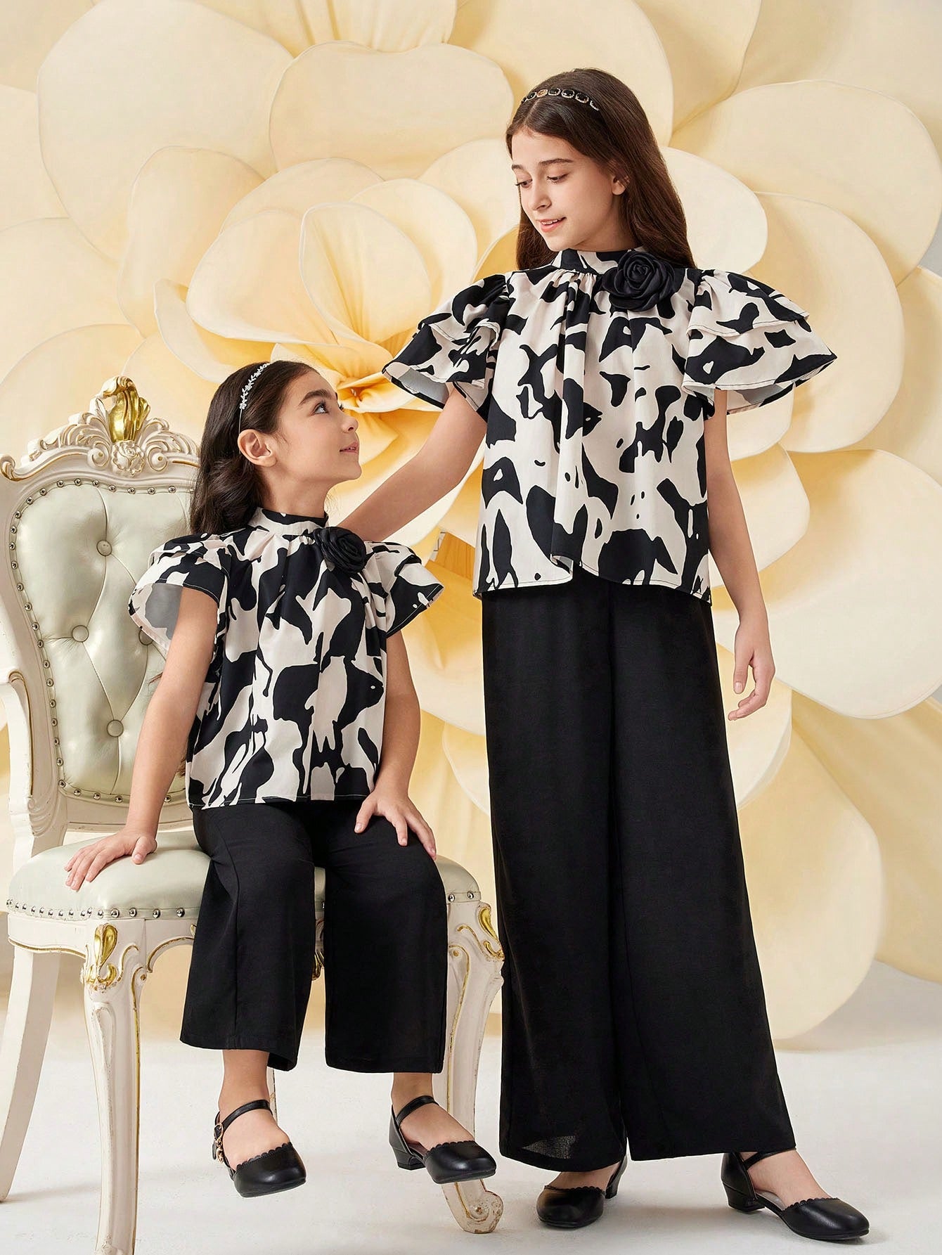 SHEIN Tween Girl 2pcs Coordinated Casual Stand Collar Geometric & 3D Floral Print Shirt And Pants Set