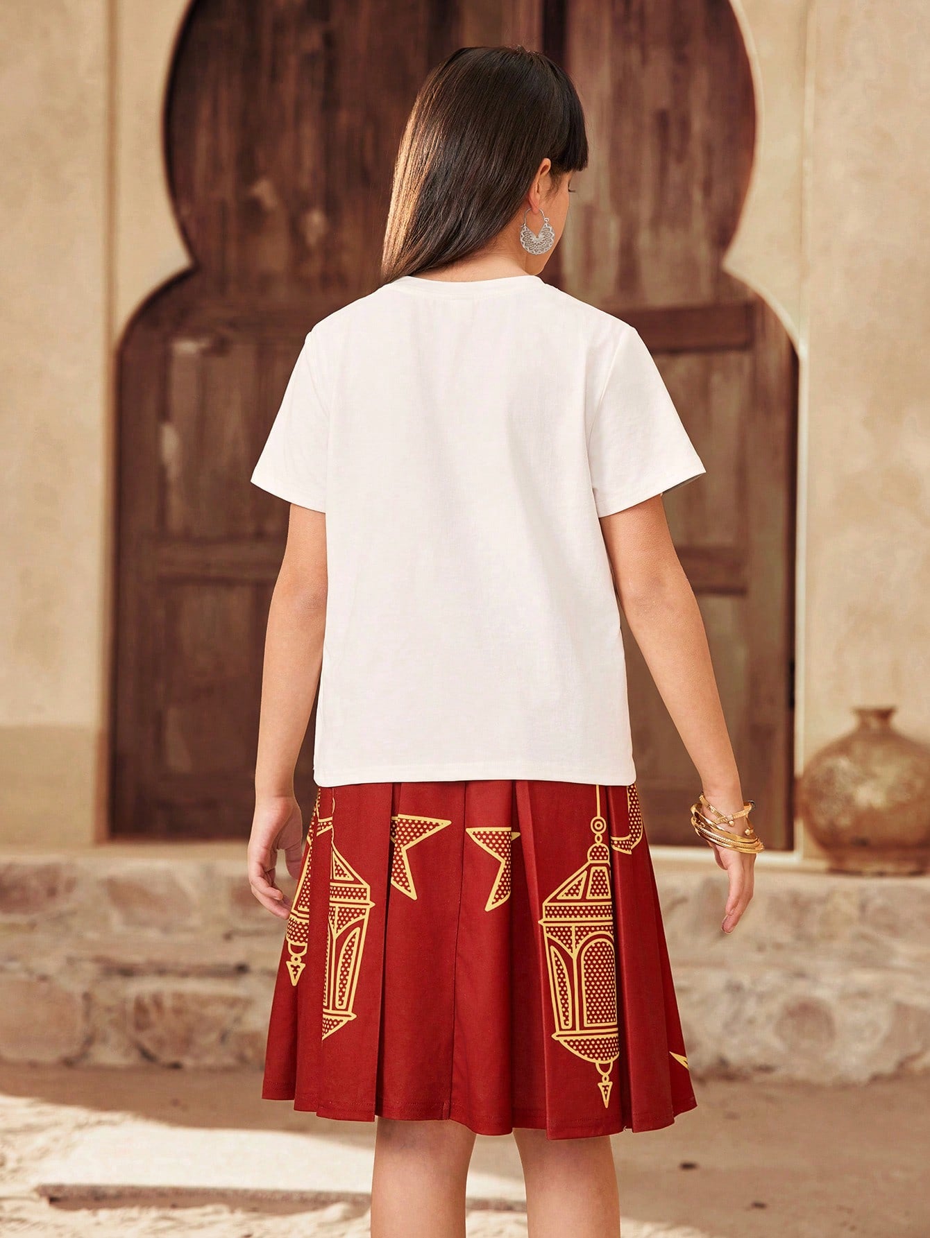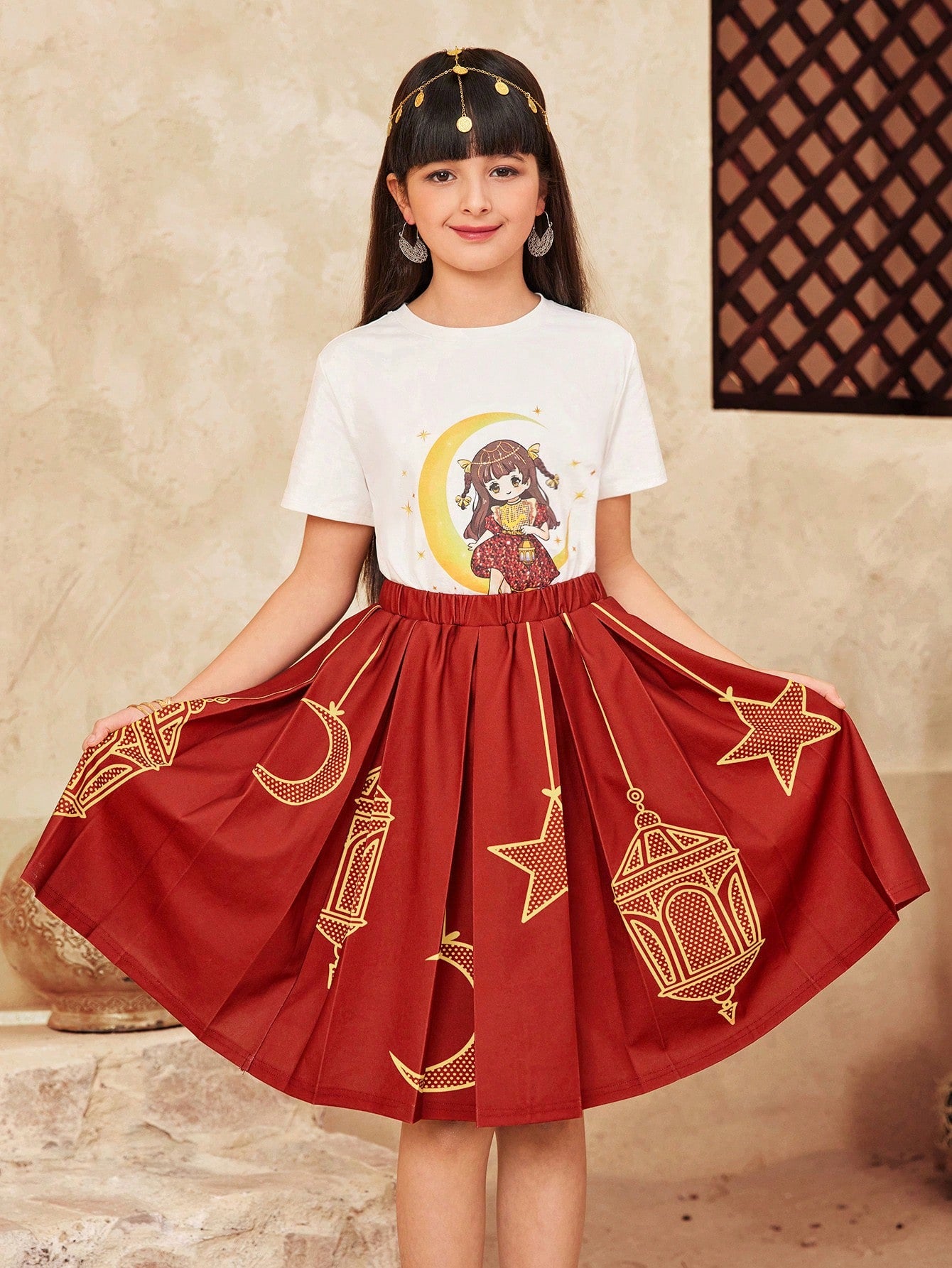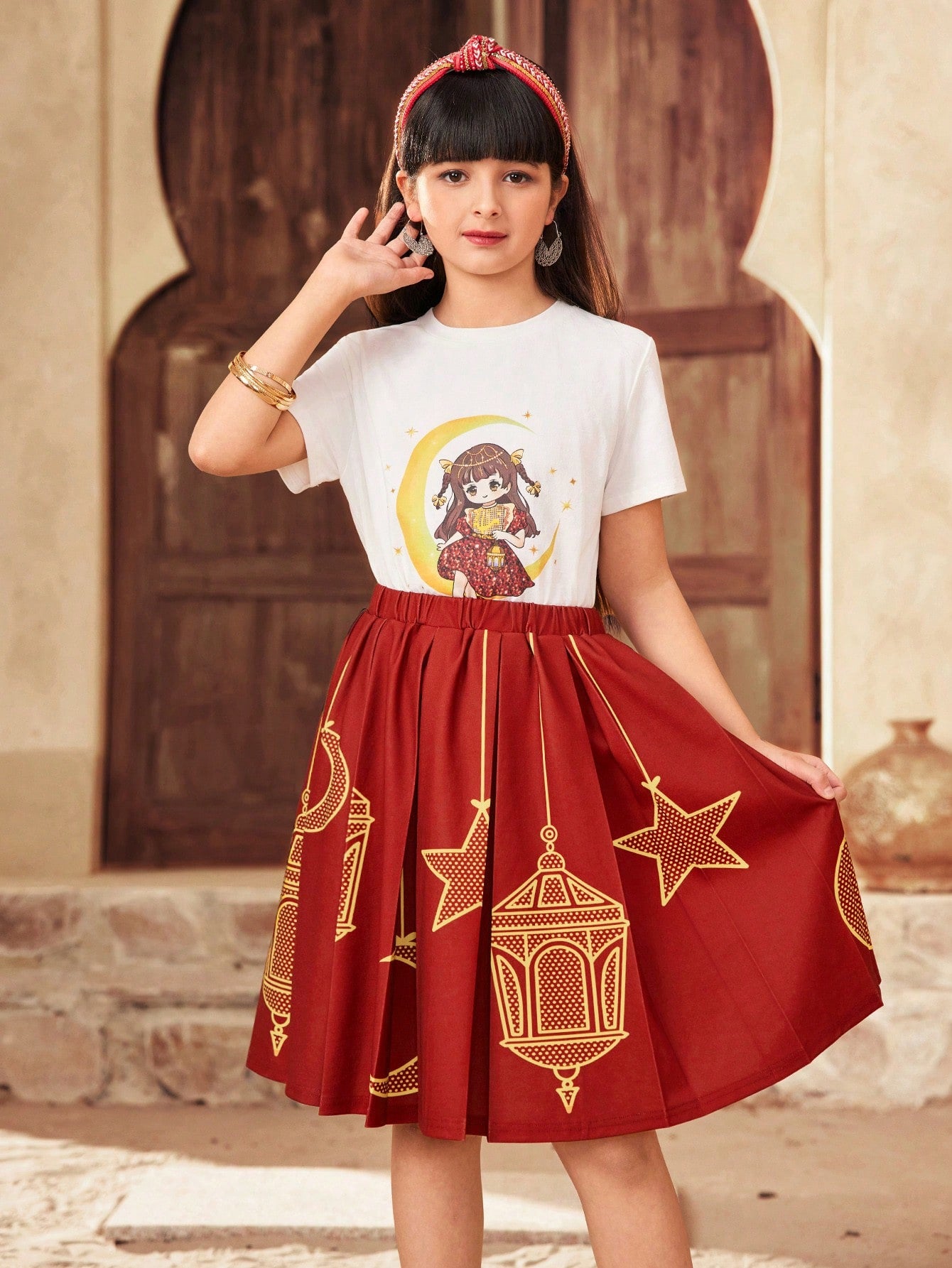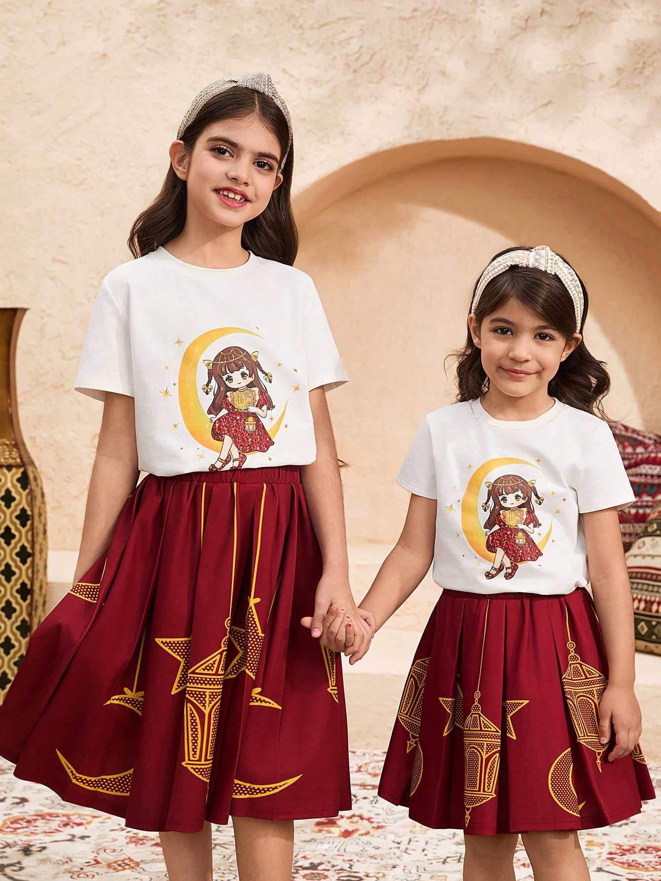 kids SHEIN Tween Girl Casual Matching Comfortable Round Neck Cartoon Girl Graphic T-Shirt And Skirt 2 Pieces Set