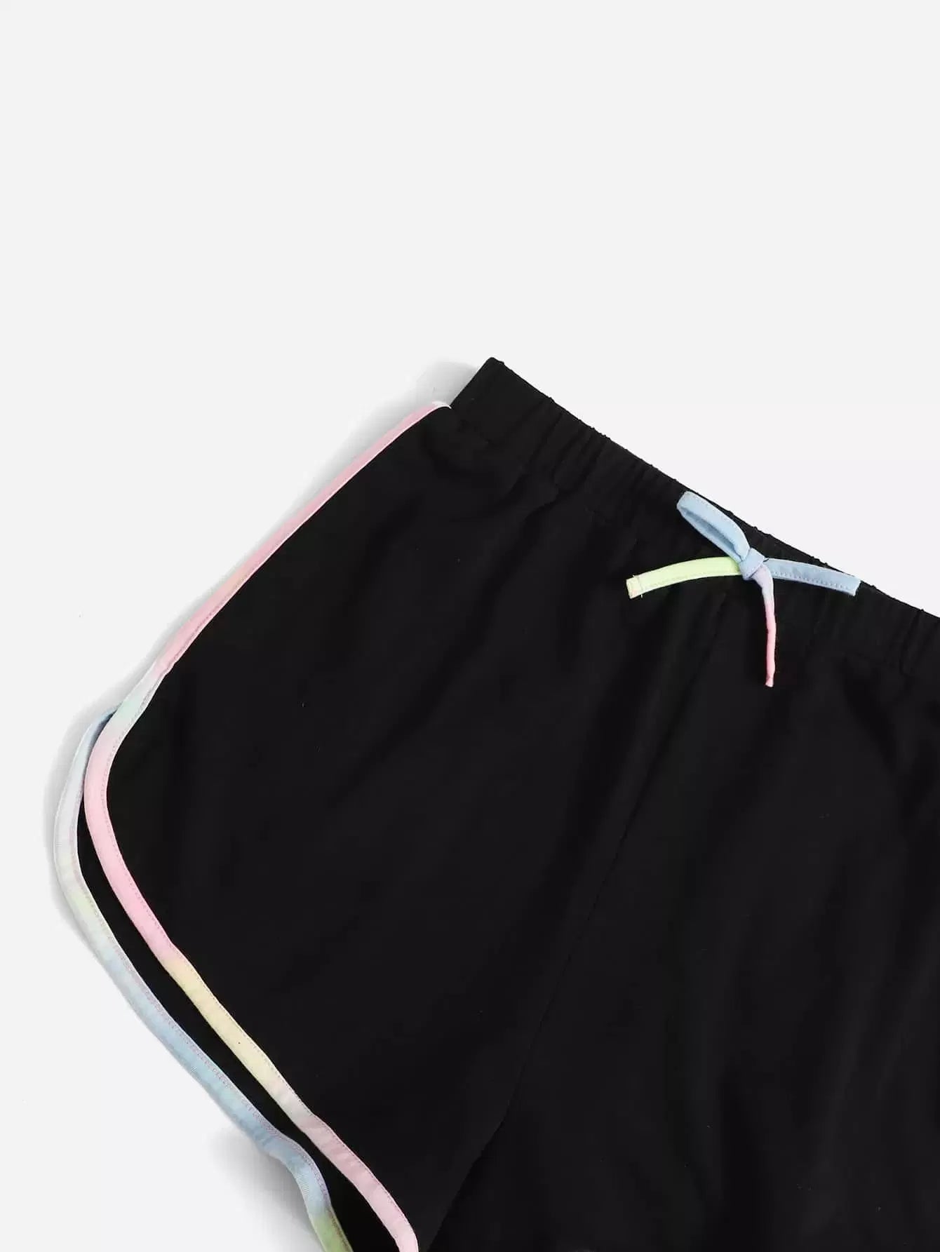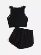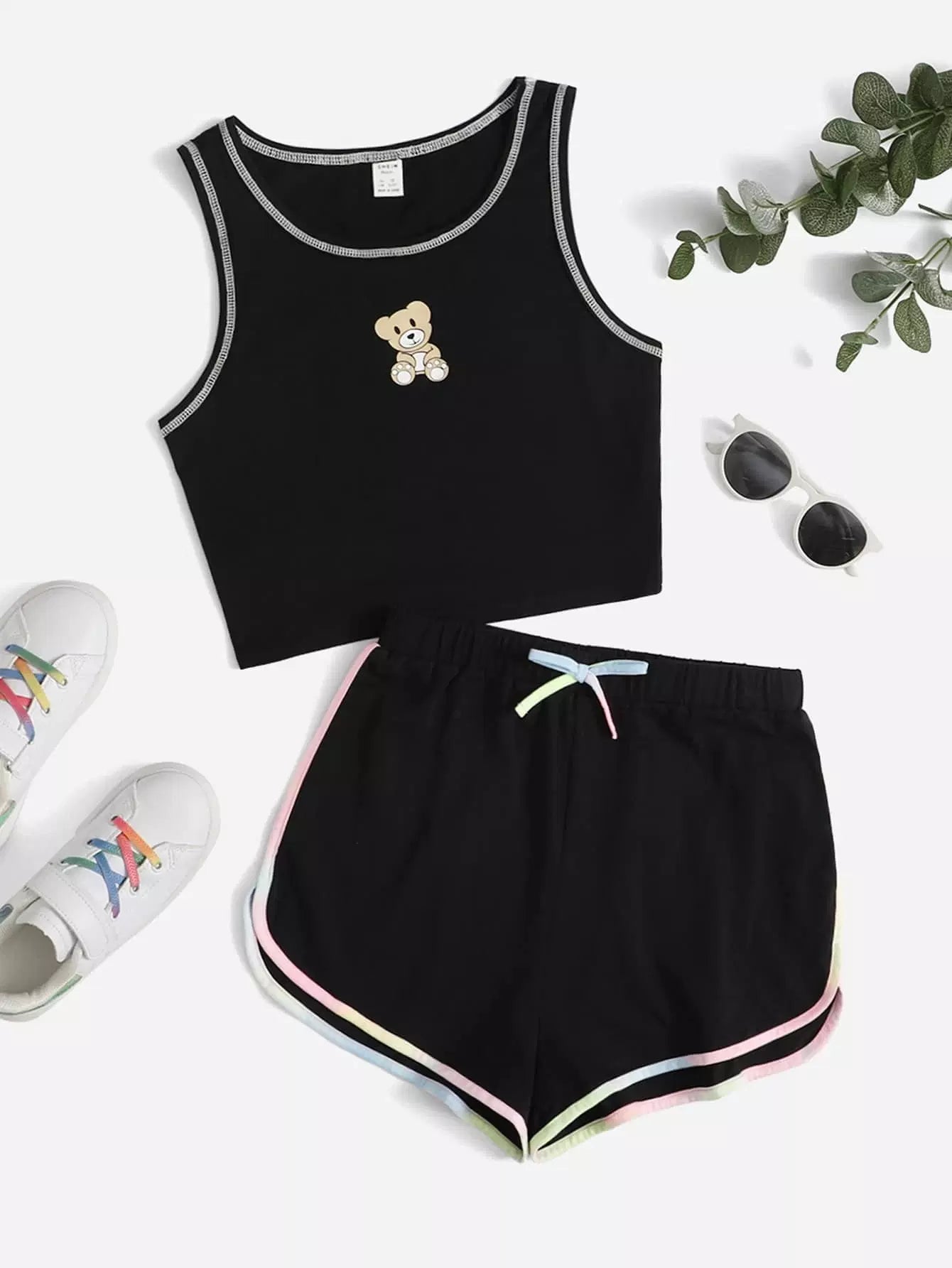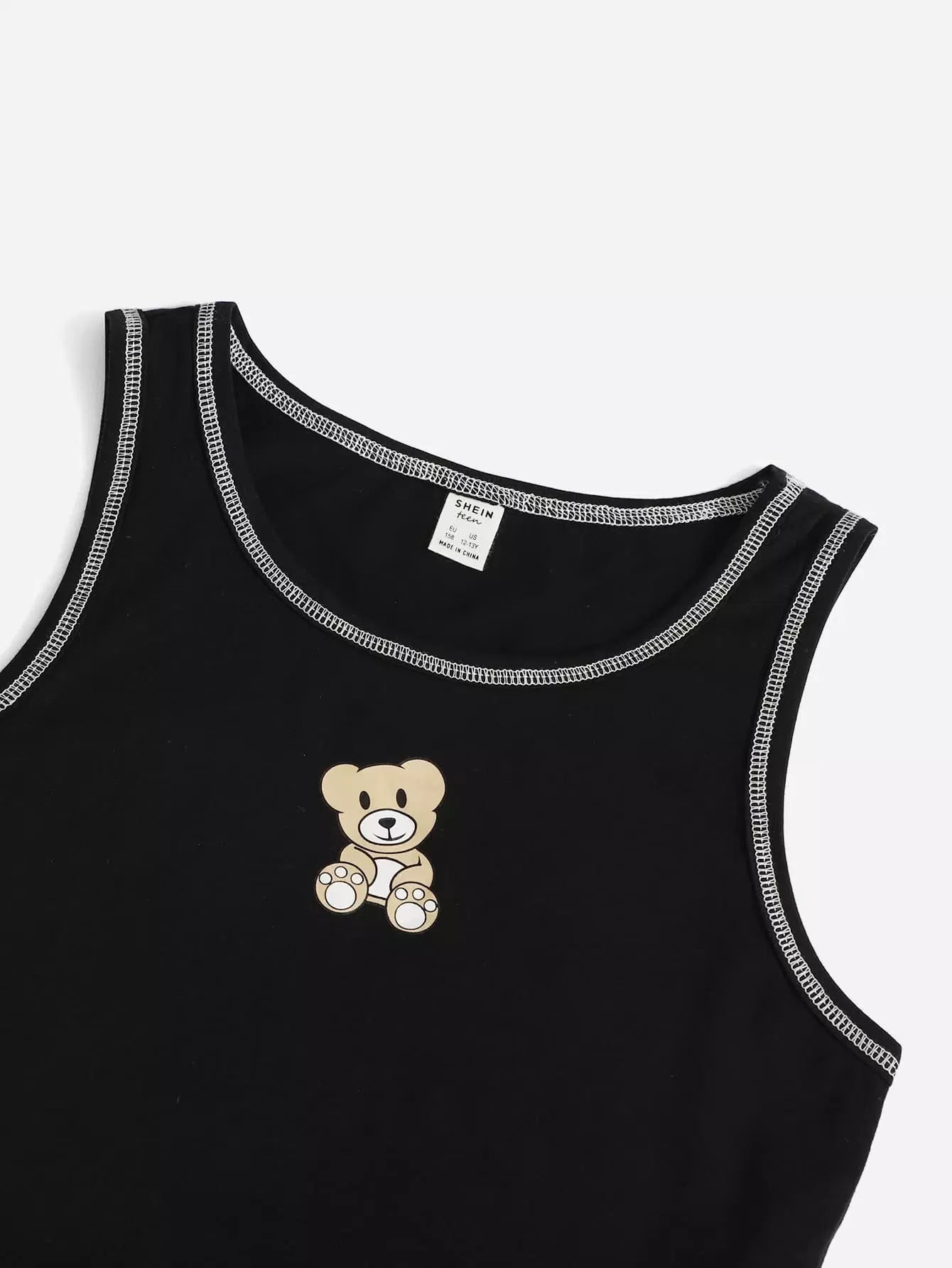 Teen Girls Bear Print Top-stitching Tank Top & Contrast Binding Shorts