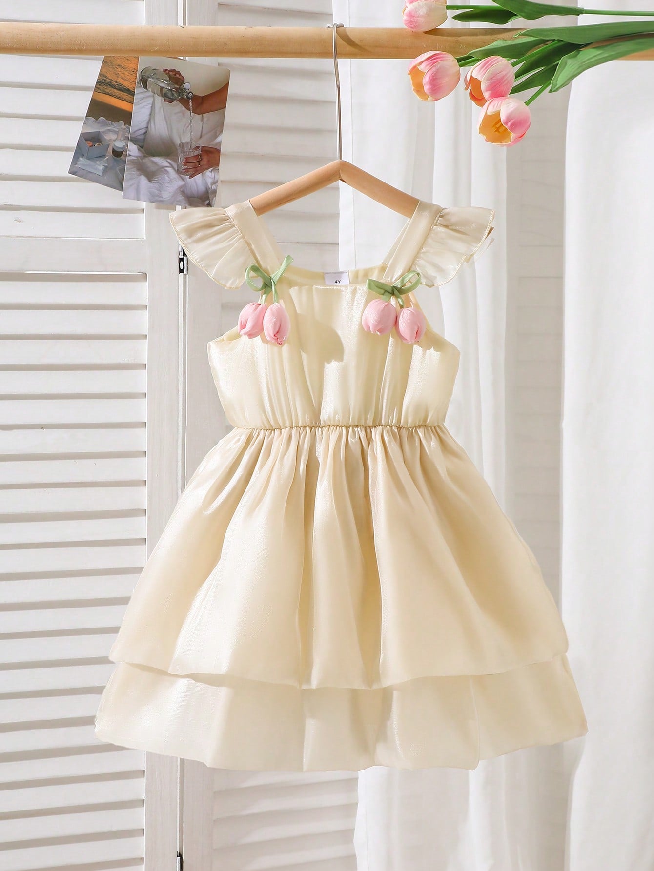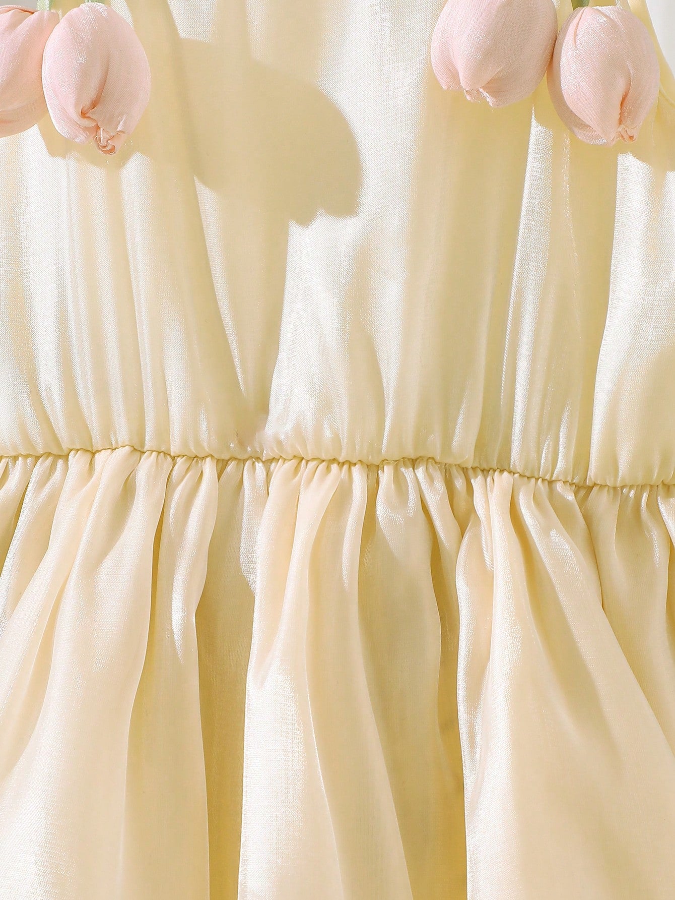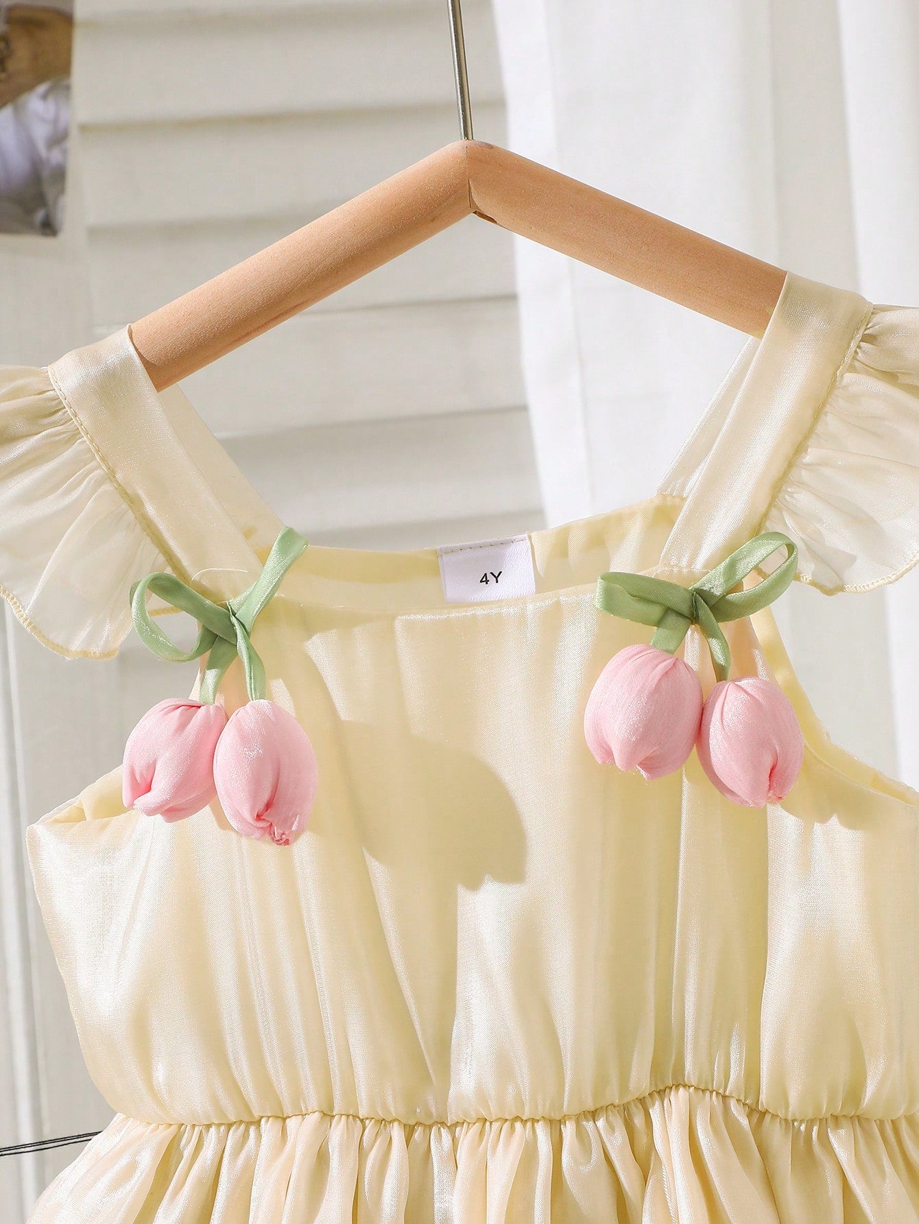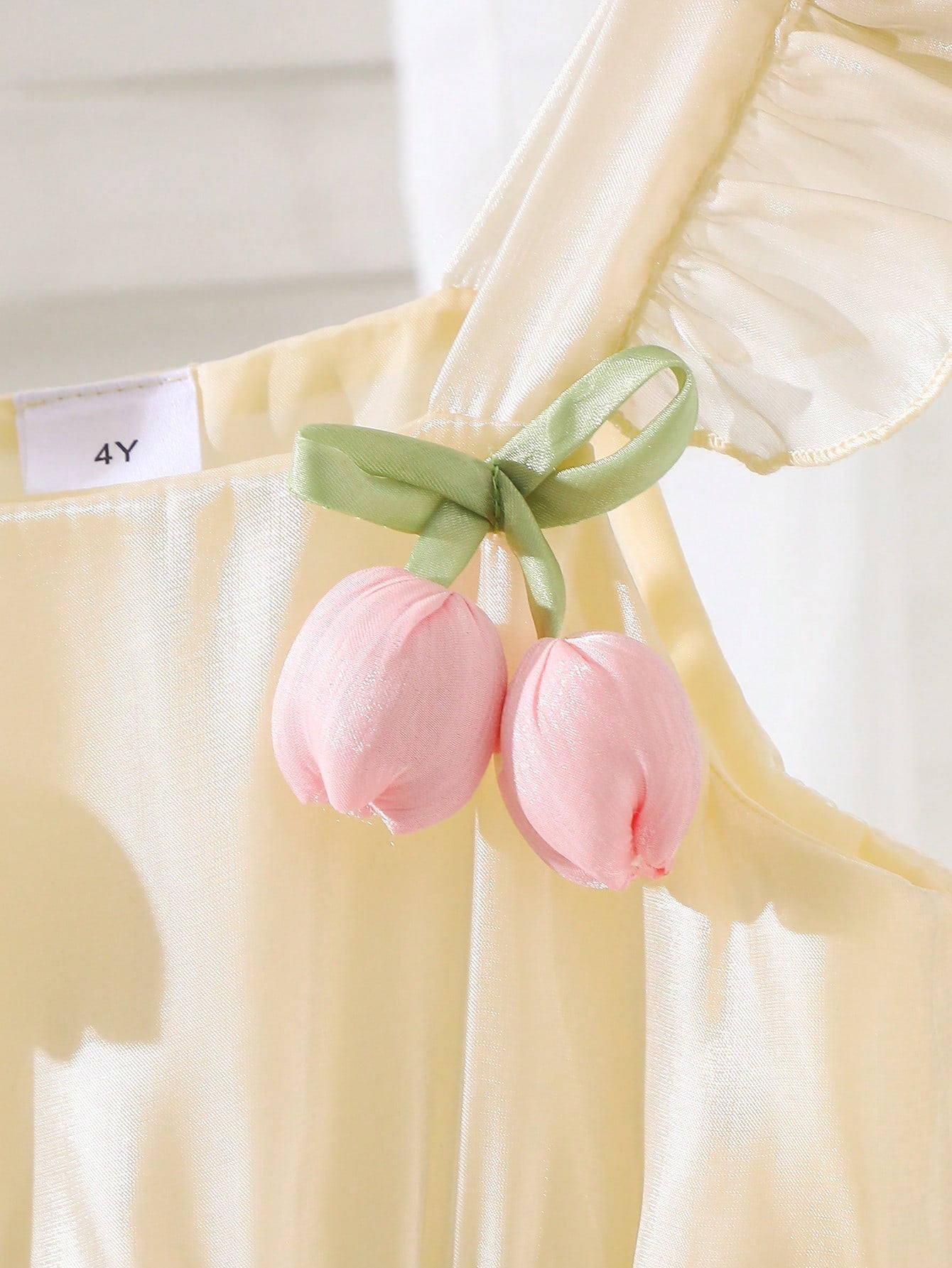 SHEIN Young Girl Pink Tulip 3D Floral Decor Ruffle Hem Dress