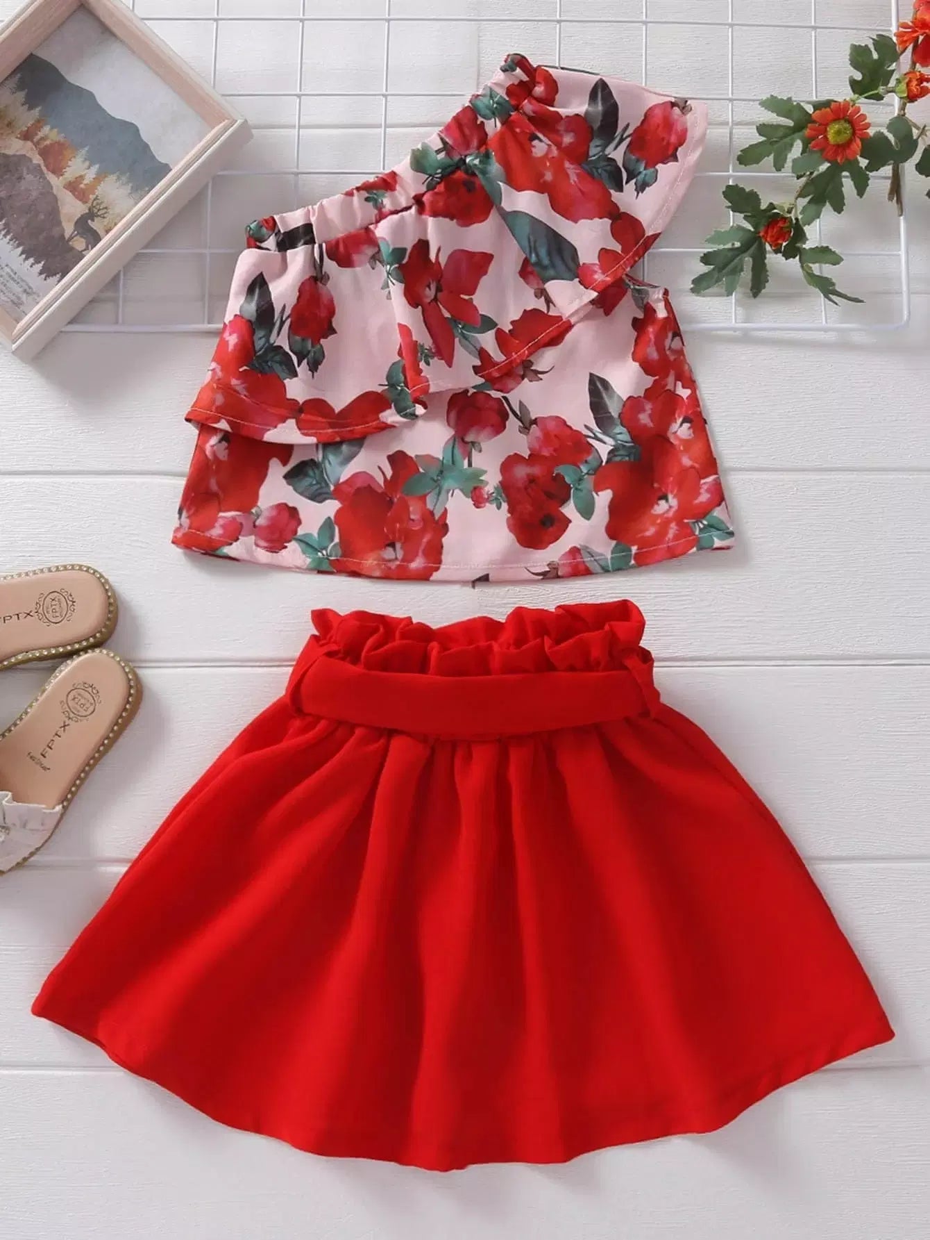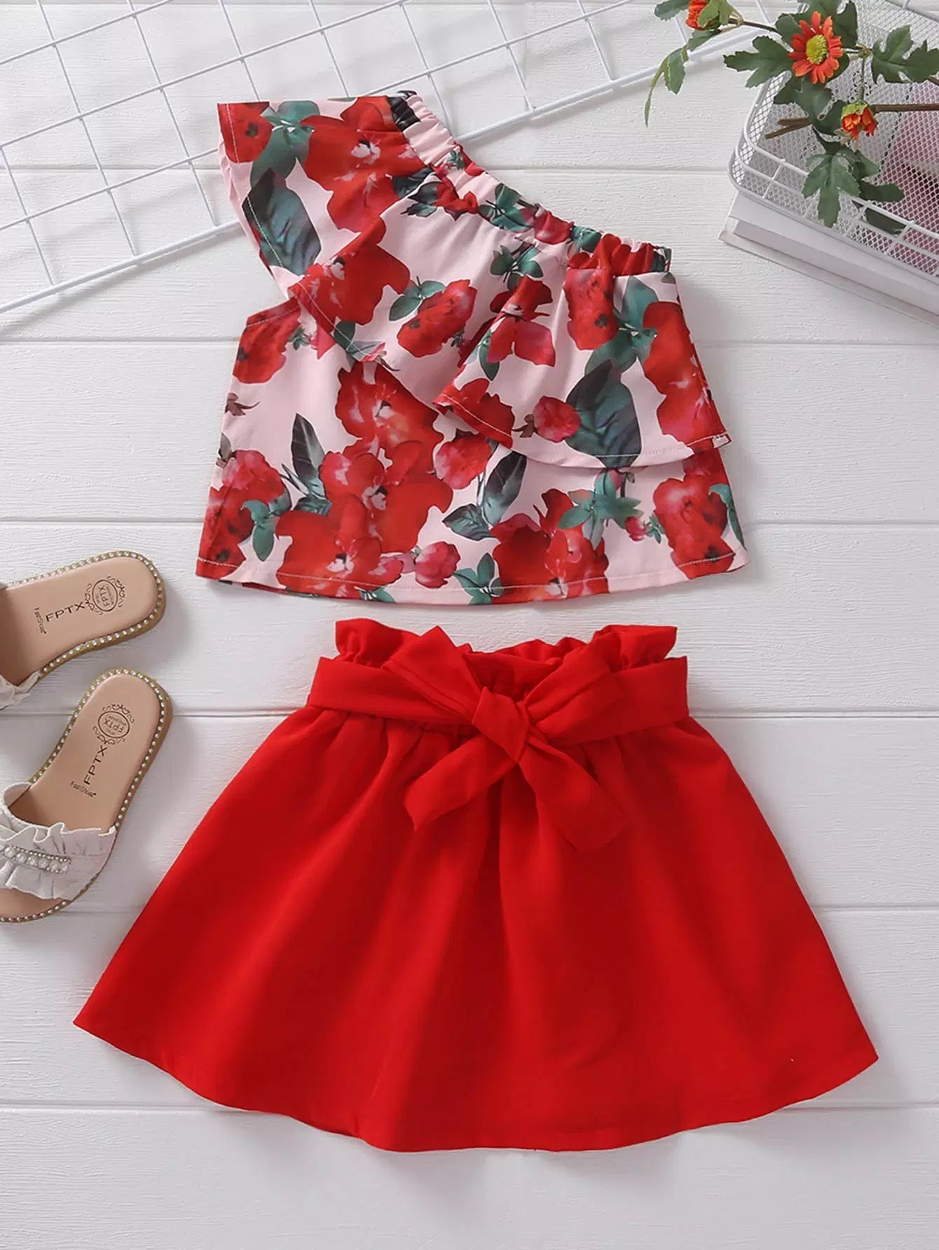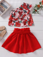 Toddler Girls Floral Print One Shoulder Top Skirt Without Belt