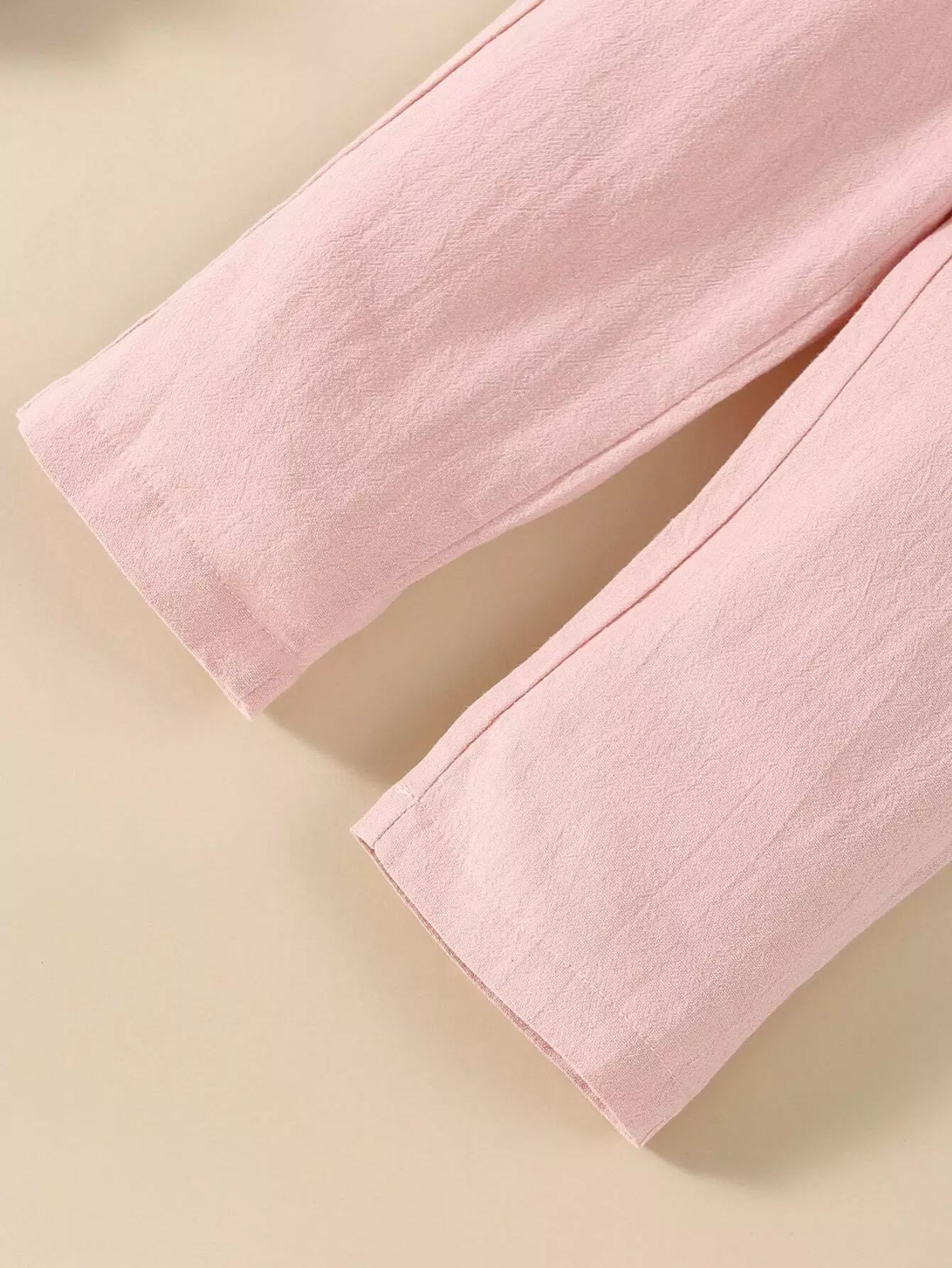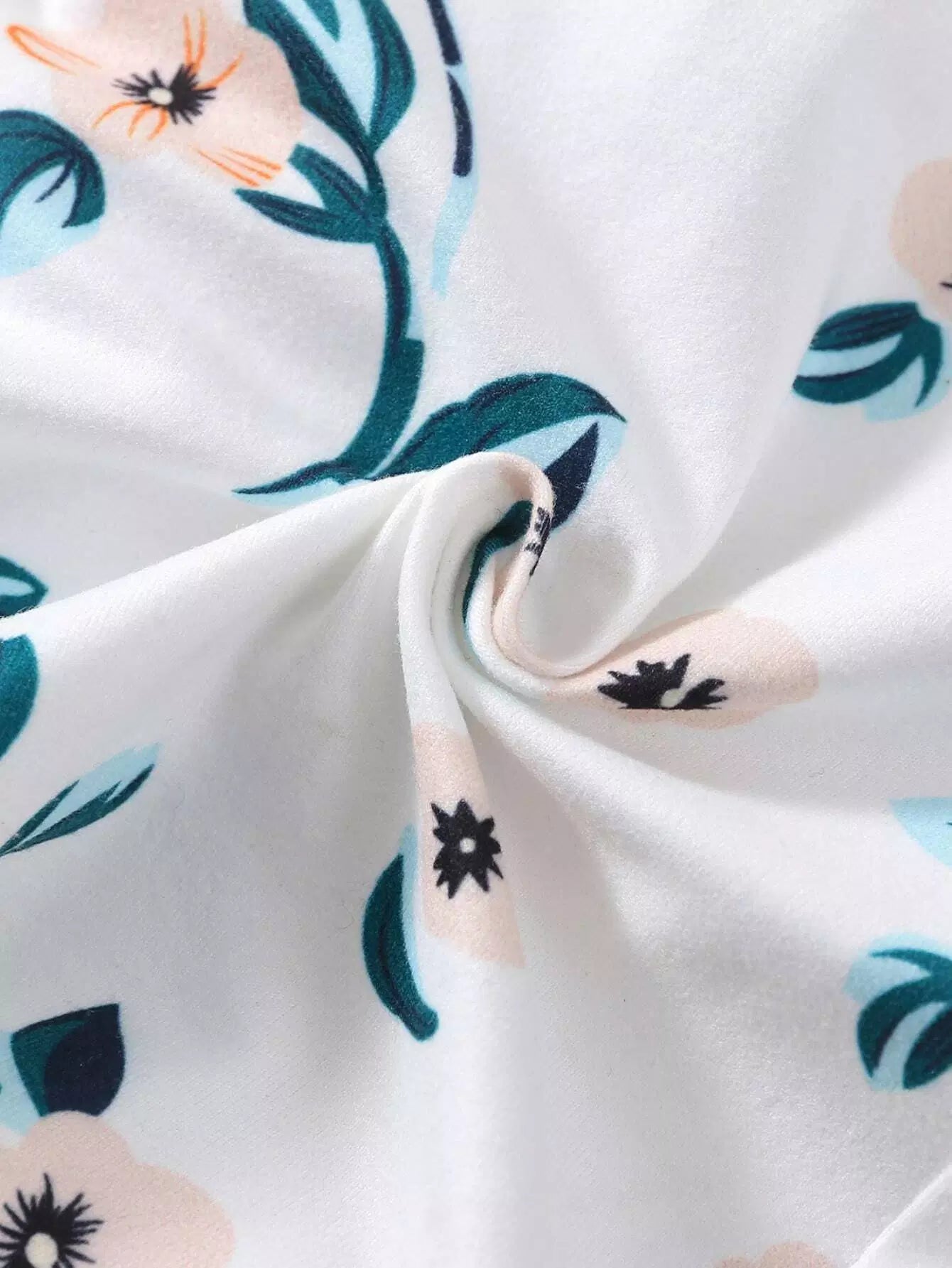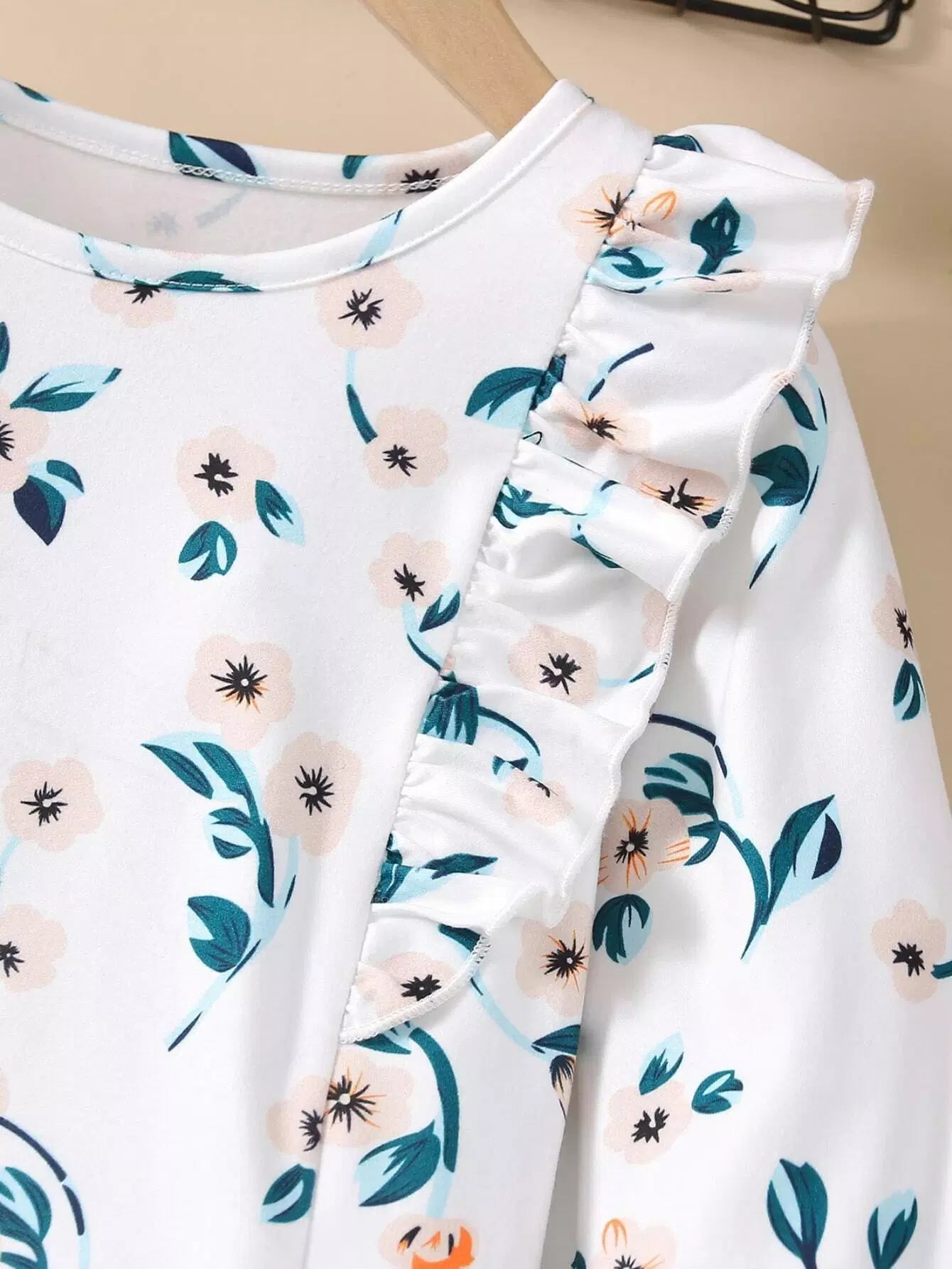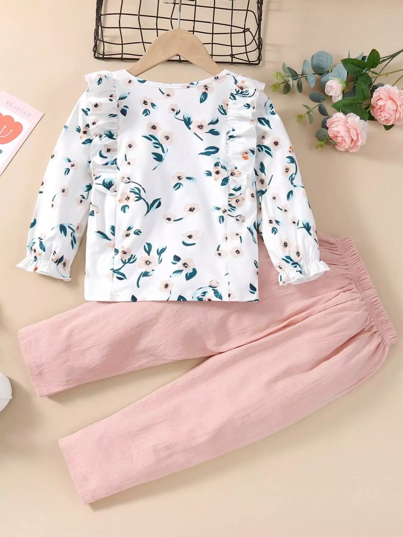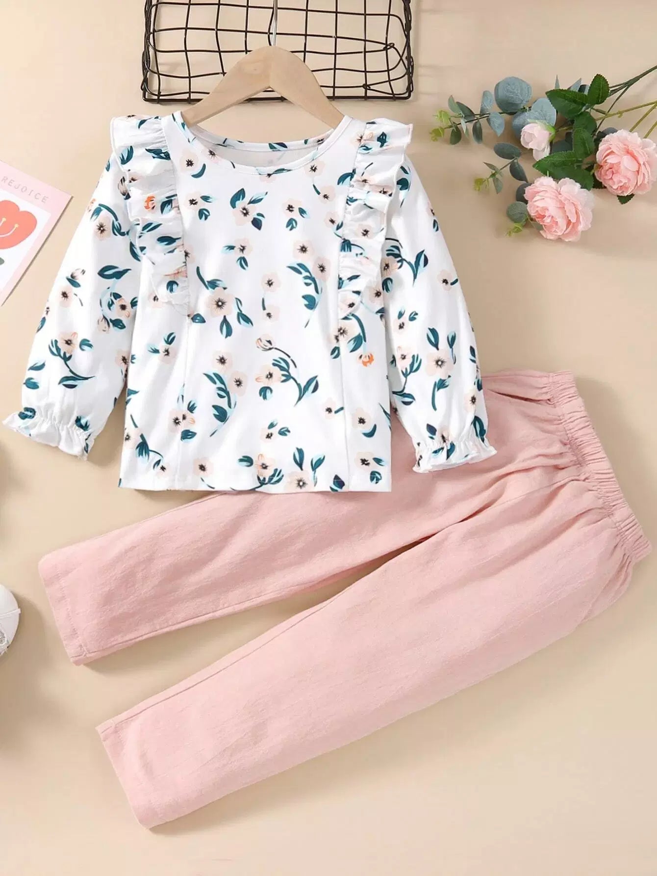 Toddler Girls Floral Print Ruffle Trim Flounce Sleeve Tee & Solid Pants